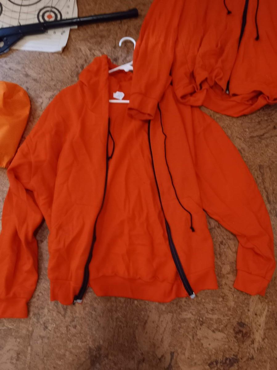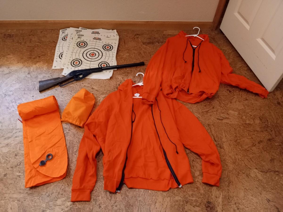 LOT 352  DAISY BB GUN, PAPER TARGETS, ORANGE SWEATSHIRTS AND INFLATABLE SLEEP PAD  (HD)