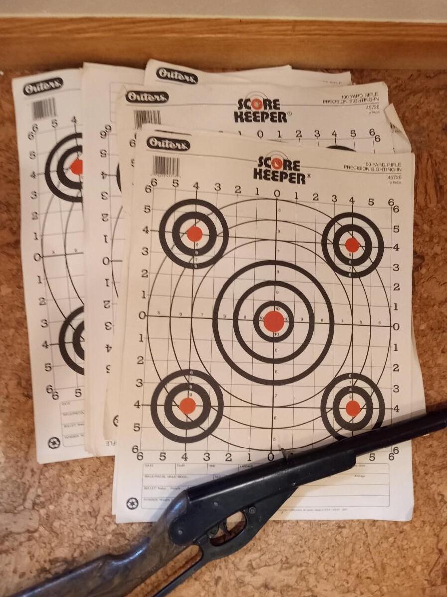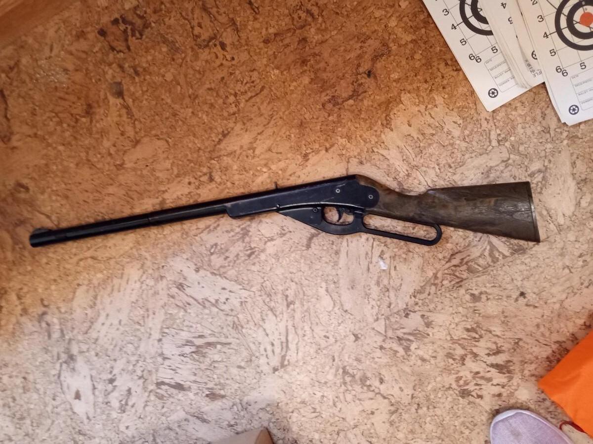 LOT 352 DAISY BB GUN, PAPER TARGETS, ORANGE SWEATSHIRTS AND INFLATABLE SLEEP PAD (HD)
