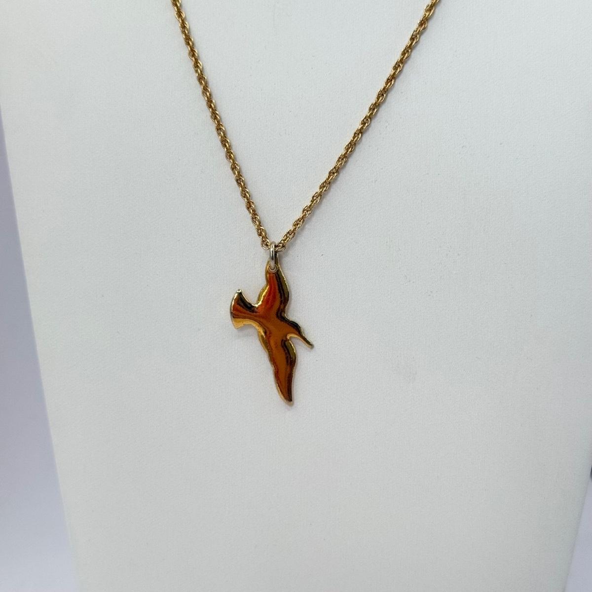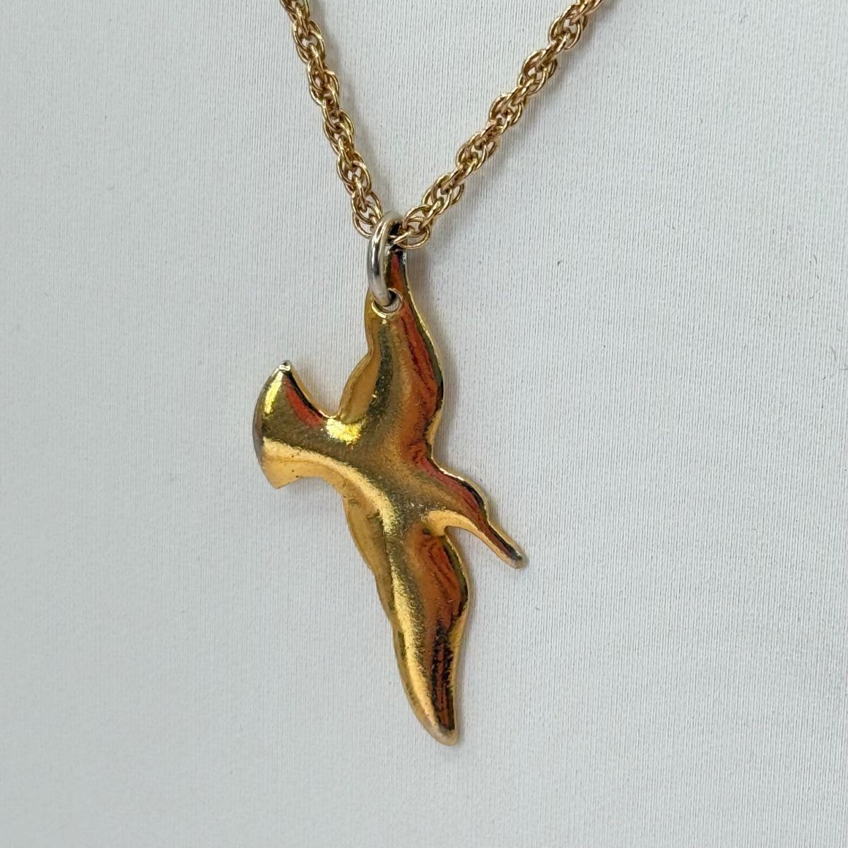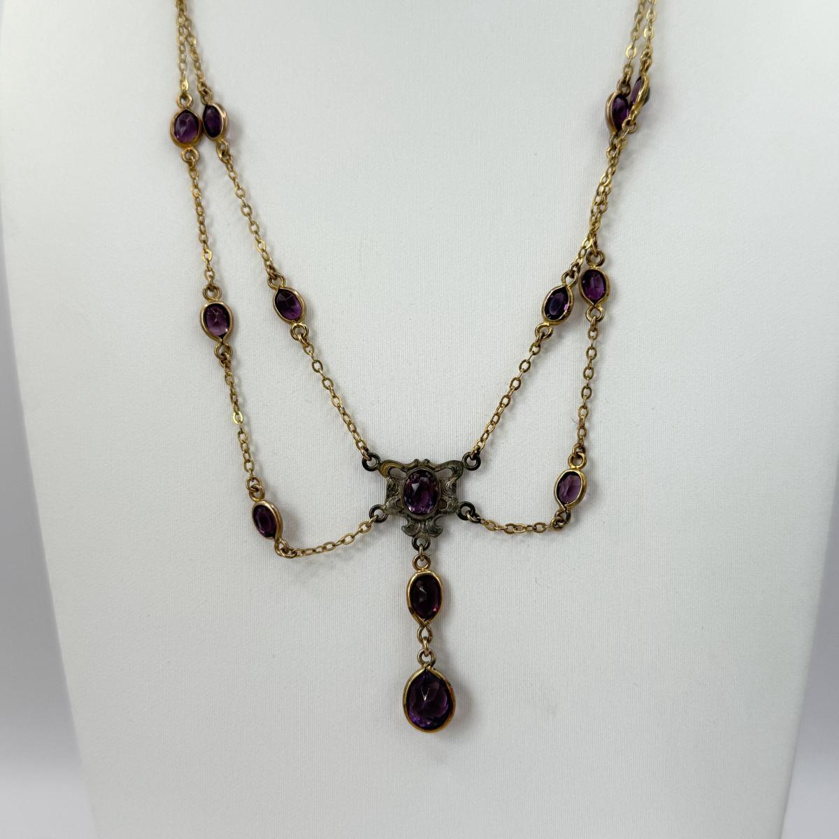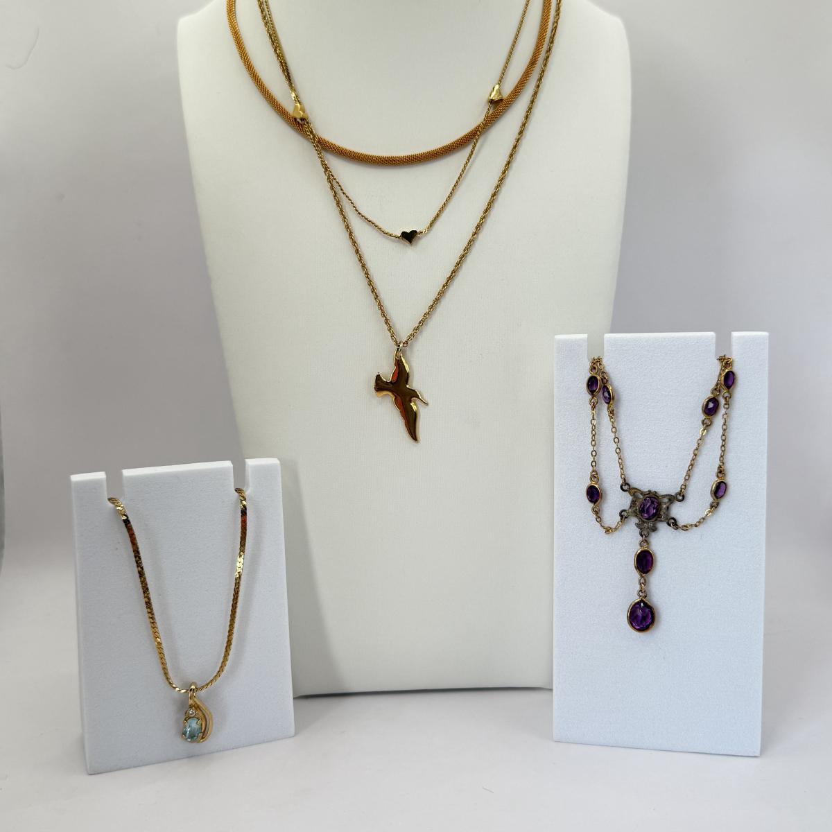 LOT 352J: 17” Victorian Style Faux Glass Amethyst Necklace, 15” Mesh Gold Tone Chain, 16” Trifari Graduated Heart Necklace, 15” Gold Tone Monet Chain w/ Pendant & 18” Seagull Necklace