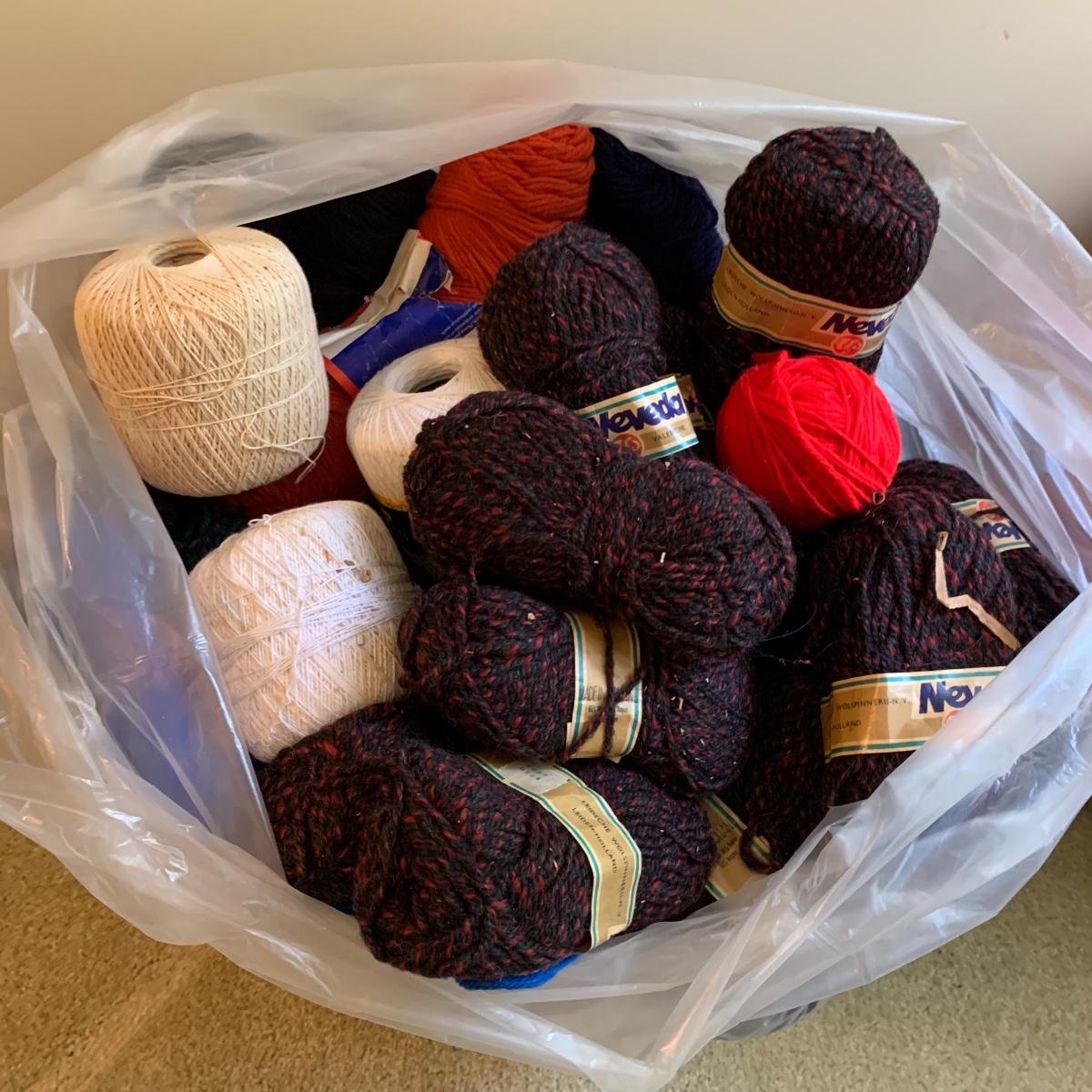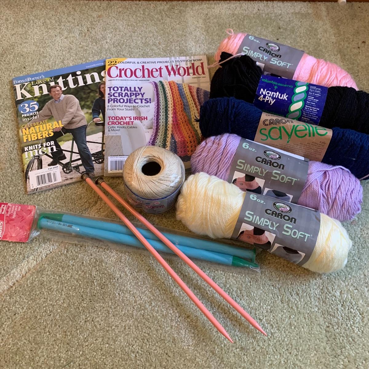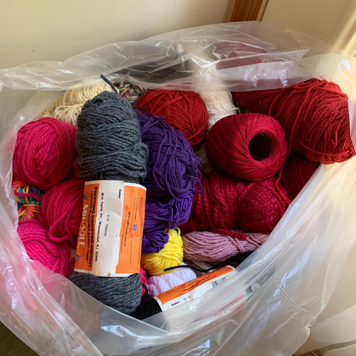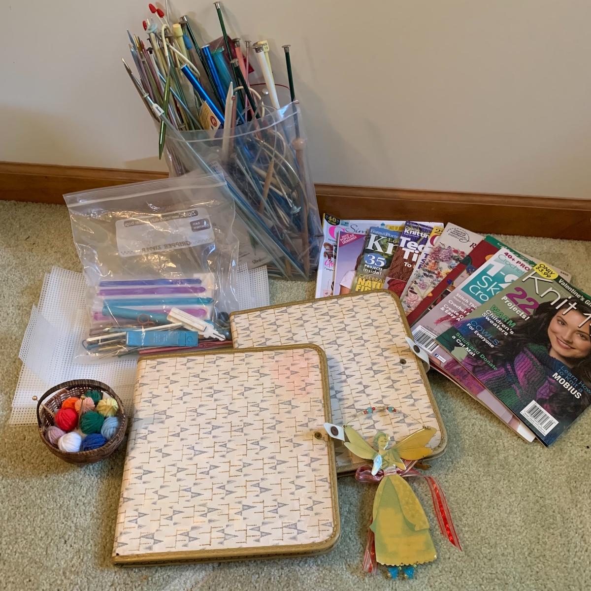 This lot is a knitter’s dream! There are two large bags full of skeins of yarn of all different colors, textures, and weights. Many are new skeins with their labels still on, and some have been used. There is a bag full of five started projects of scarves, sweaters, & more. There are ten crocheting, knitting, and other craft-themed magazines, as well as a huge ziplock bag full of all sorts of knitting needles and crochet hooks, (made from metal, plastic, and wood) as well as some other miscellaneous supplies. There are a couple knitting themed decorations as well, a little basket with yarn and a knitting fairy whose wing has broken off but can be fixed with glue to be like new. Local pickup only.