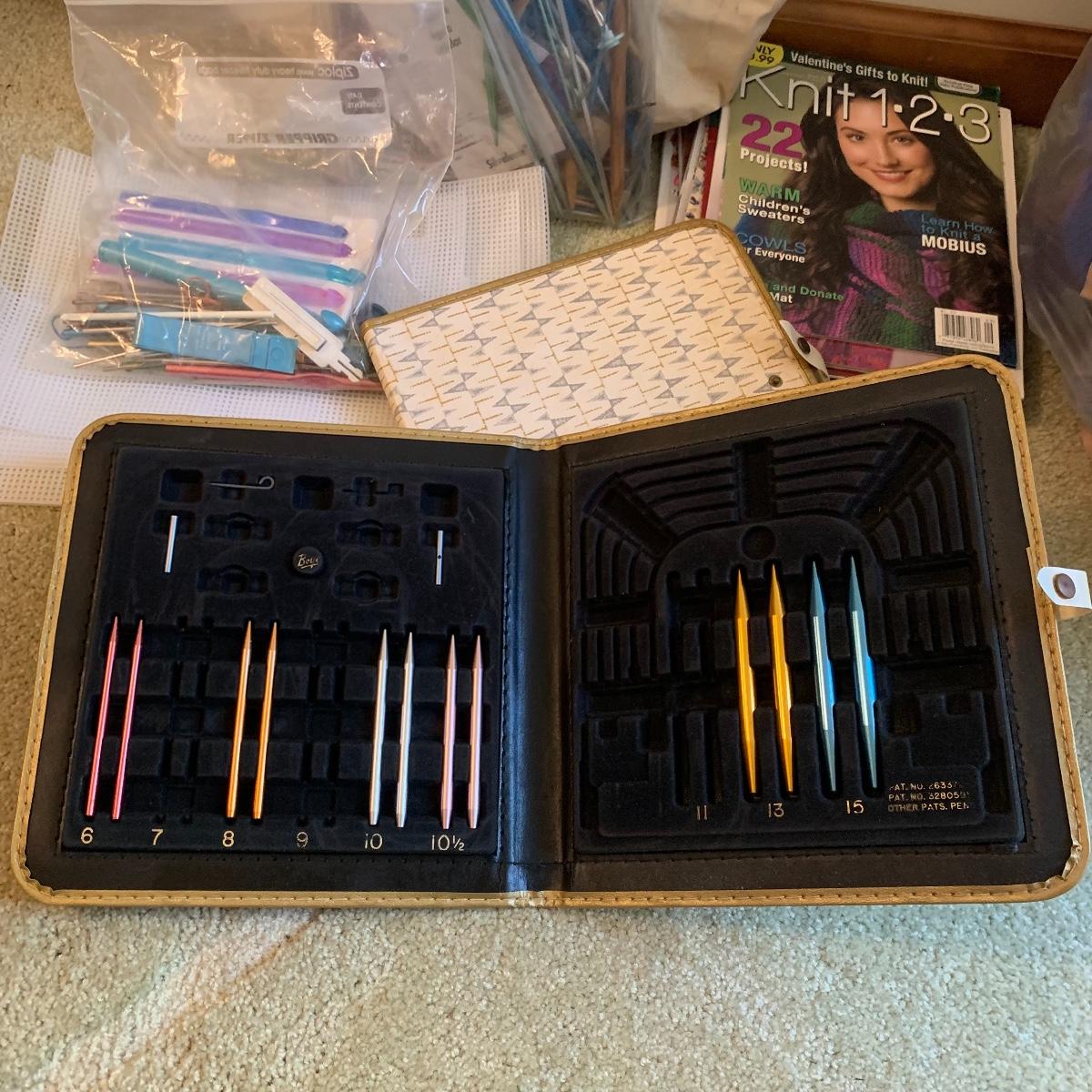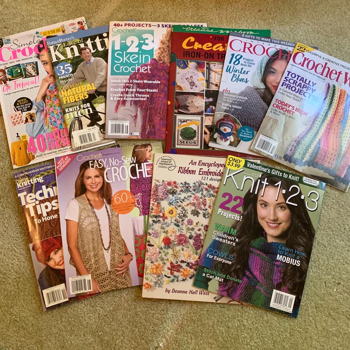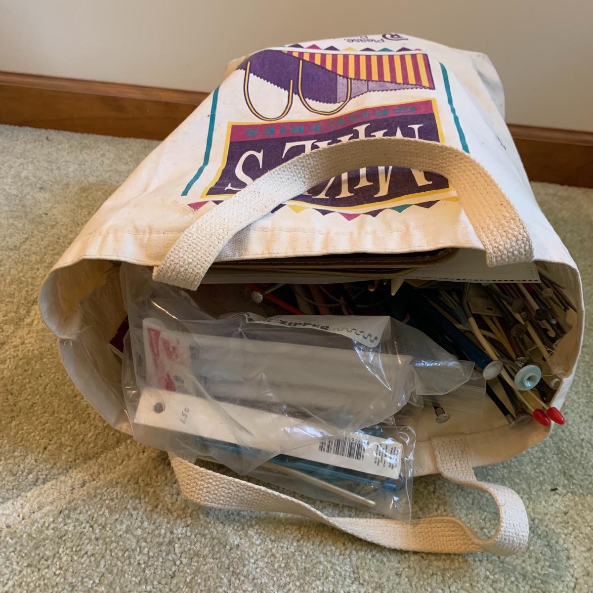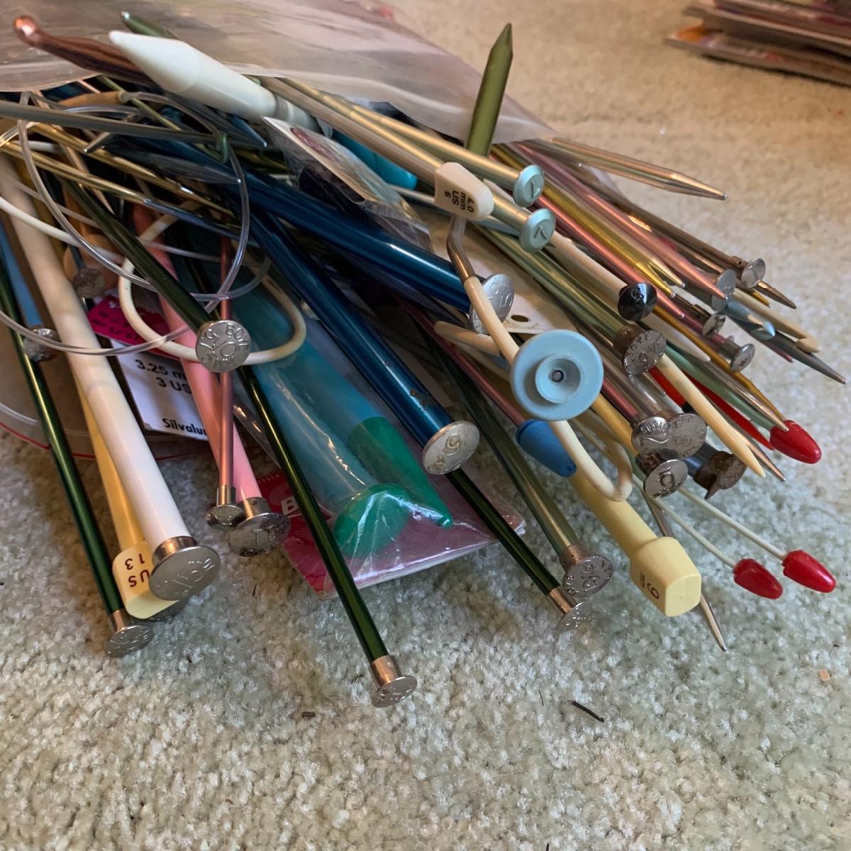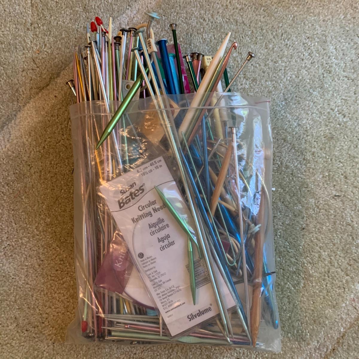 This lot is a knitter’s dream! There are two large bags full of skeins of yarn of all different colors, textures, and weights. Many are new skeins with their labels still on, and some have been used. There is a bag full of five started projects of scarves, sweaters, & more. There are ten crocheting, knitting, and other craft-themed magazines, as well as a huge ziplock bag full of all sorts of knitting needles and crochet hooks, (made from metal, plastic, and wood) as well as some other miscellaneous supplies. There are a couple knitting themed decorations as well, a little basket with yarn and a knitting fairy whose wing has broken off but can be fixed with glue to be like new. Local pickup only.