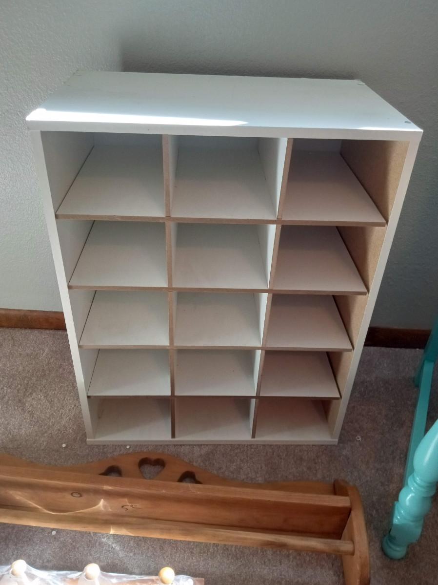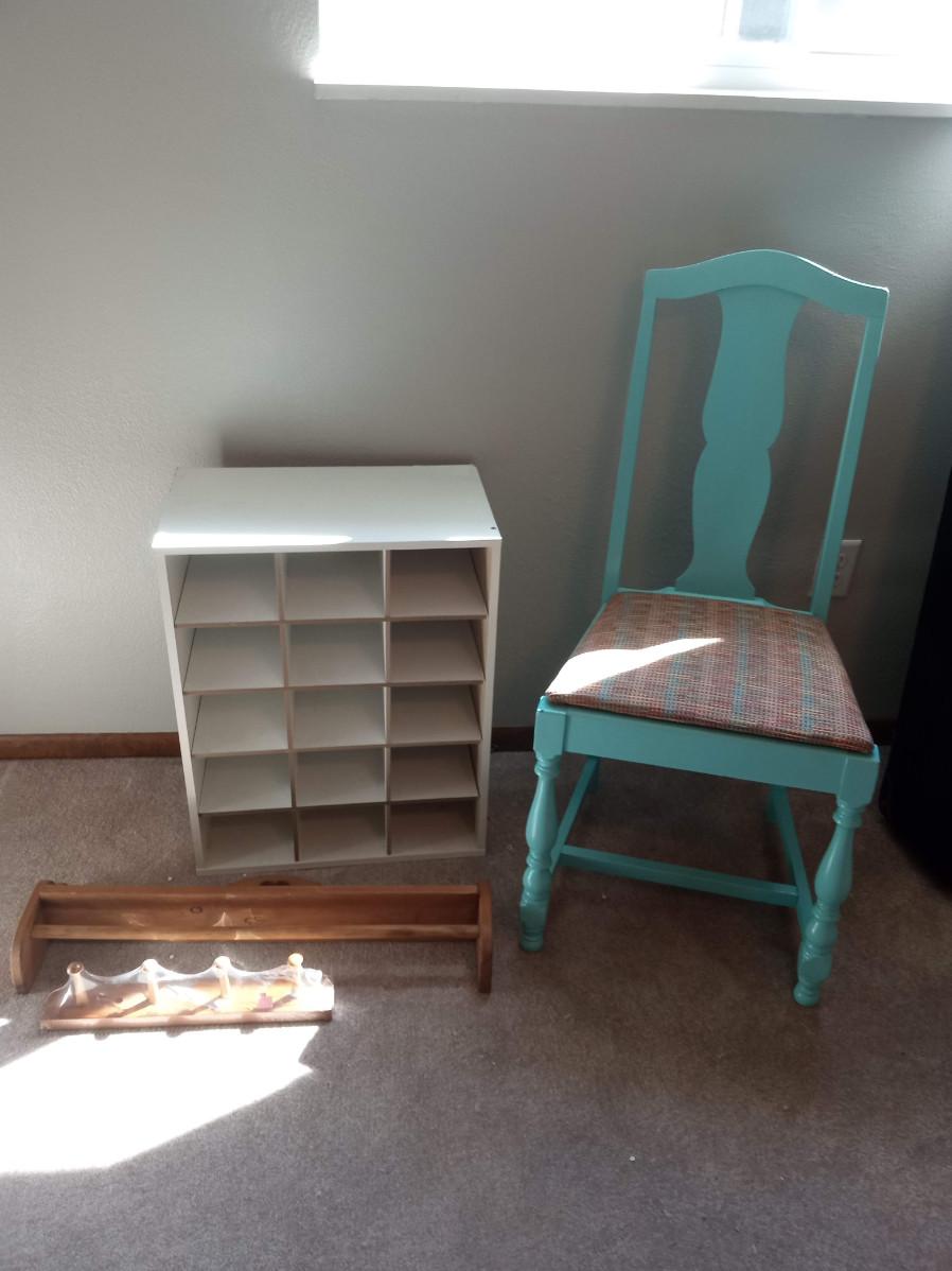 ANTIQUE CHAIR, SHOE RACK AND 2 WALL HUNG WOODEN ITEMS