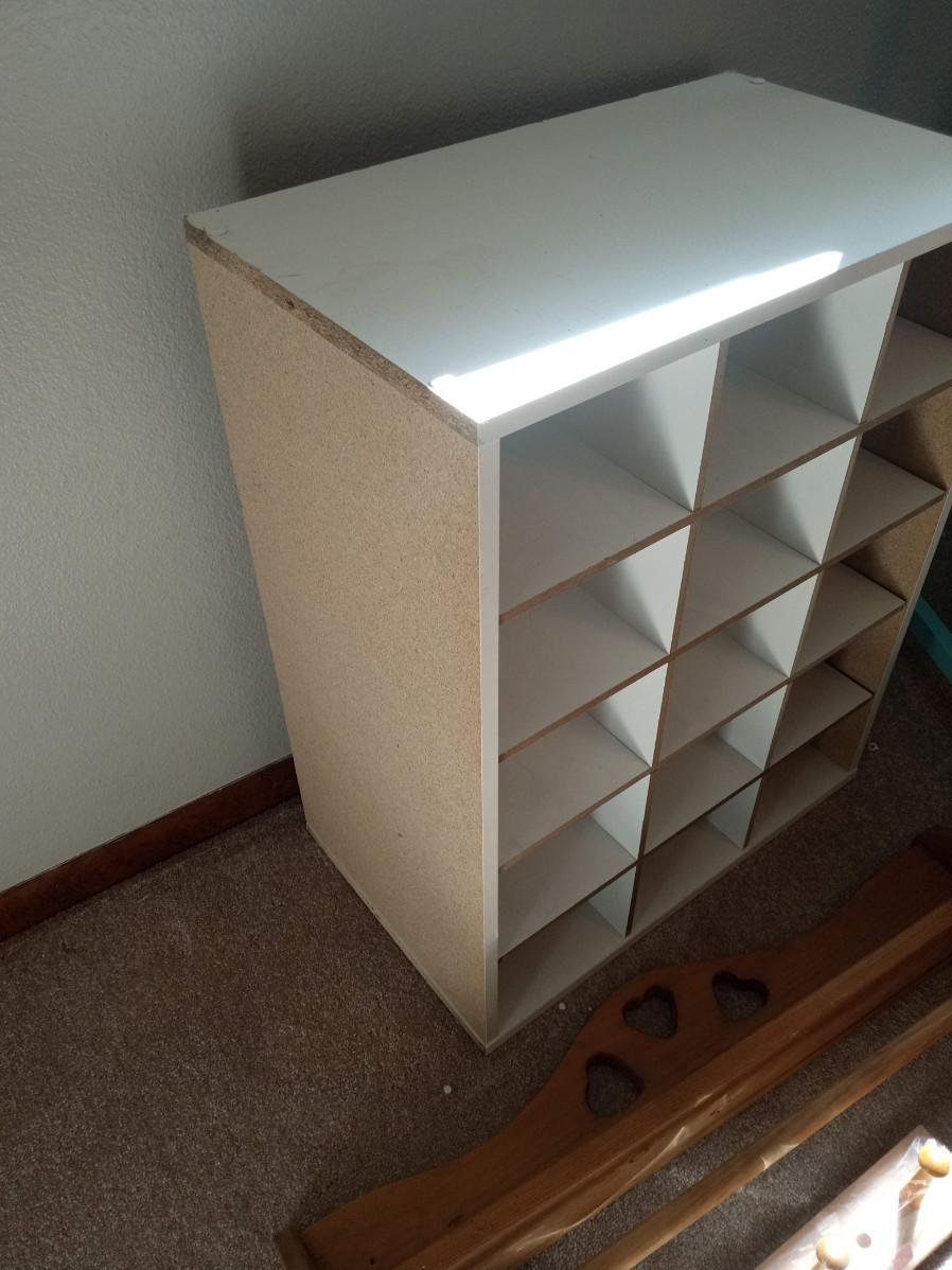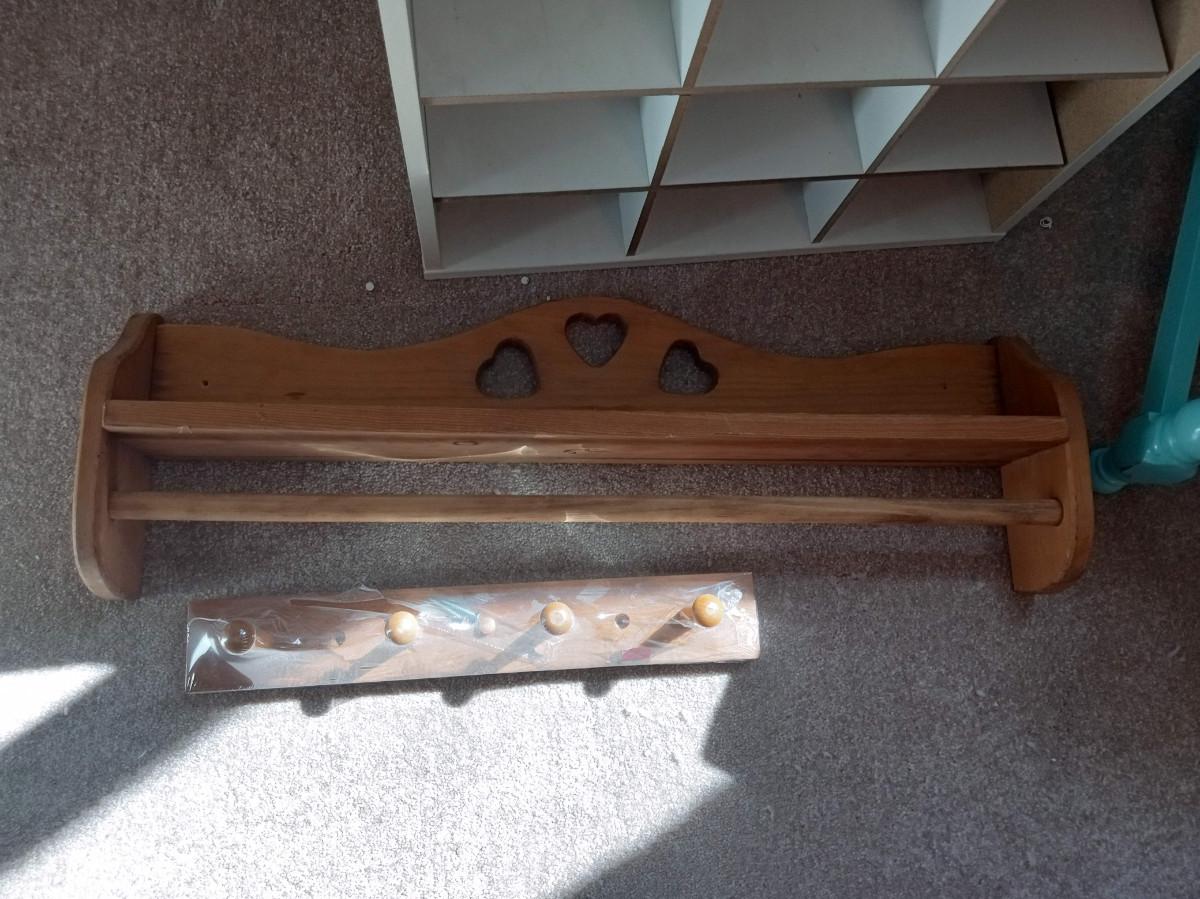 LOT 353 ANTIQUE CHAIR, SHOE RACK AND 2 WALL HUNG WOODEN ITEMS