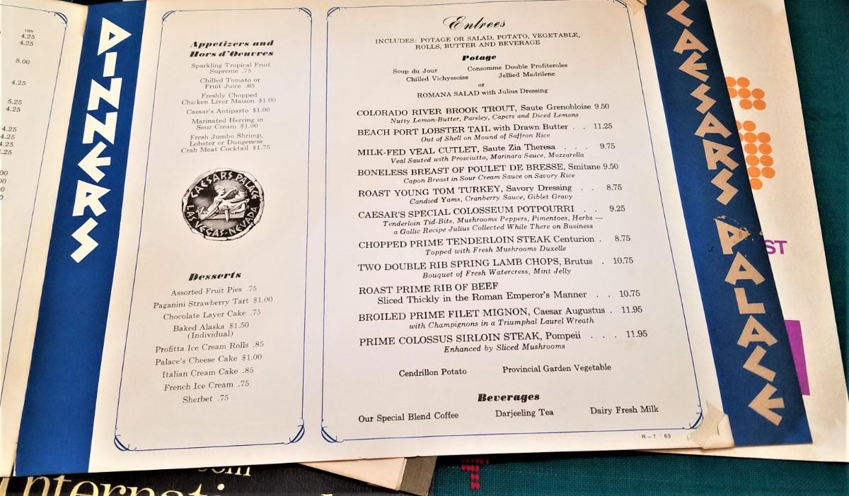 Lot of three vintage Las Vegas Show menus - Caesar's Palace Circus Maximus, the Flamingo Show Room dinner menu, and ELVIS PRESLEY Live at the International Hotel. For scale, the Elvis menu measures 17" x 8.75". That one has been folded in half. Check out the prices! A Deluxe dinner AND the show for less than 30.00!