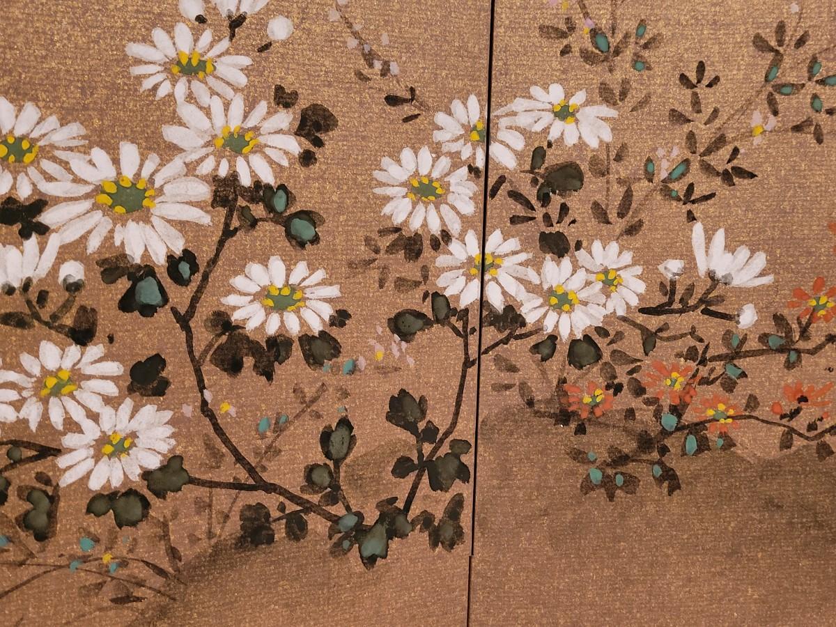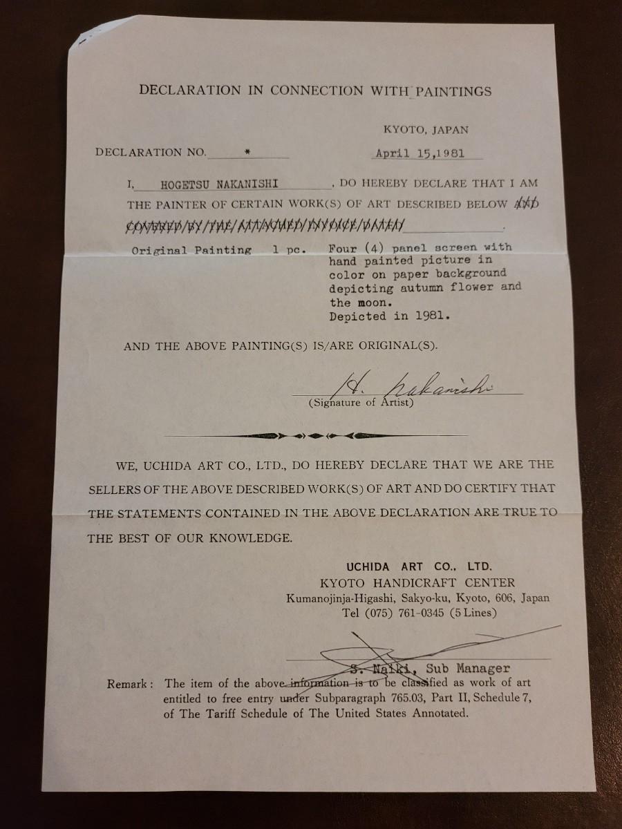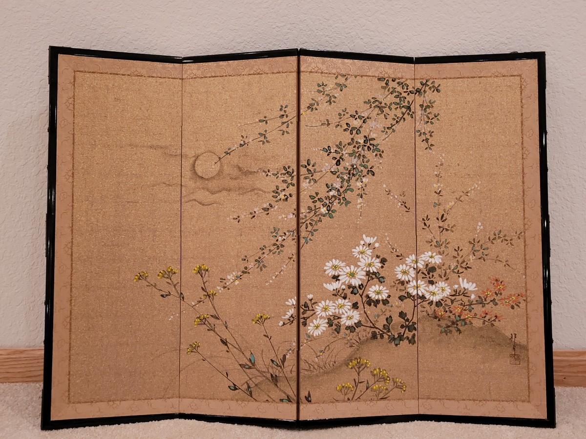 Lot 354: 4 Panel Painted Screen Depicting Autumn Flowers & Moon by HOGETSU NAKANISHI with Original Paperwork Clips
