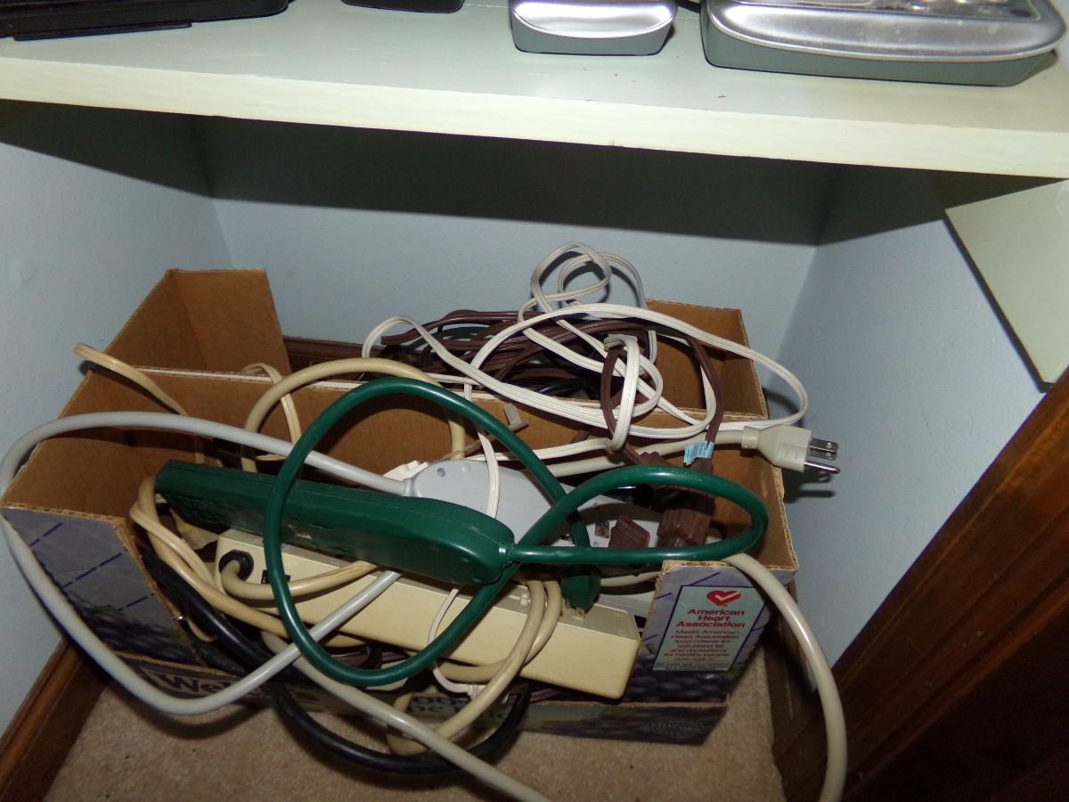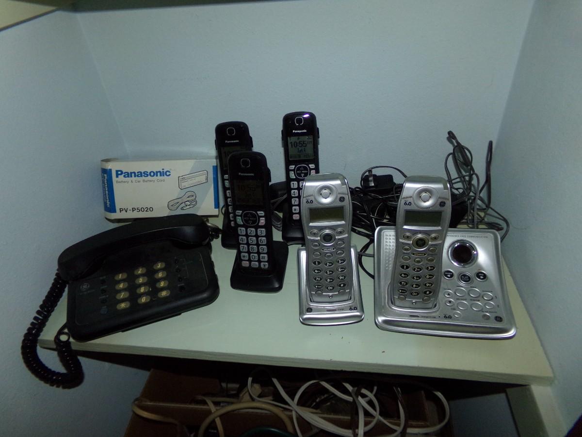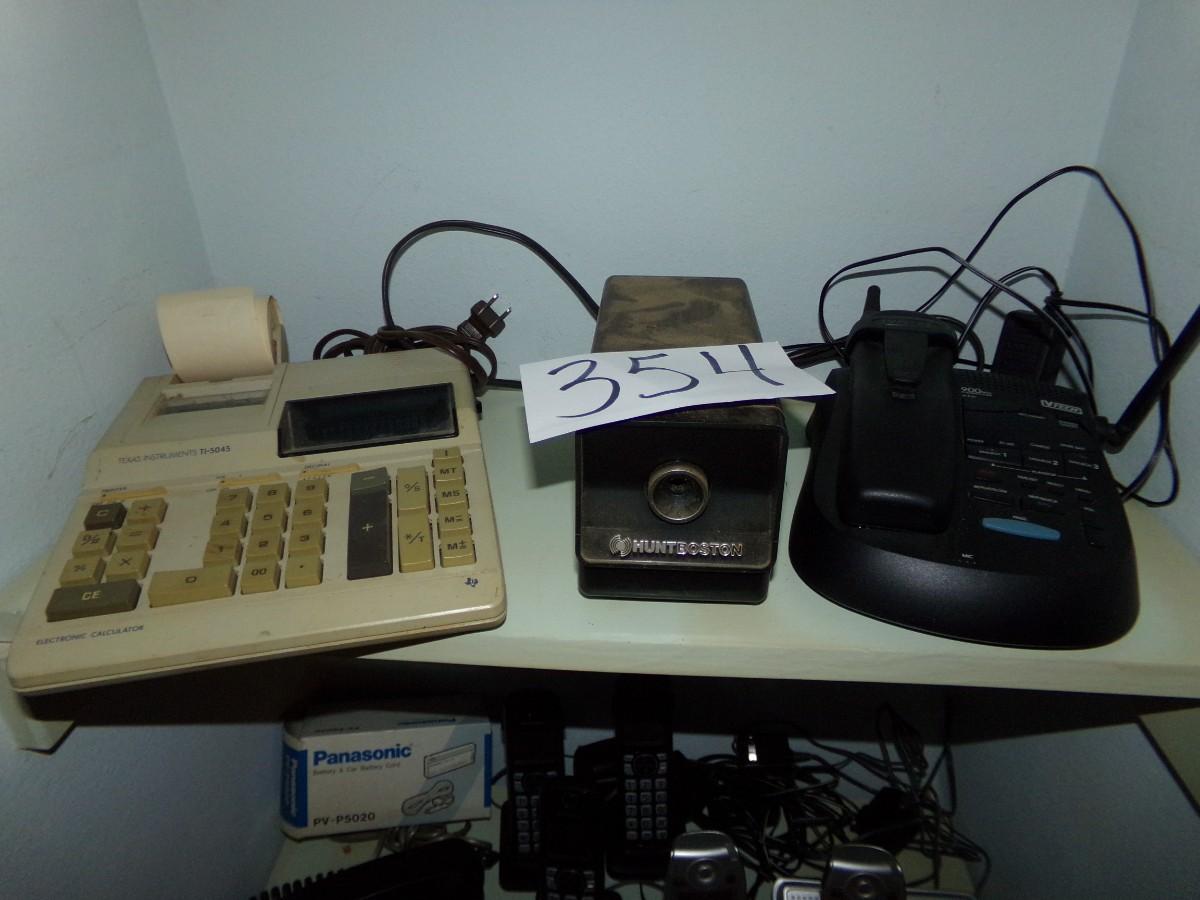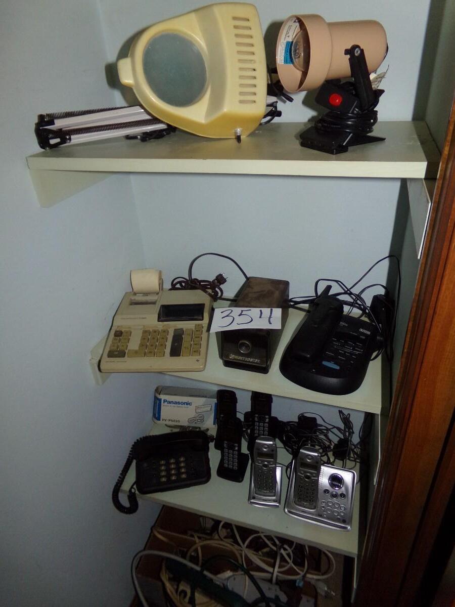 ADDING MACHINE, CORDLESS PHONES WITH ANSWERING MACHINE, LOTS OF CORDS INCLUDING EXTENSION CORDS. CORDED PHONE AND PENCIL SHARPENER. MAGNIFYING LIGHT AND MORE