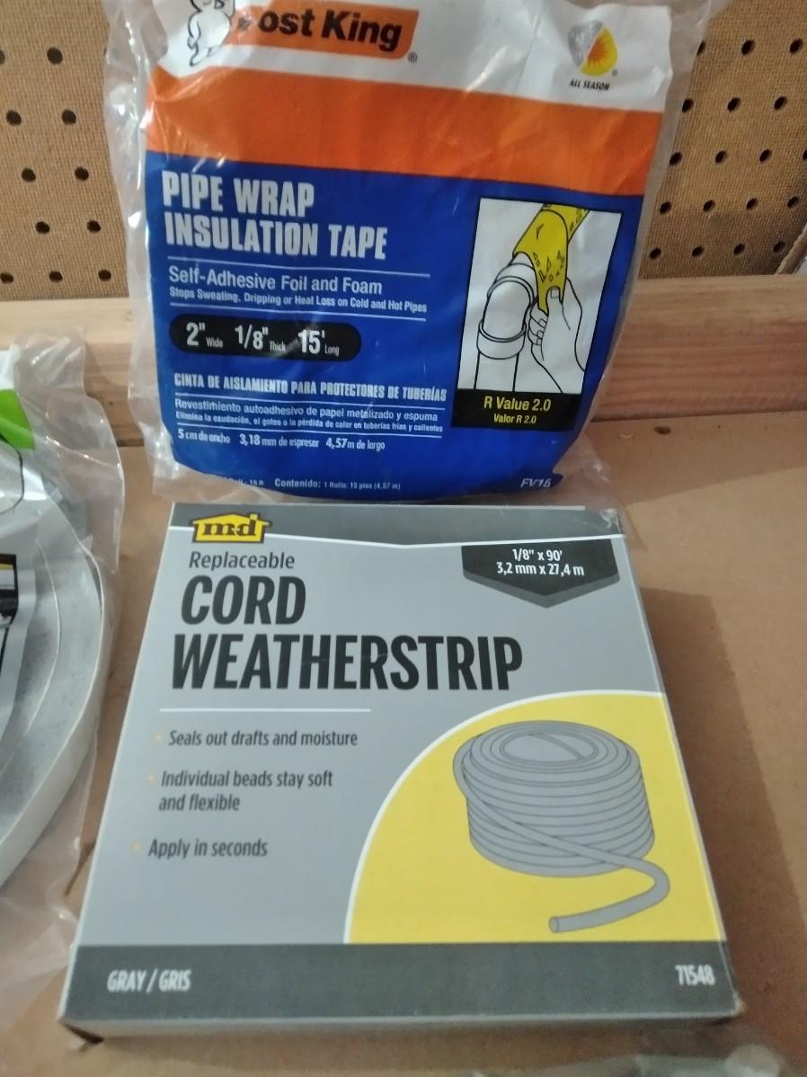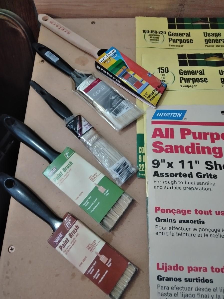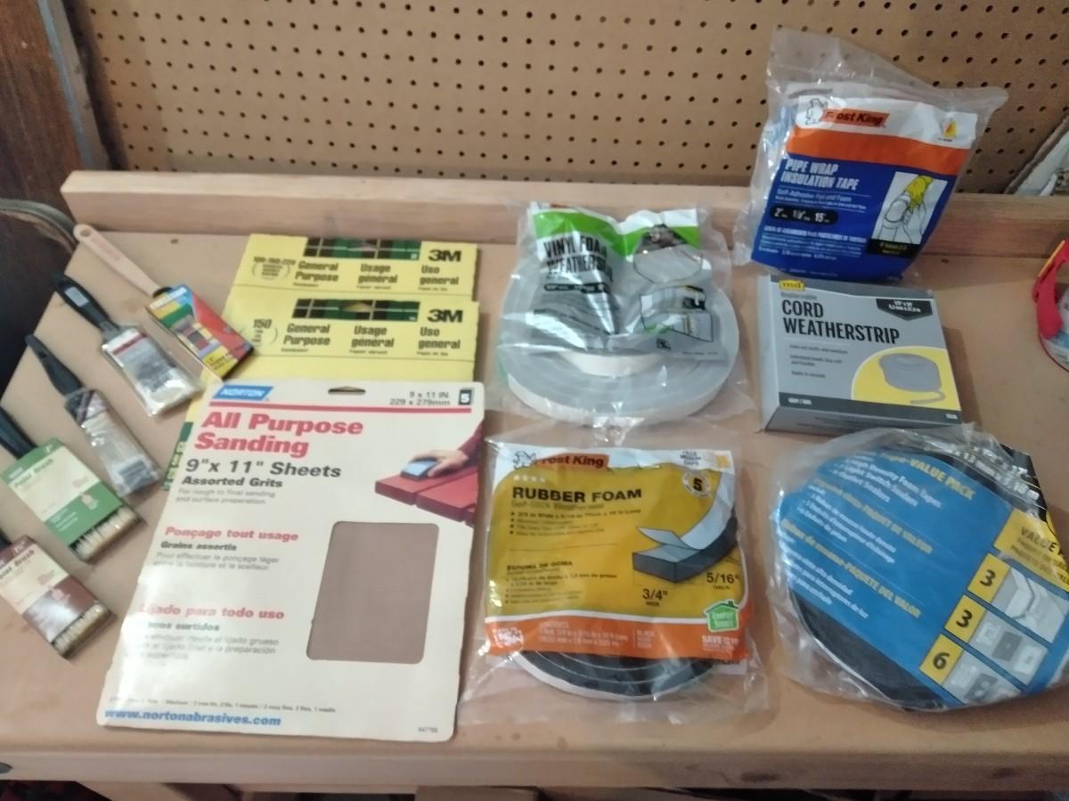 WEATHER STRIPPING, SANDPAPER AND PAINT BRUSHES