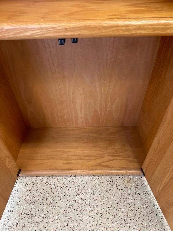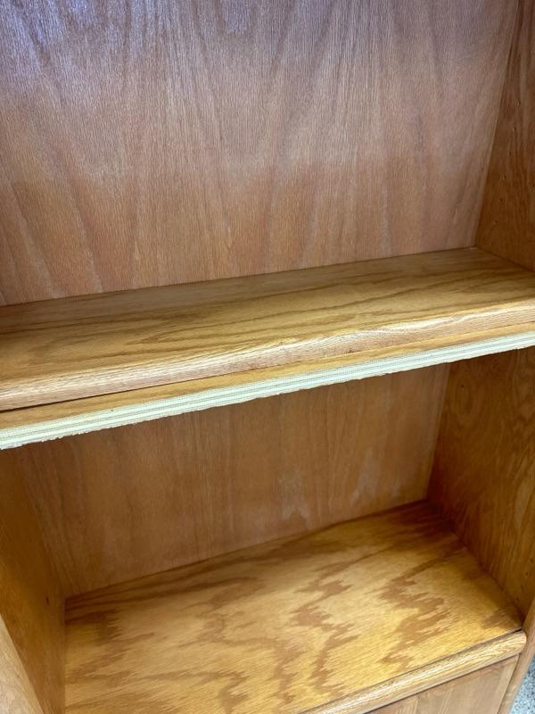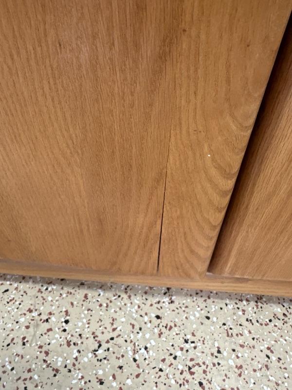 Trim on shelf has fallen off trim on lower left door has split. See photos for details.