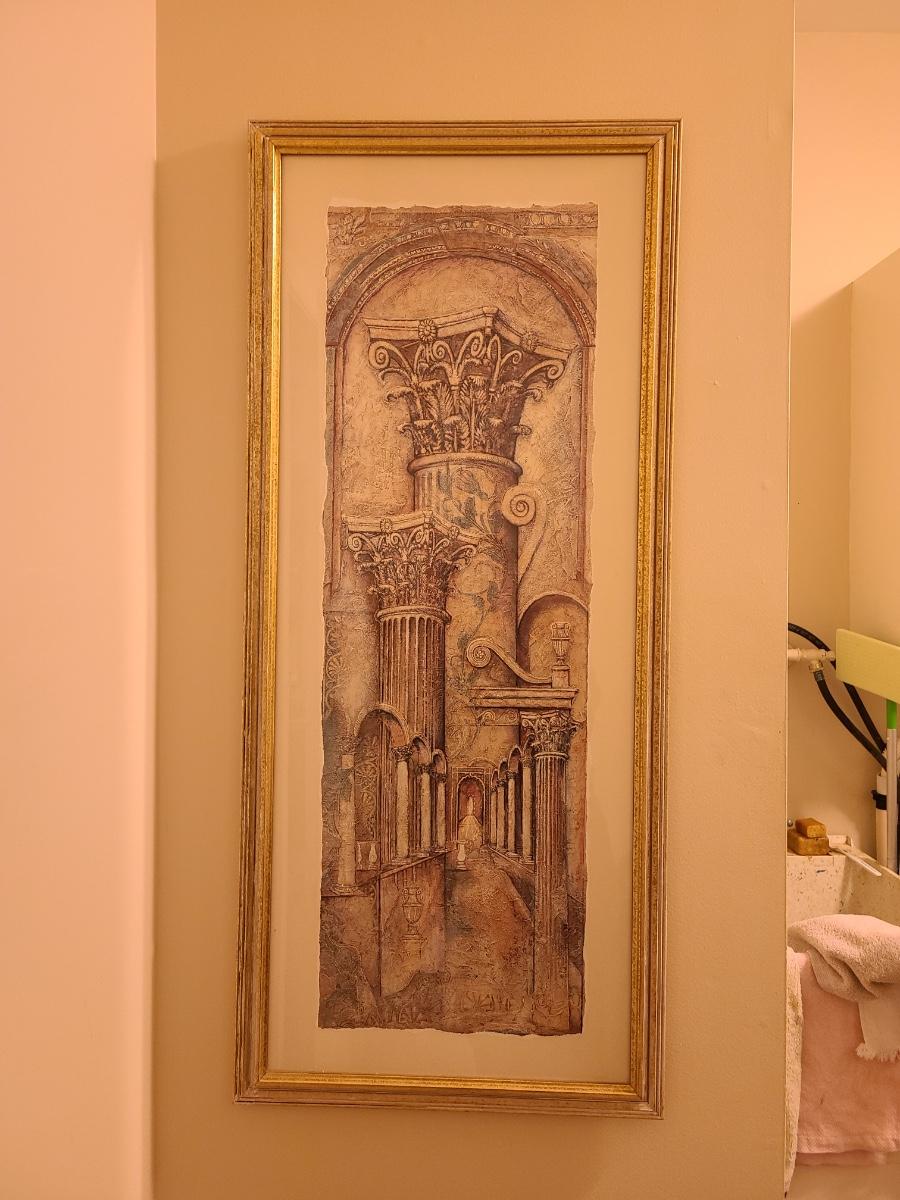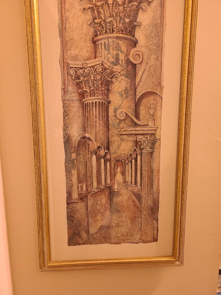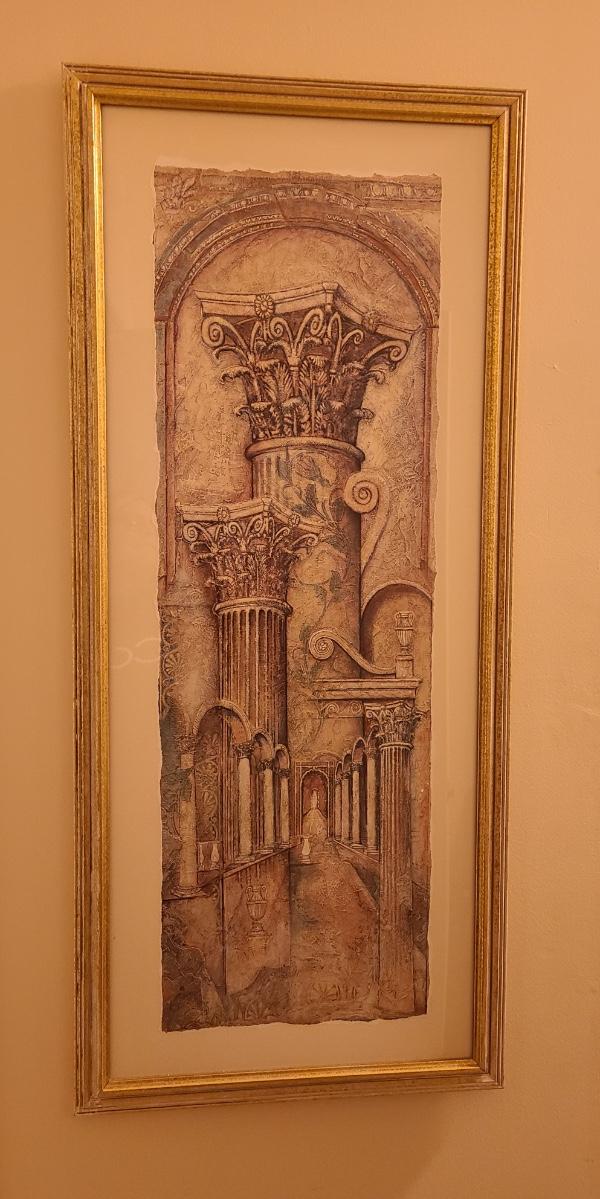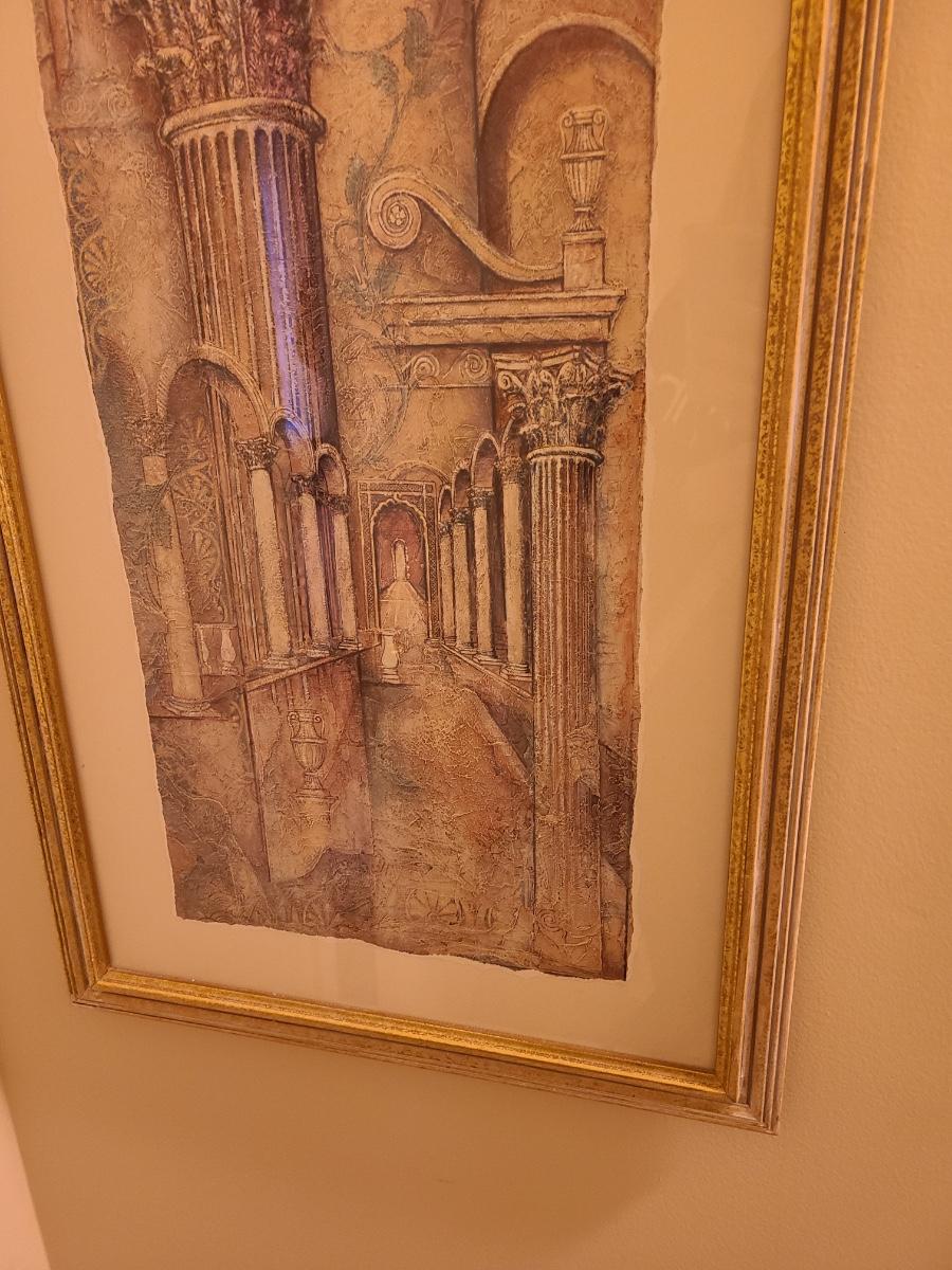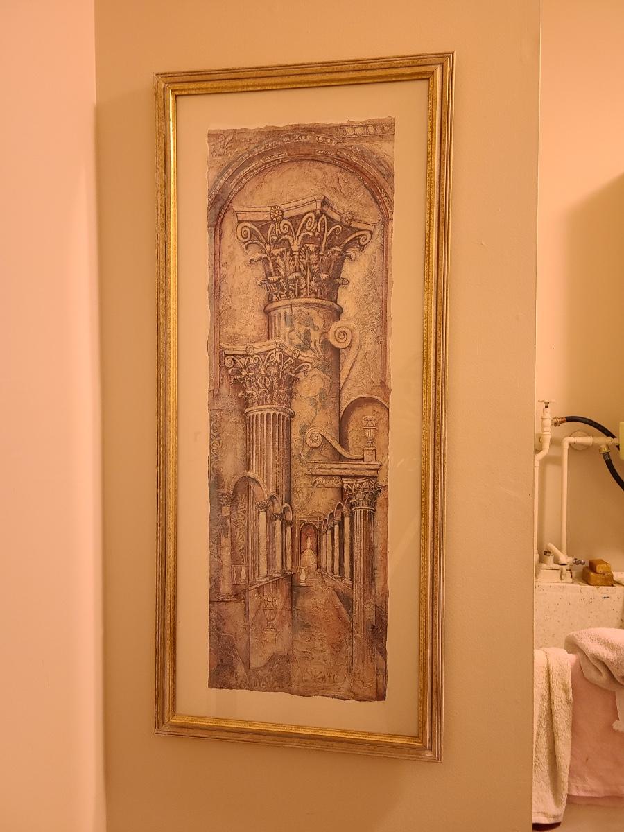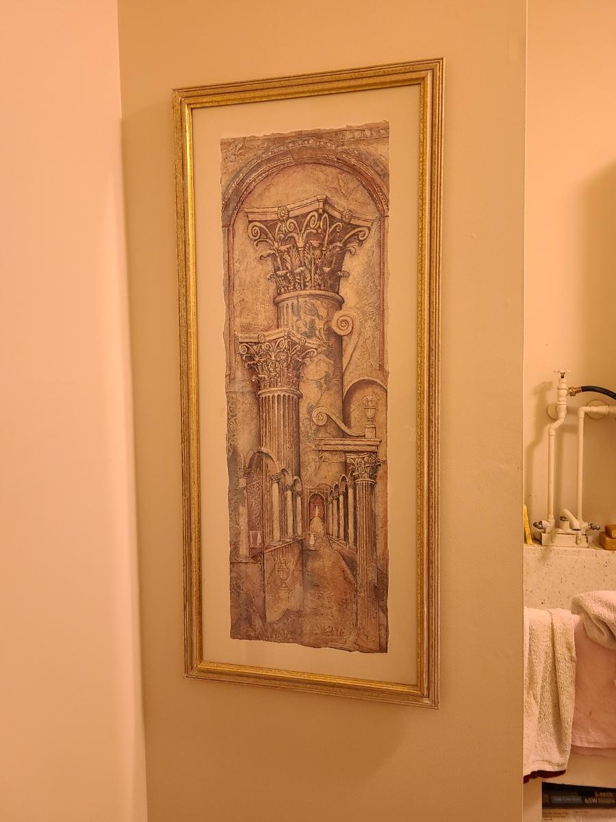 This is a newer modern artwork that is gold framed under glass. There are no measurements for this, but it is around 4 foot tall and a foot and half wide. That is a guesstimate. Please see all pictures as they are the best representation of the items. The pictures show condition, measurements if taken, and what is included in the lot. Due to the large amount that we photograph and the time frame, we are not always able to take measurements. All items unless noted, are pre-owned and have been used. If you purchased furniture, you must bring help. We do not allow one person to carry large furniture out on their own. Bring help, tools and a truck for the safety of our client’s homes, and your personal safety. Company policy. Thank you.