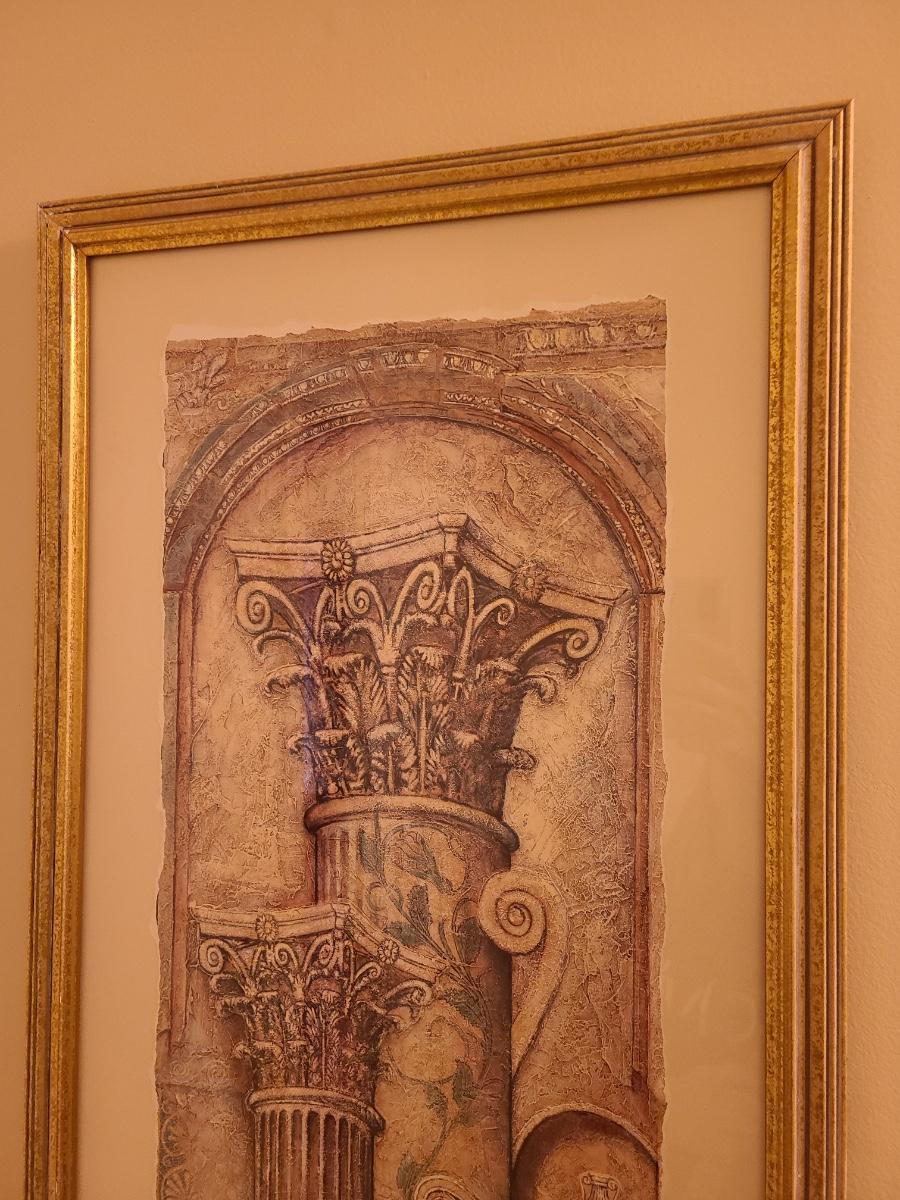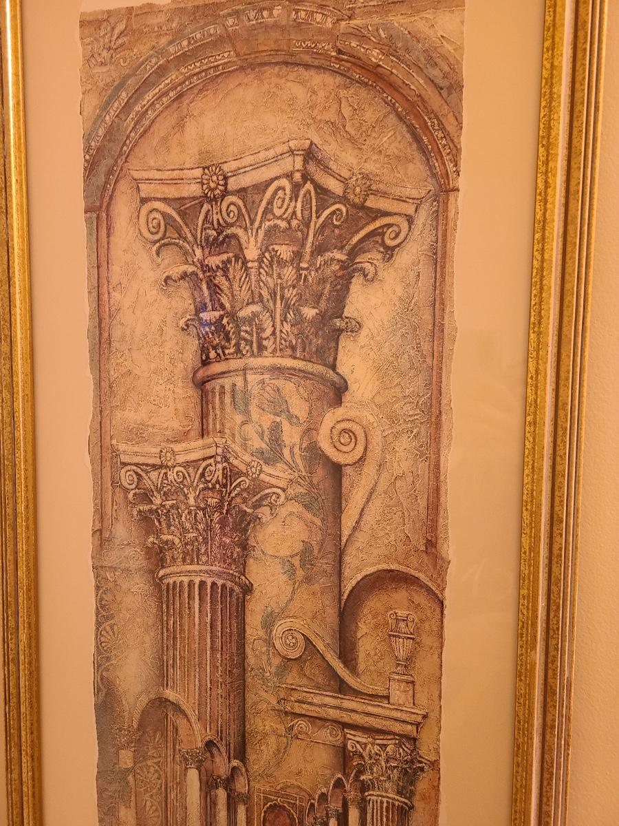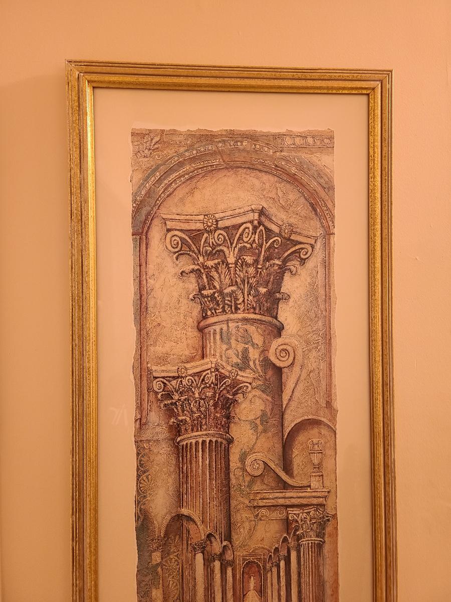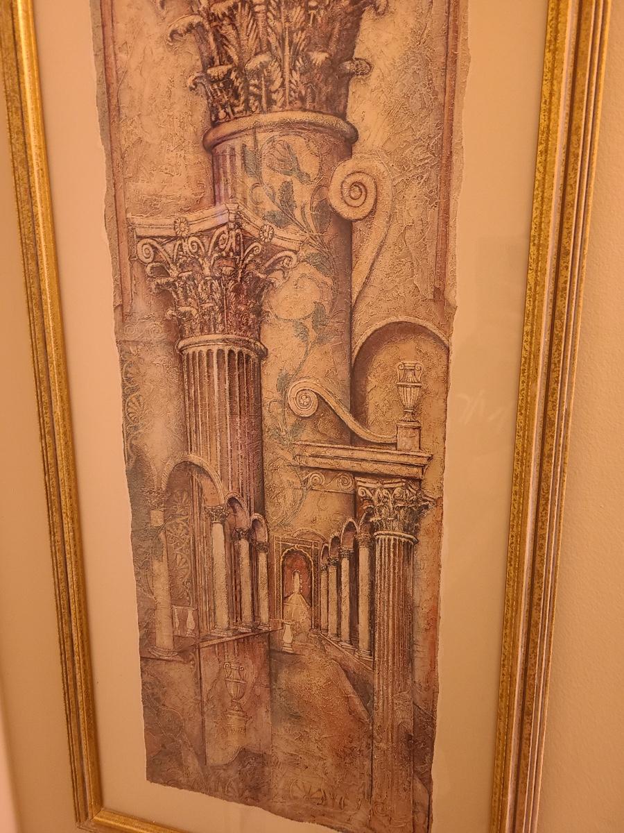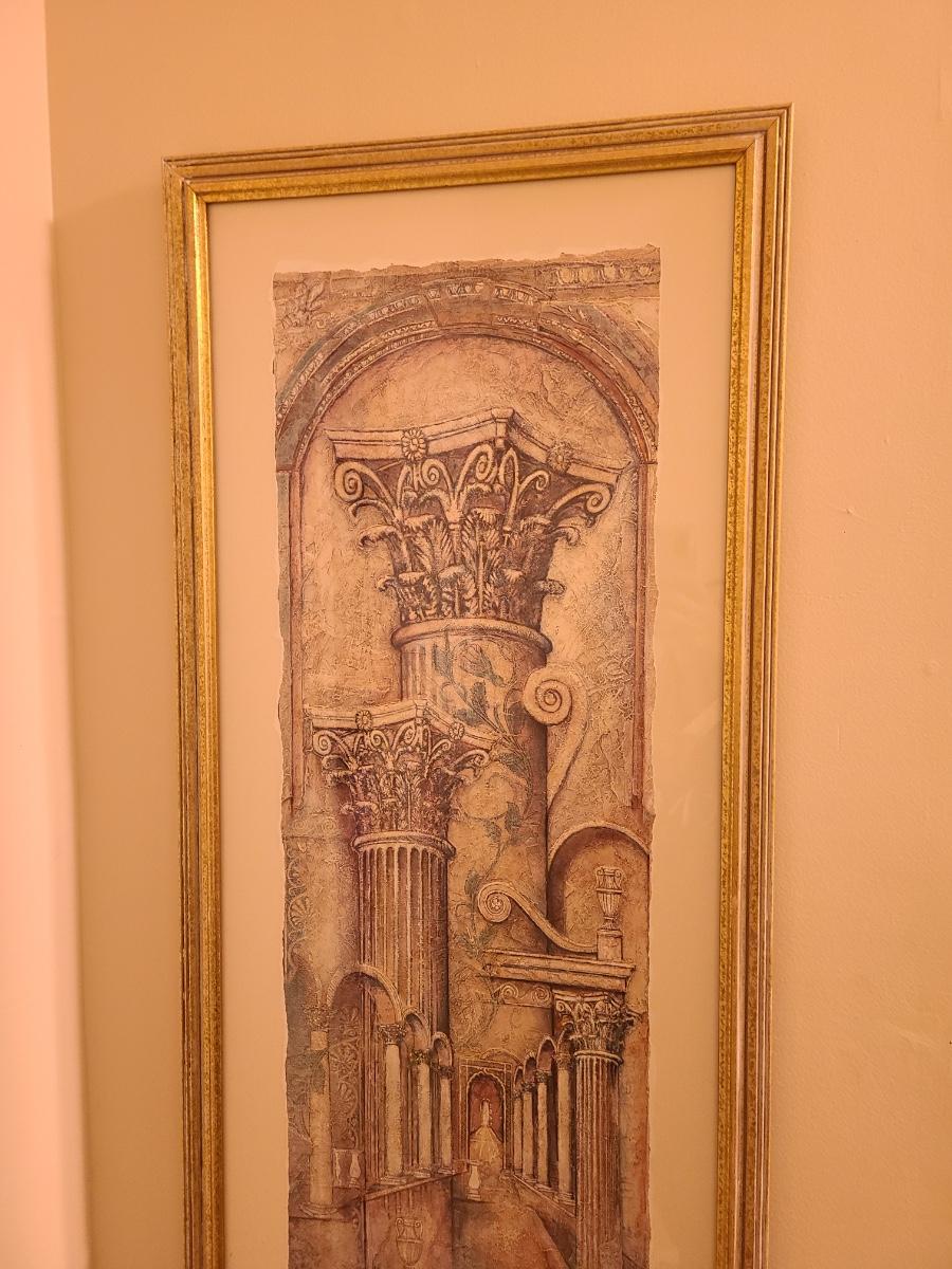 This is a newer modern artwork that is gold framed under glass. There are no measurements for this, but it is around 4 foot tall and a foot and half wide. That is a guesstimate. Please see all pictures as they are the best representation of the items. The pictures show condition, measurements if taken, and what is included in the lot. Due to the large amount that we photograph and the time frame, we are not always able to take measurements. All items unless noted, are pre-owned and have been used. If you purchased furniture, you must bring help. We do not allow one person to carry large furniture out on their own. Bring help, tools and a truck for the safety of our client’s homes, and your personal safety. Company policy. Thank you.