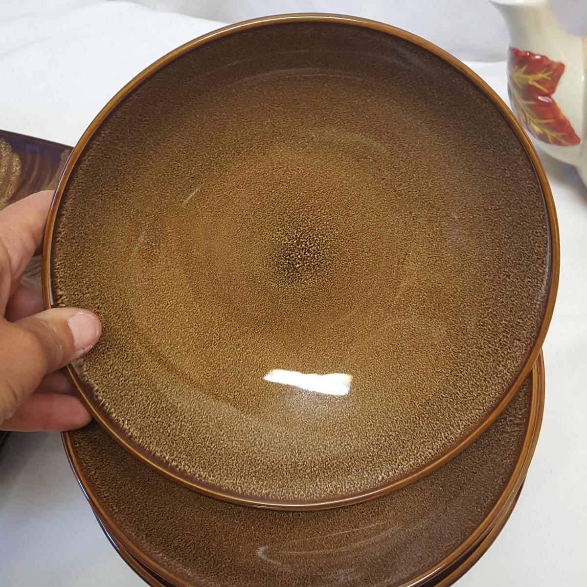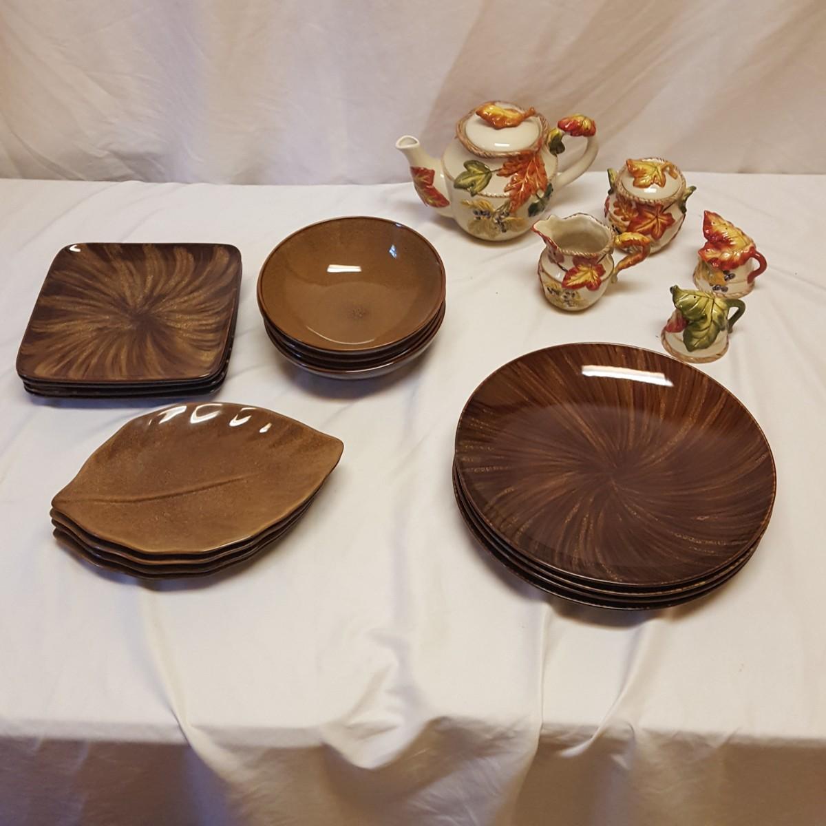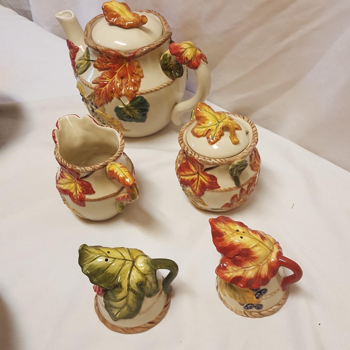This small dining set from Oneida just screams Fall. There are 4 dinner plates that measure 12", 4 bowls that measure 8"x3", 4 salad plates that measure 9'x9" and 4 leaf plates that measure 11"x8". In addition, there is a Fall leaf printed tea pot (10"x7"), a creamer and sugar bowl and the cutest leaf salt and pepper shakers. All items appear to be in great condition. Shipping Available.