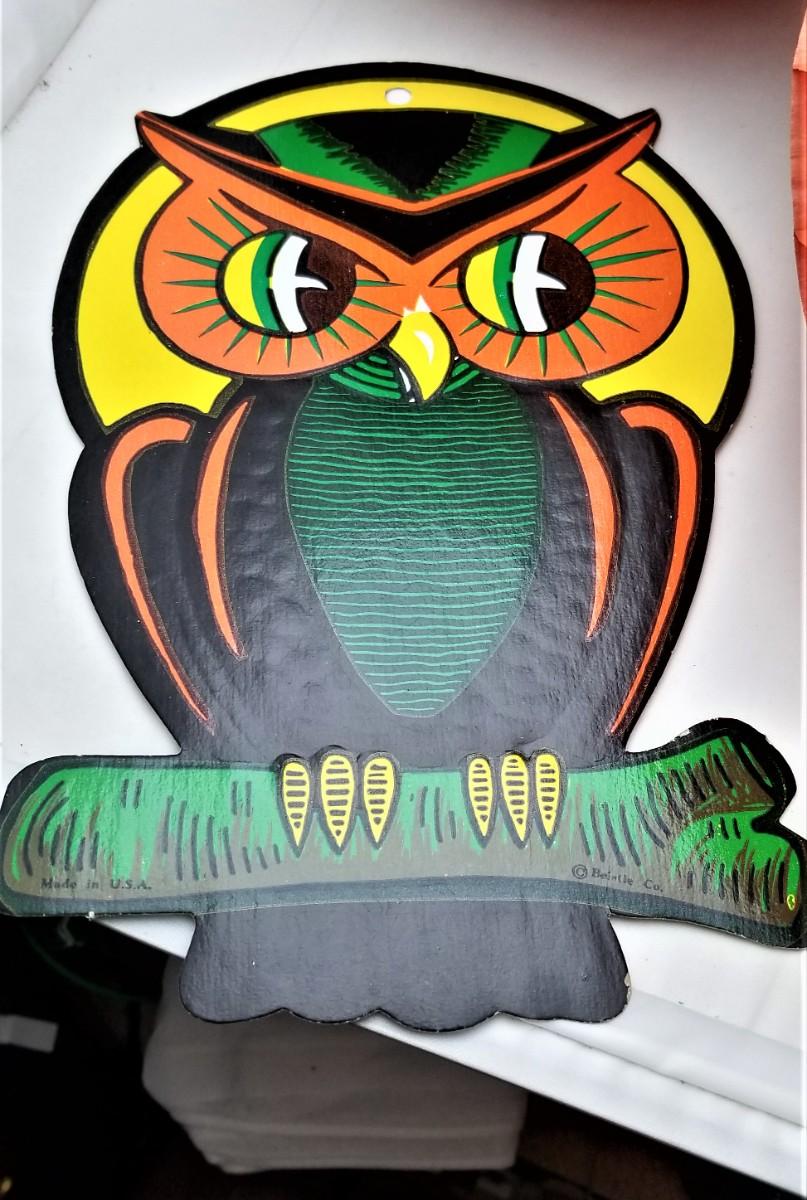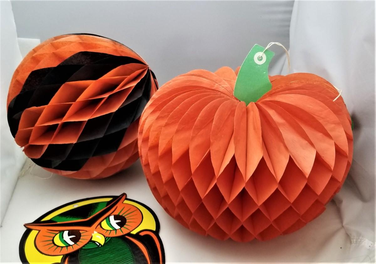Cute vintage Halloween lot - 2 vintage paper honeycomb style decorations - hanging ball (black/orange) - about 8" tall and a pumpkin (about 9" tall). Both will lie flat. There is also a classic Halloween Hoot Owl (embossed cardboard), marked "Beistle." 9.5" tall). Good vintage condition.