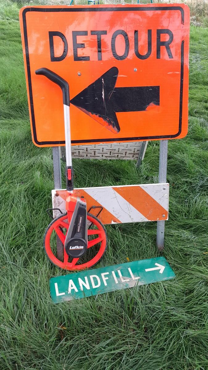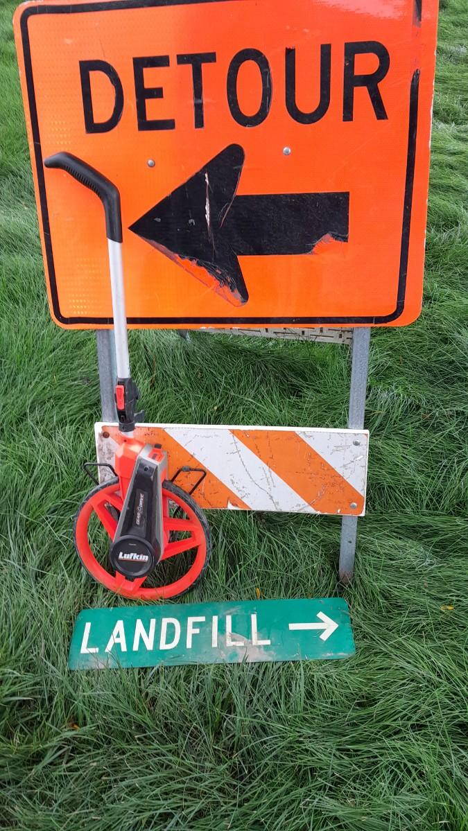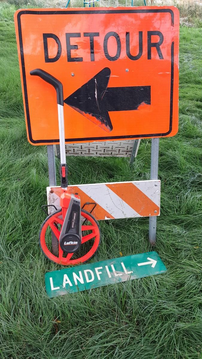 METAL DETOUR SIGN ON STAND, LANDFILL SIGN TO POINT AT THE NEIGHBORS HOUSE? AND A LUFKIN GEAR DRIVE MEASURING WHEEL.