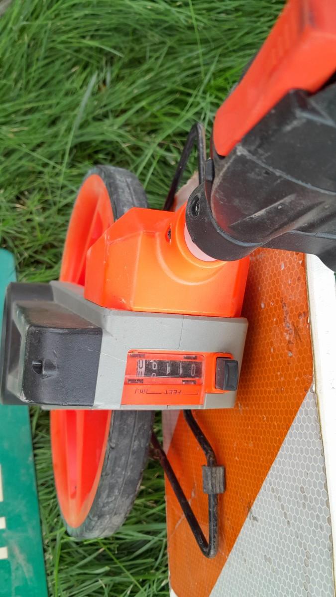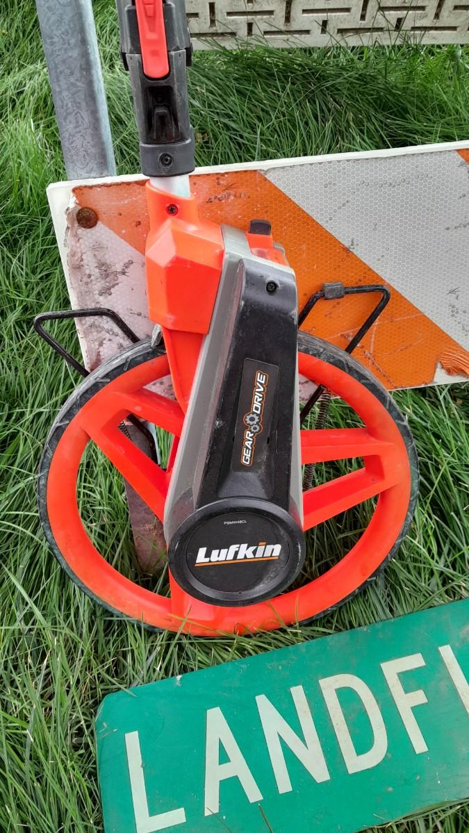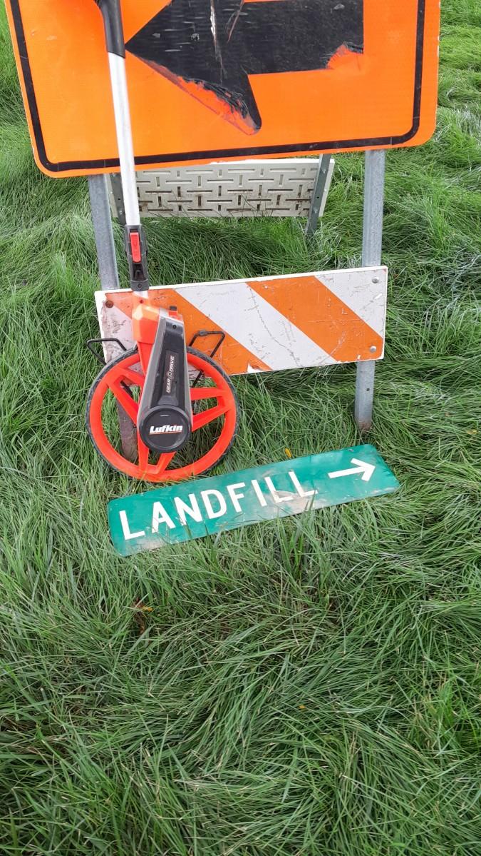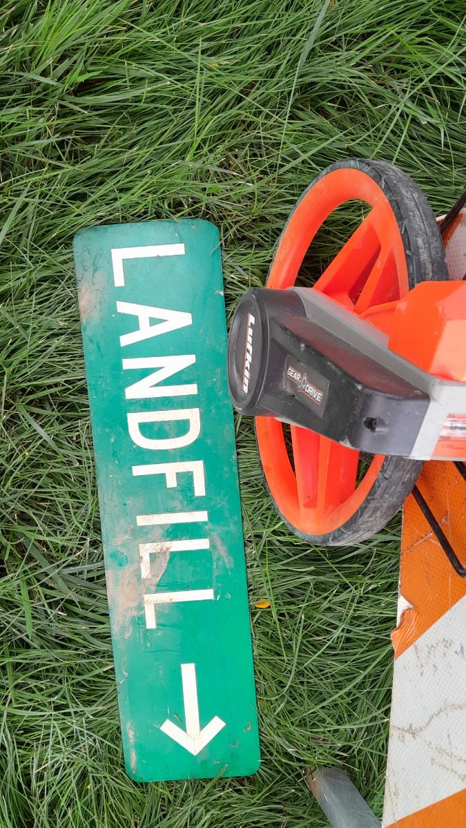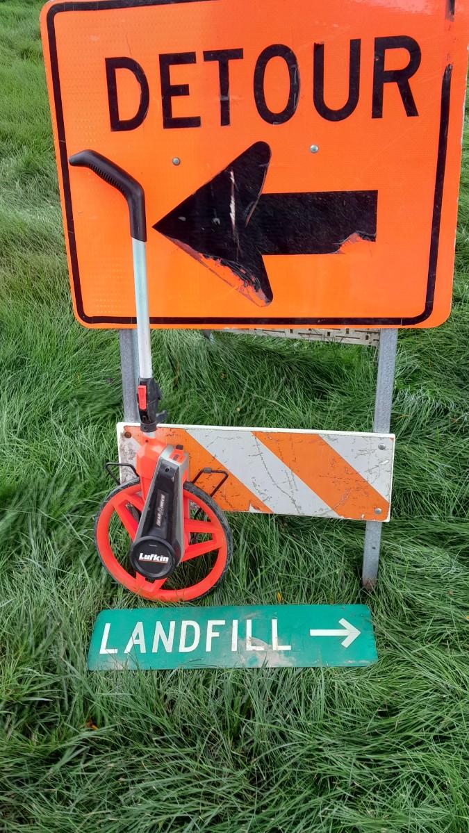 LOT 353 METAL DETOUR SIGN, LANDFILL SIGN, AND A MEASURING WHEEL (WS)
