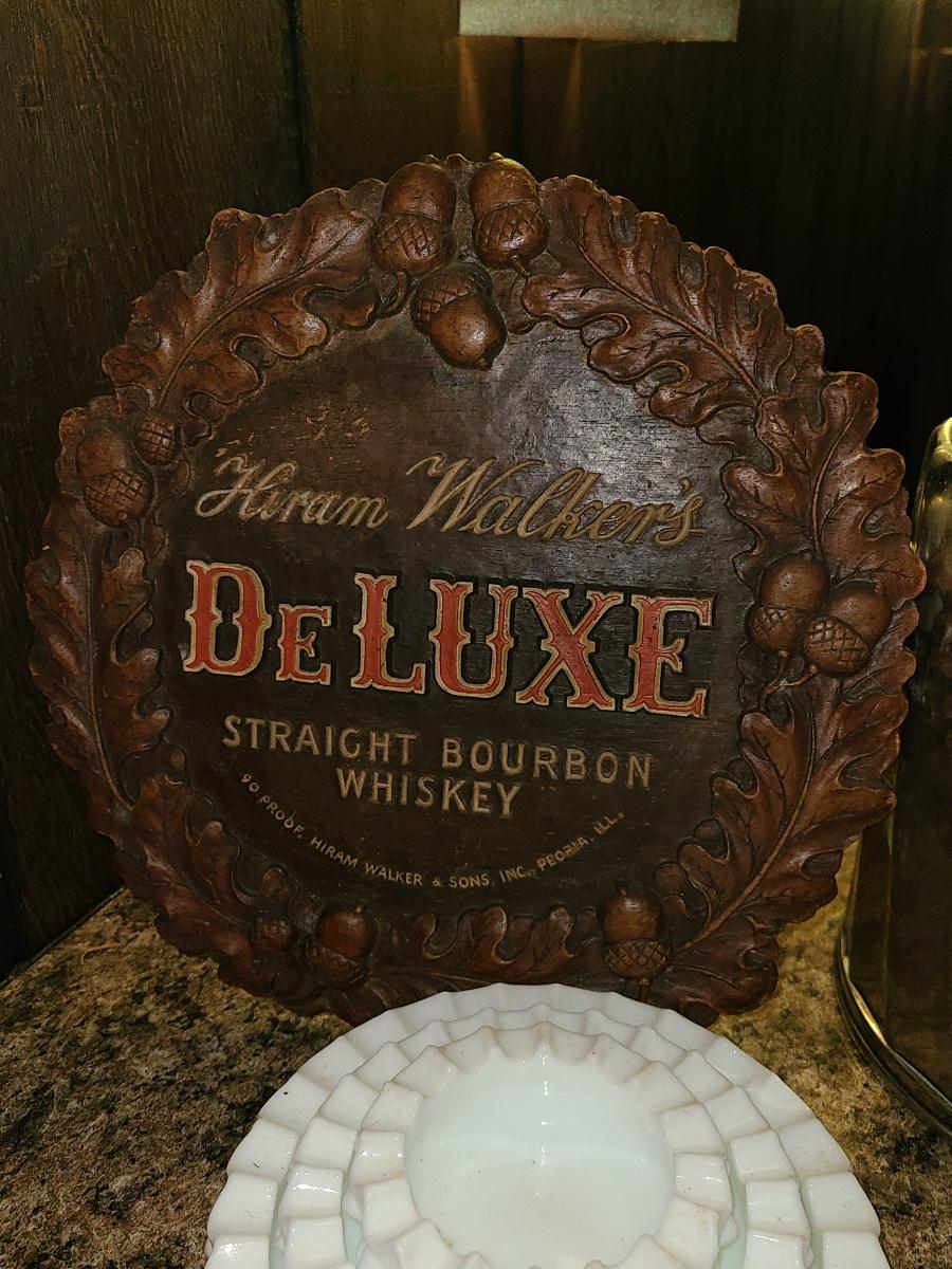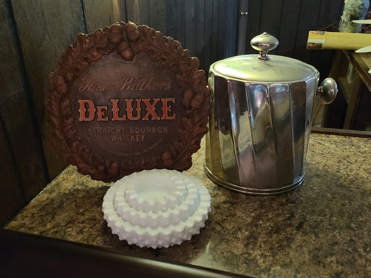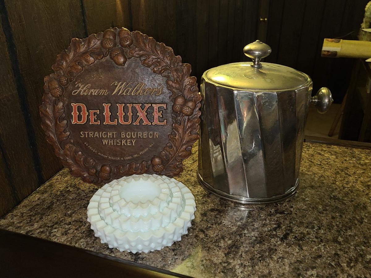 Lot 356: Bar Accessories: Bourbon Sign, Milk Glass Stacking Ashtrays, and Ice Bucket