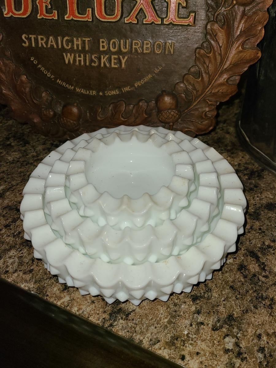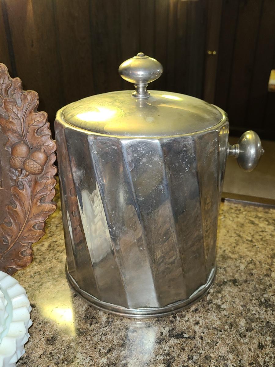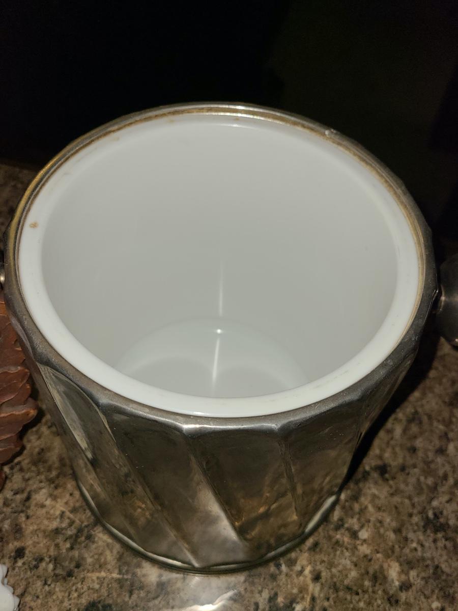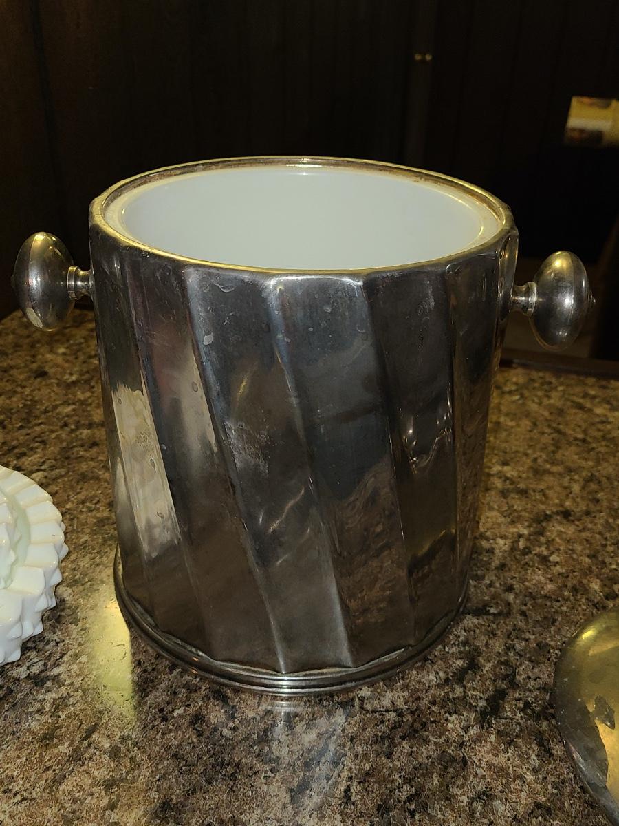 Lot 356: Bar Accessories: Bourbon Sign, Milk Glass Stacking Ashtrays, and Ice Bucket