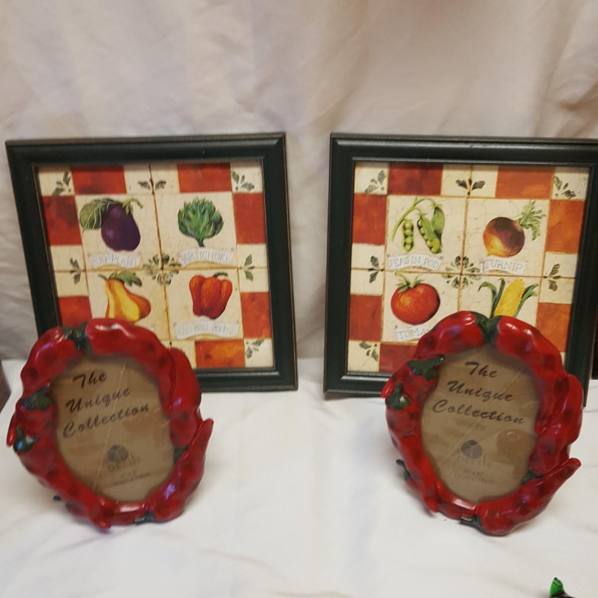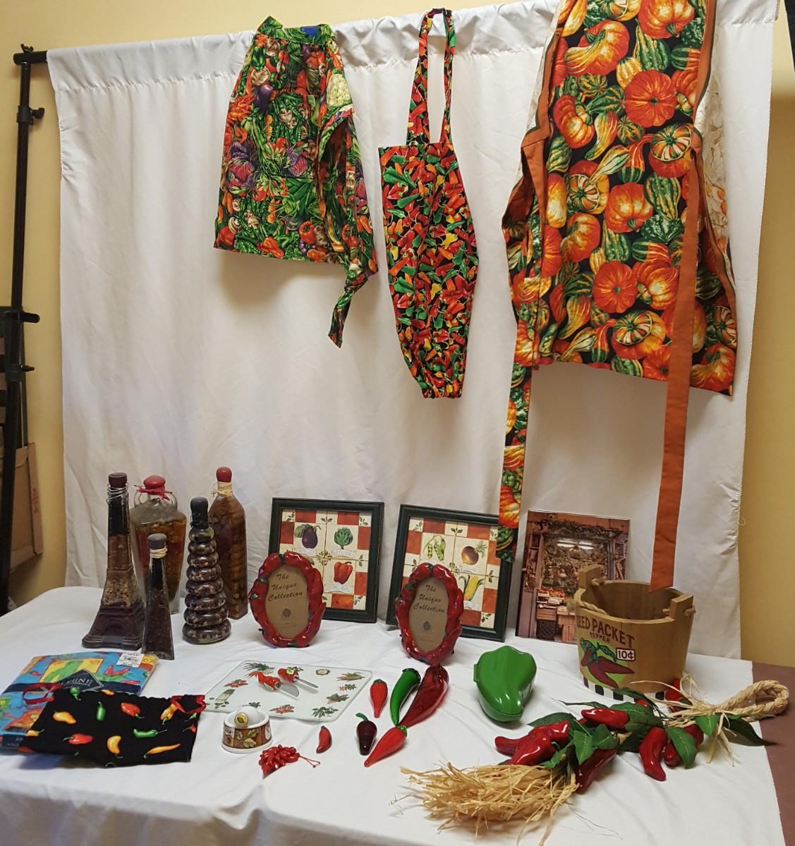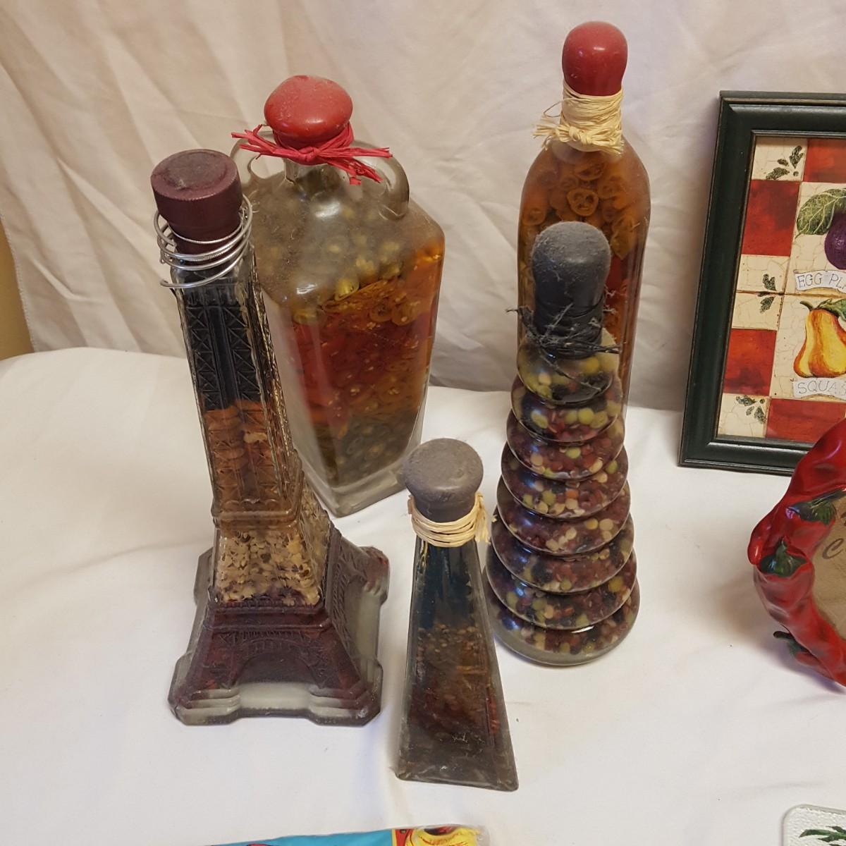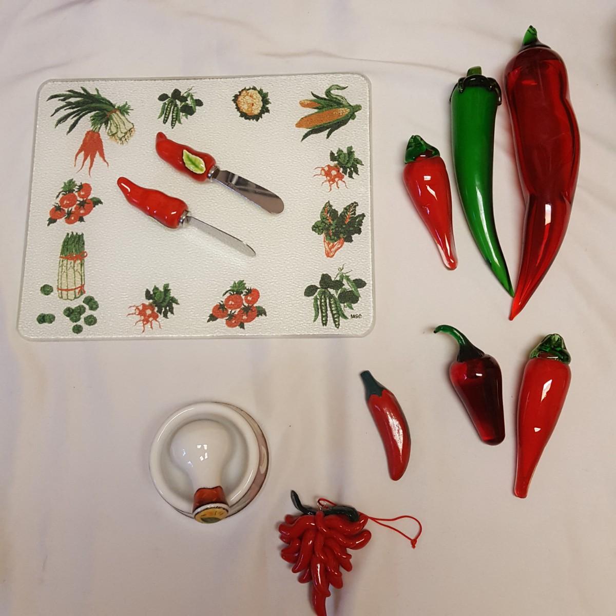HOT, HOT, HOT! If you like it spicy in your kitchen, we've got the lot for you! This lot features 5 sealed, various shaped filled bottles, perfect for display on top of your cabinets, 2 pepper frames (4"x6"), 2 wooden framed art pieces (10"x10"), 2 aprons, one full length and the other a half length, 2 pepper bags, one can be used to storage plastic grocery bags, a glass cutting board, a pictured tile, a green pepper Tupperware, a wooden bucket, a pepper wreath, a mortar and pestle and finally 5 hand blown peppers. Get it while it's HOT!