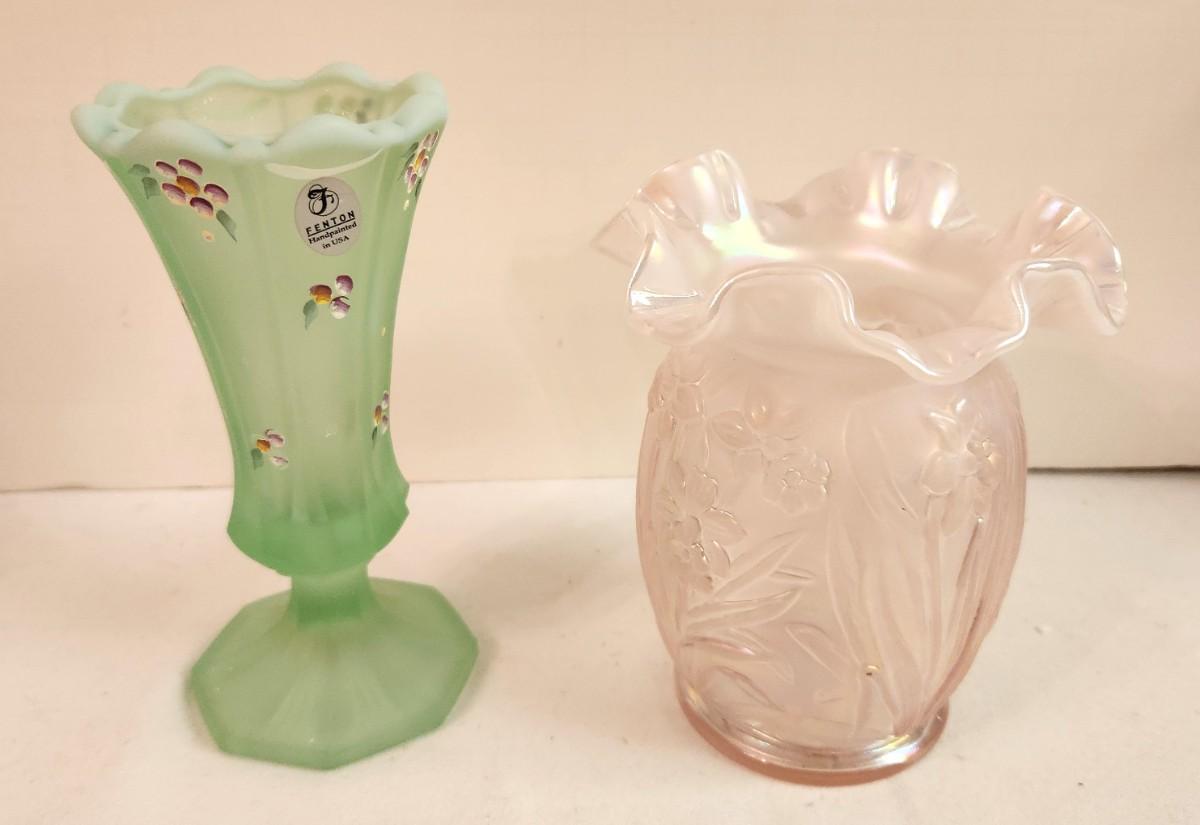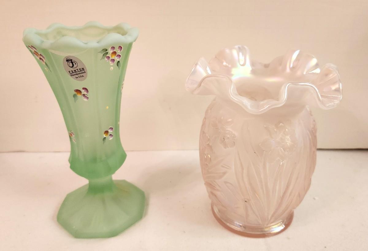 Lot of 2 classic pieces of Fenton Art Glass - vases - taller is 6" tall - green piece has label. Both in good condition