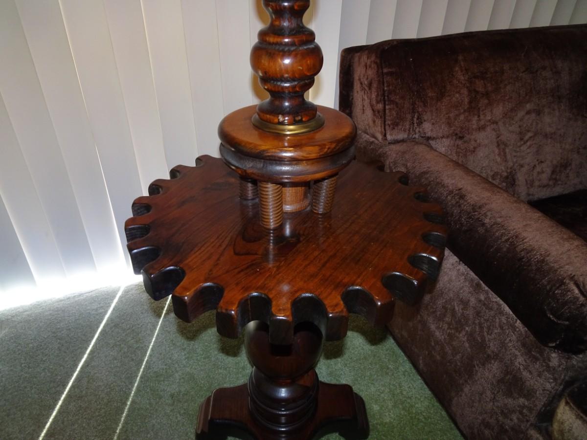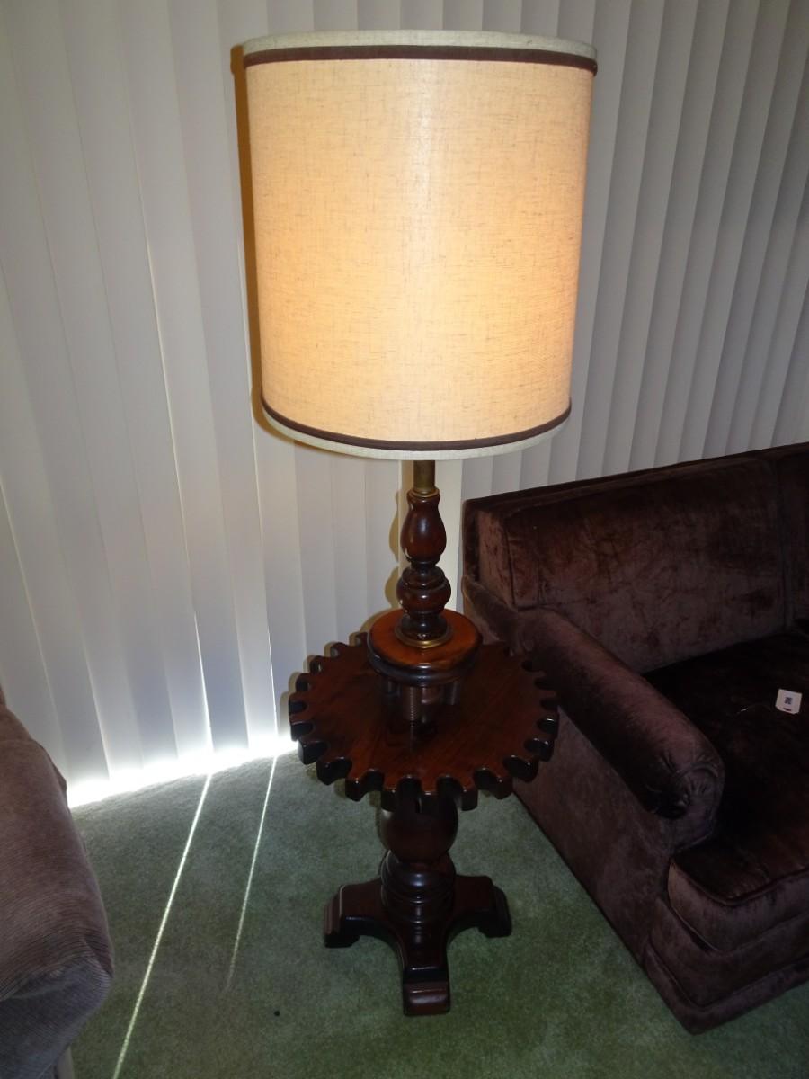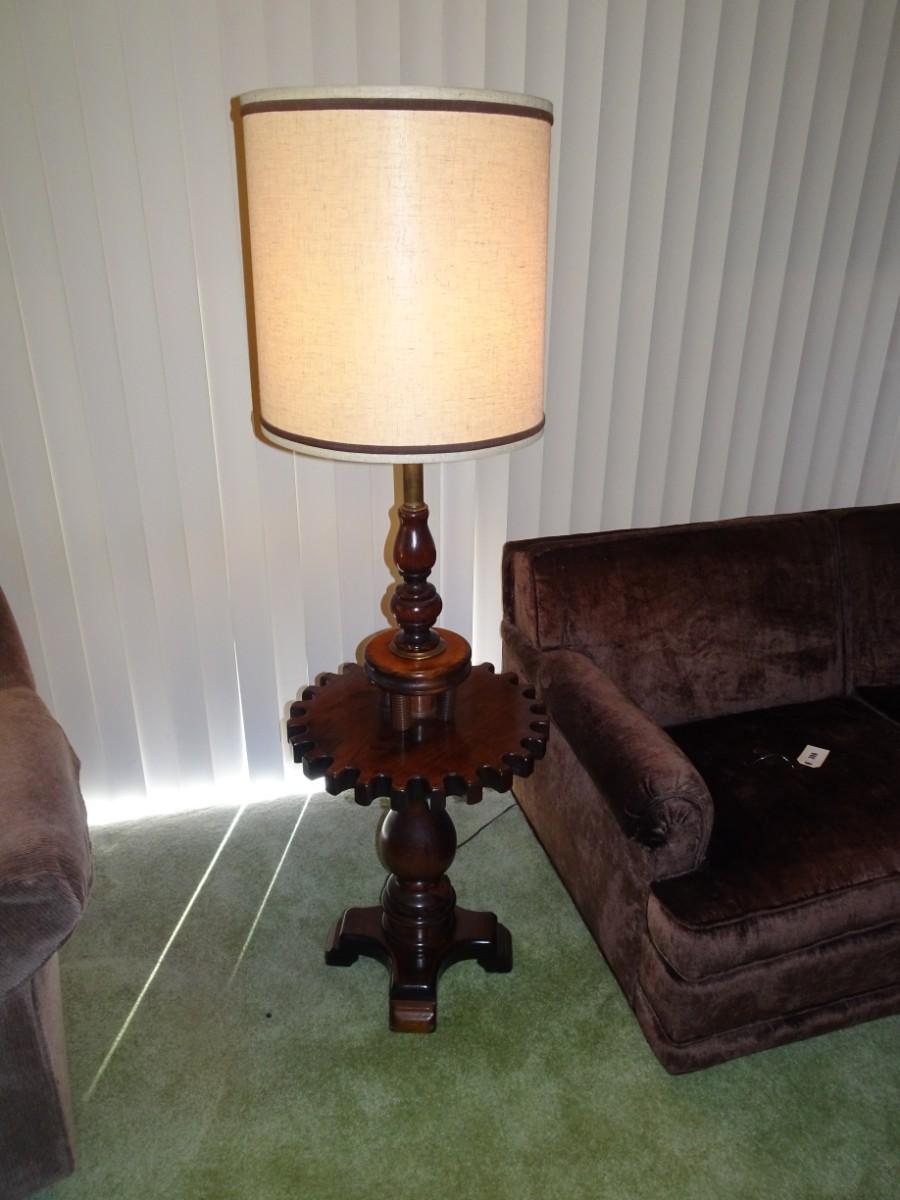 LOT 357. VINTAGE WOOD FLOOR LAMP WITH TABLE