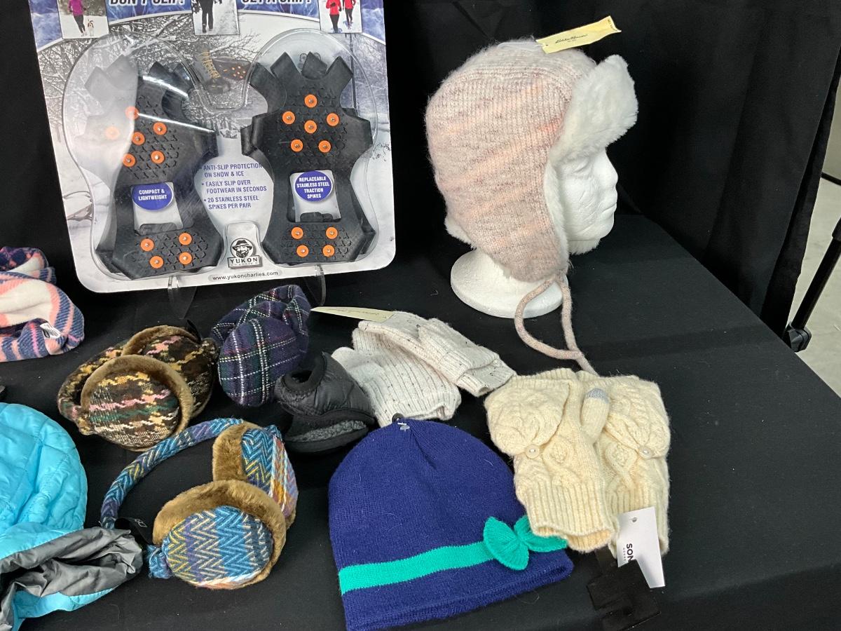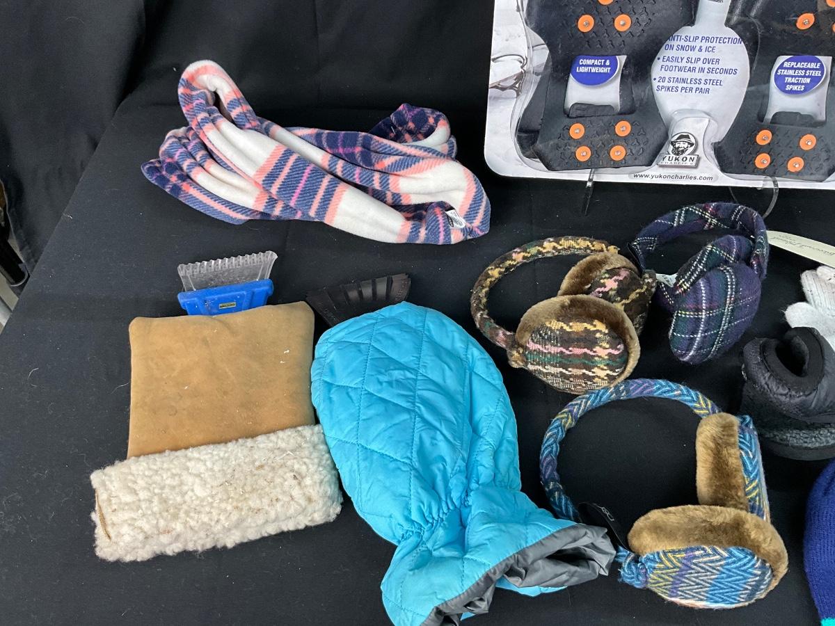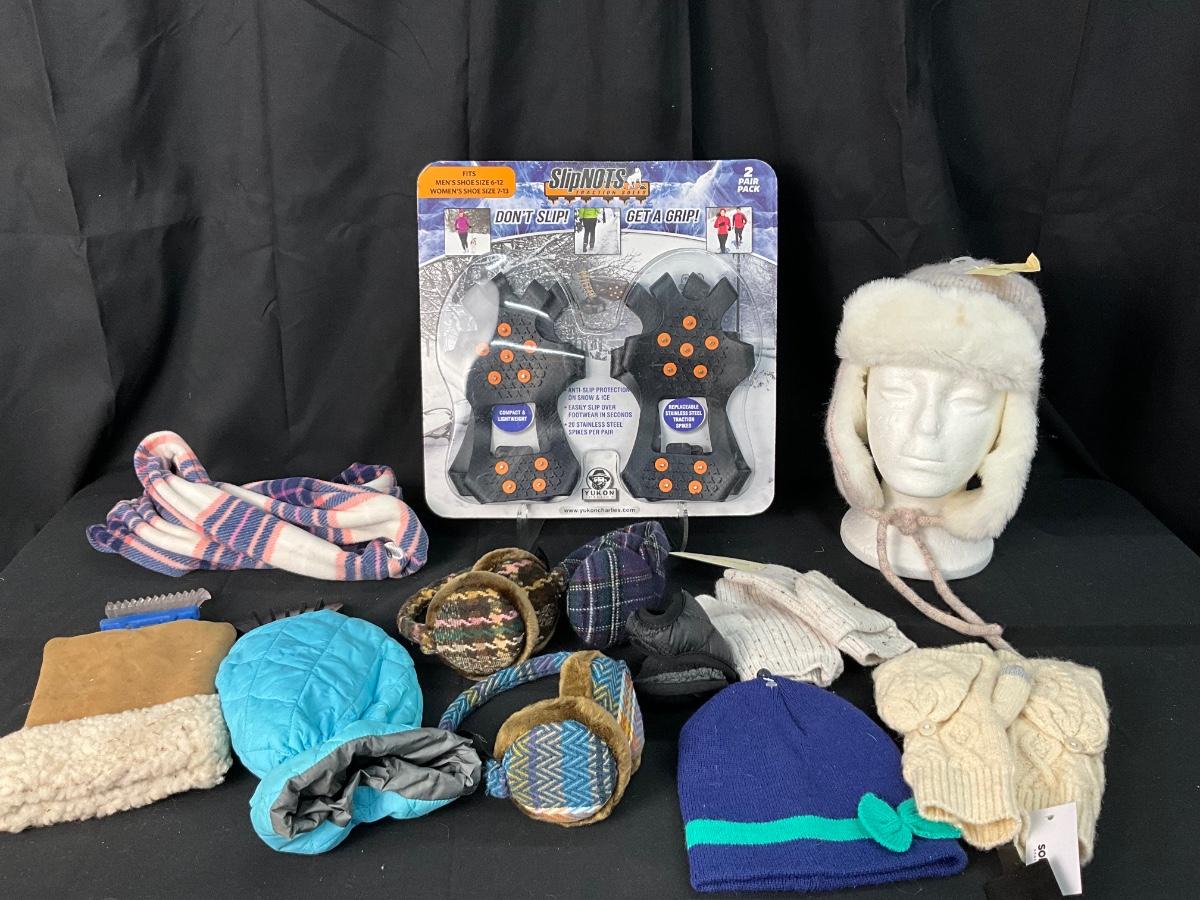 Slip Nots for snow traction, snow scrapers x 2, ear muffs x 4, 2 pair of gloves, 2 hats. Brands included are LL Bean, Eddie Bauer, Universal Thread, Old Navy.