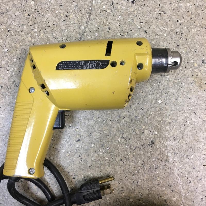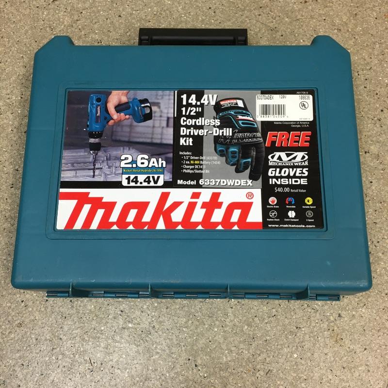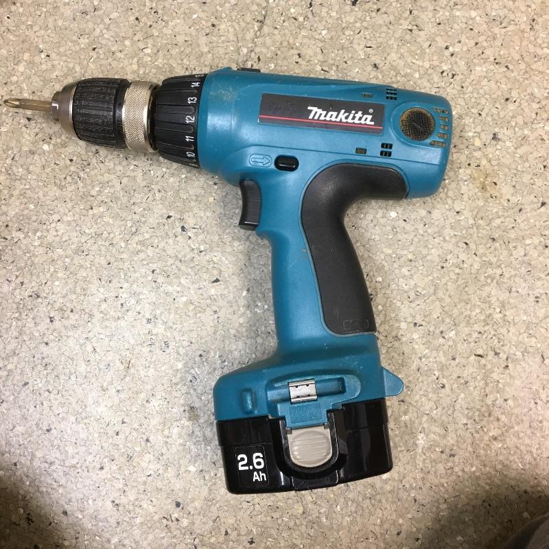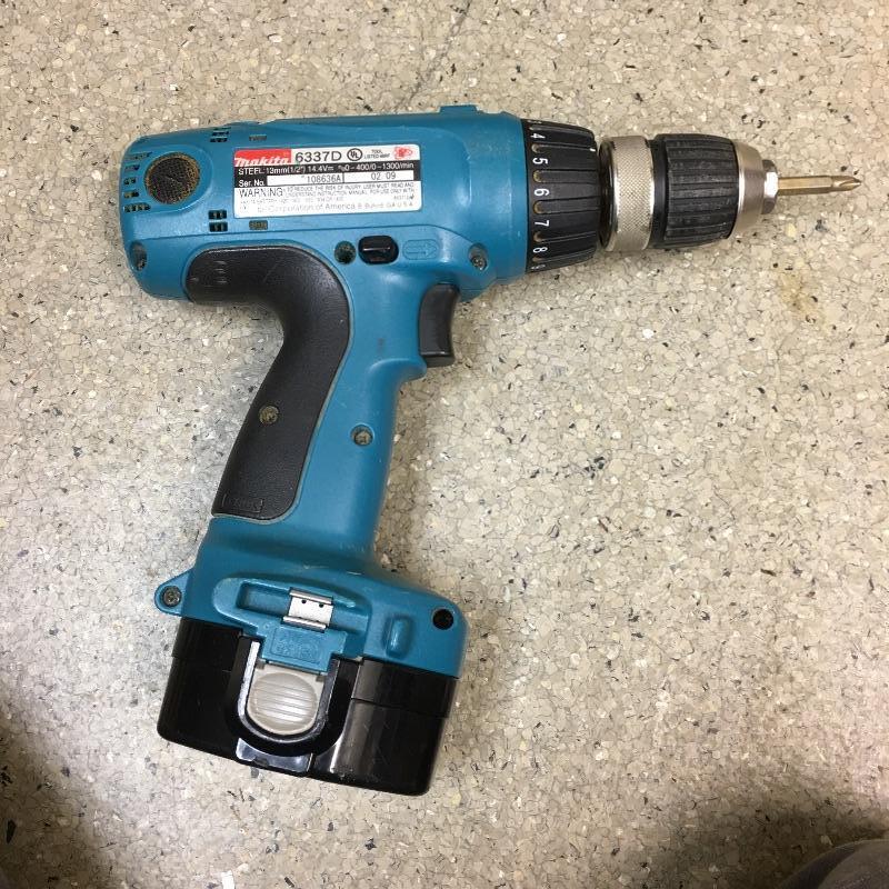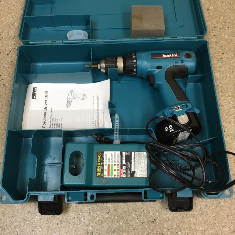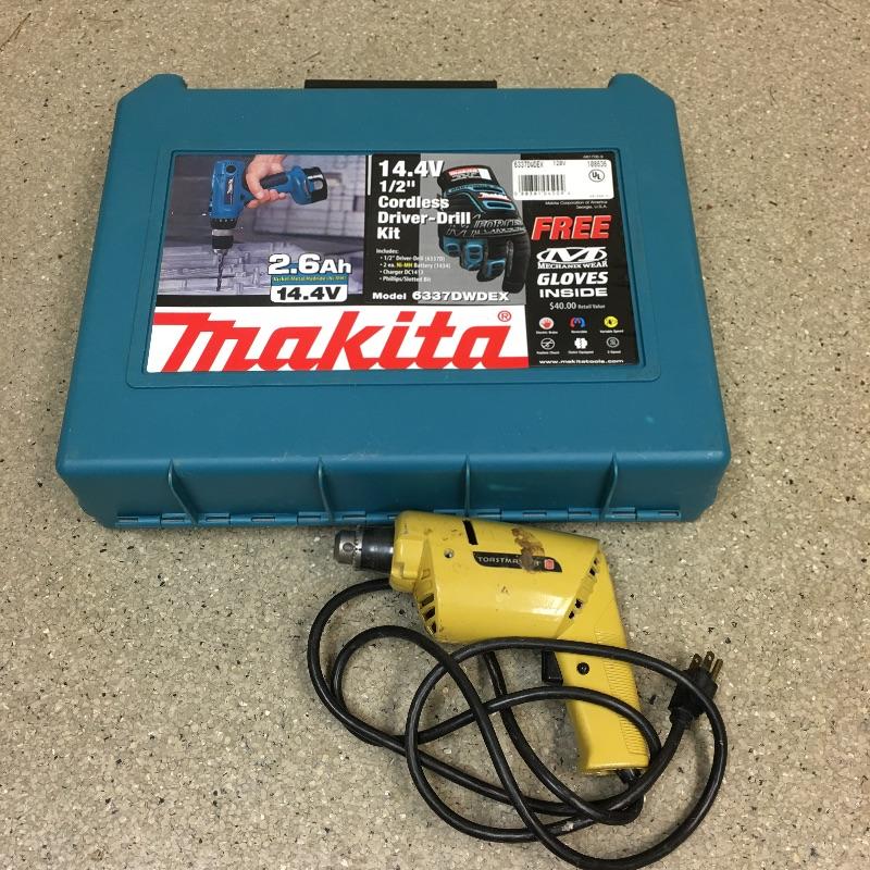 Makita 14.4v cordless drill with charger and one battery. Also includes a corded Toastmaster drill.