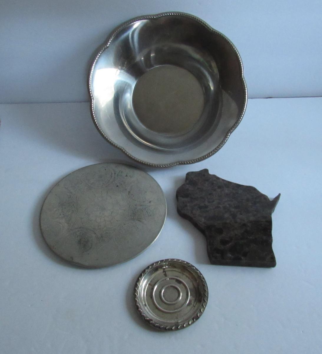 The sterling butter pat has rust and needs a desperate cleaning. The cardboard hot pad is worn. A tiny scratch or two in the Italy bowl, but overall fine. The granite hot pad is pretty cool. State of WI shaped. Shipping is available on this lot at actual shipping cost plus $5 additional shipping and handling fee per box. All sales final, no returns or refunds. See our terms for details.