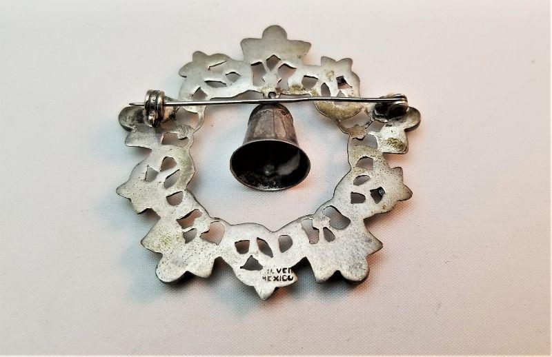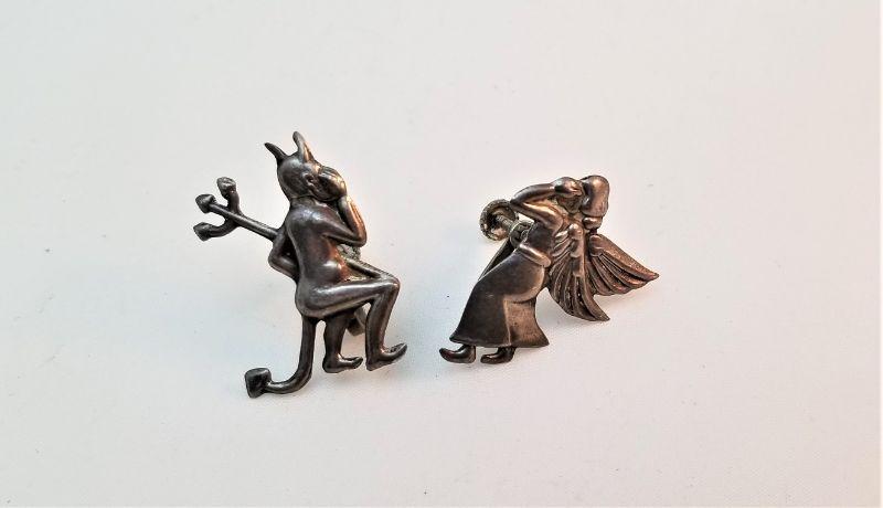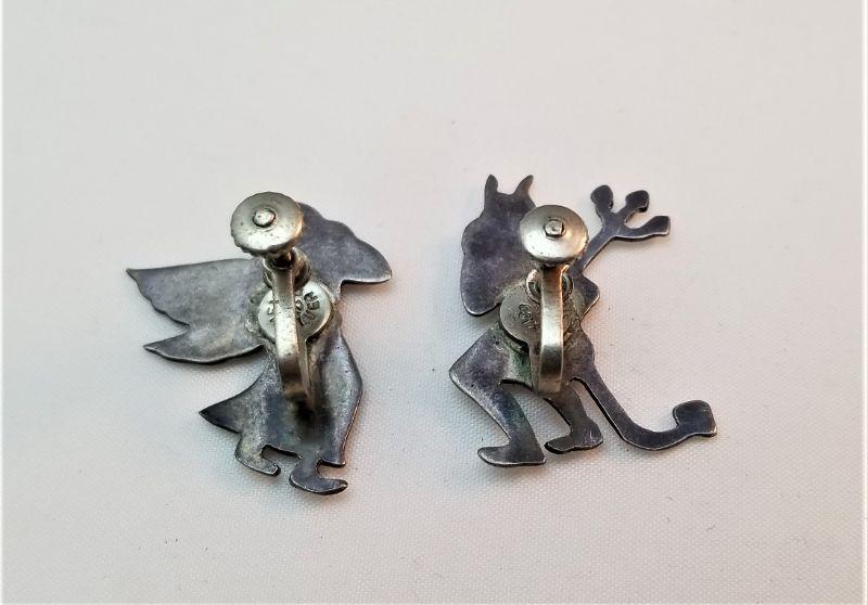 Great vintage grouping here. First - a Sterling silver Christmas wreath studded with green turquoise (made in Mexico) - measures 2" across - functioning bell and a cute pair of sterling (Mexico) screw back earring that depict a devil whispering into your ear on one side and an angel doing the same on the other side. These are each a little over 1.25" tall.