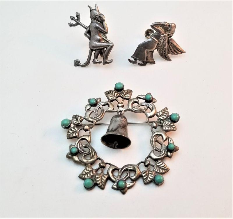 Lot #357  Sterling Silver Christmas Wreath Brooch and  Sterling Angel/Devil on my Shoulder earrings