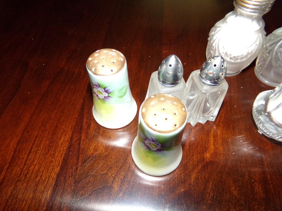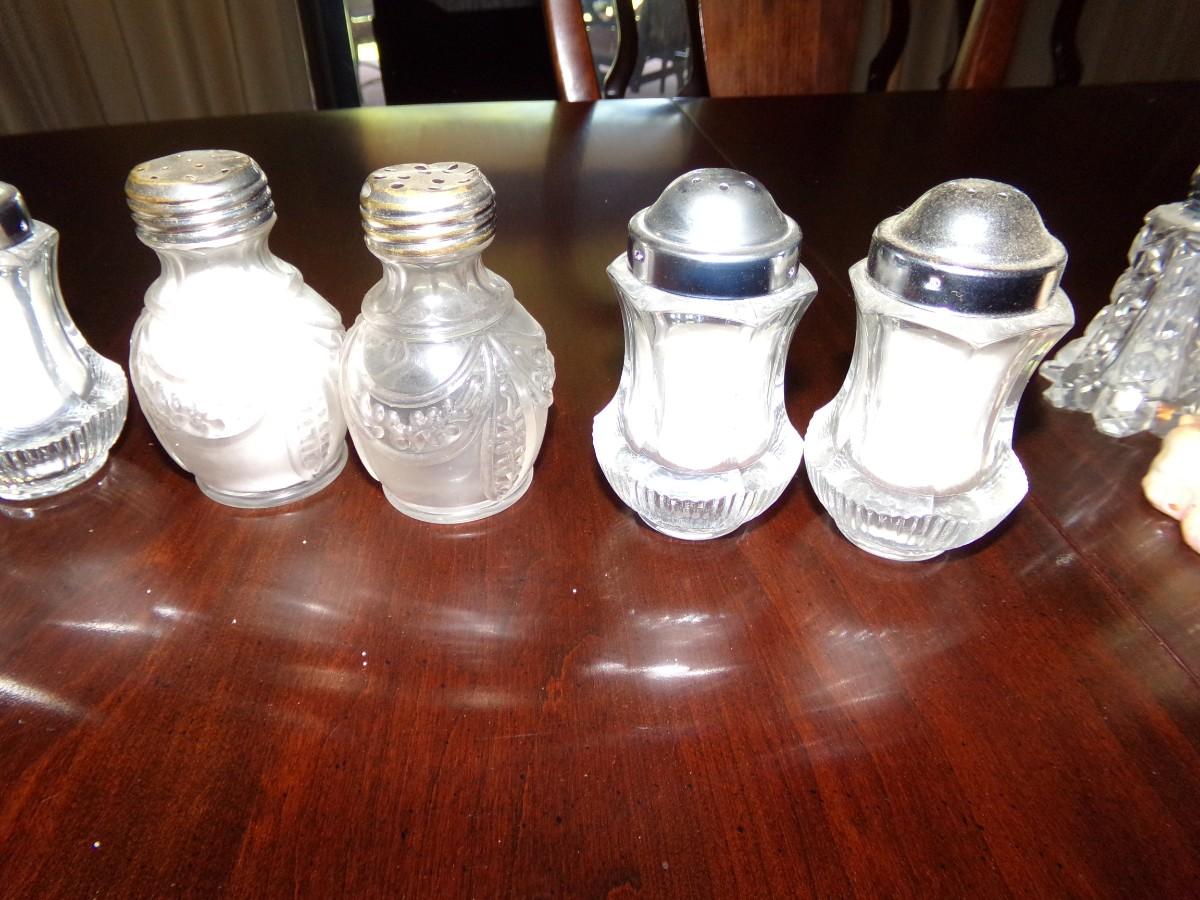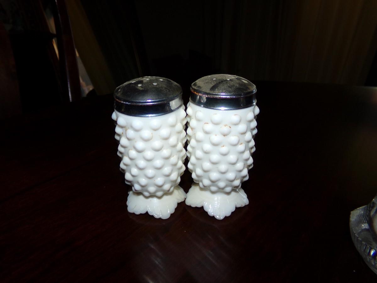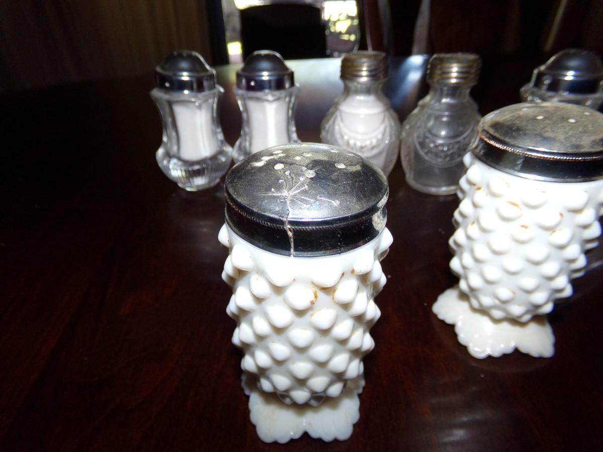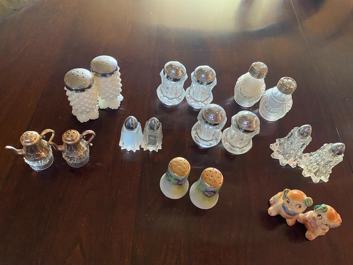 VINTAGE SALT AND PEPPER SHAKERS. A TOTAL OF 9 SETS. INCLUDING FENTON MILK GLASS, CUT GLASS SET AND SILVER LIKE TEAPOT SET