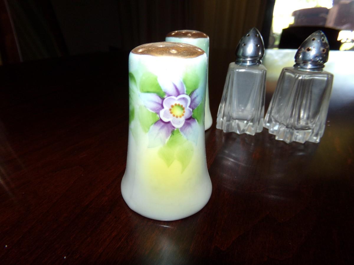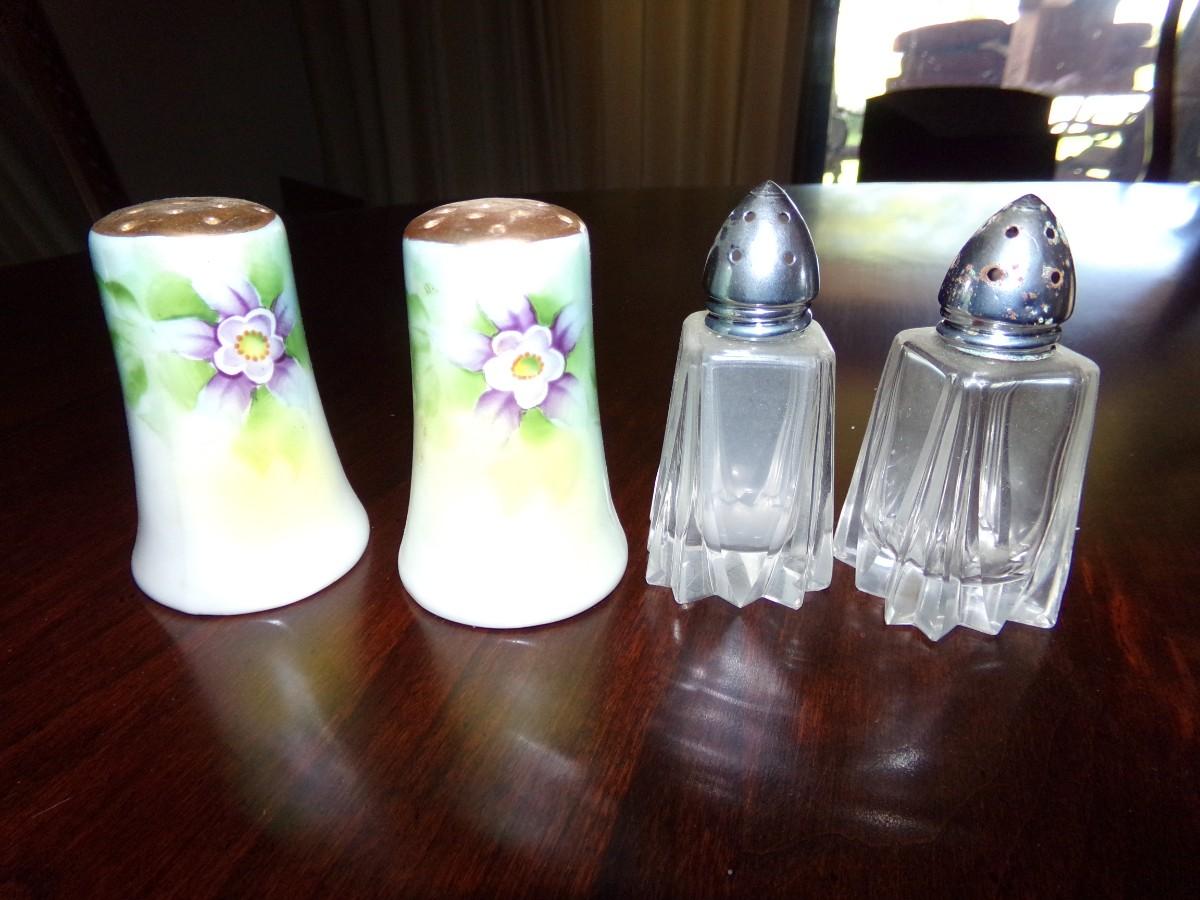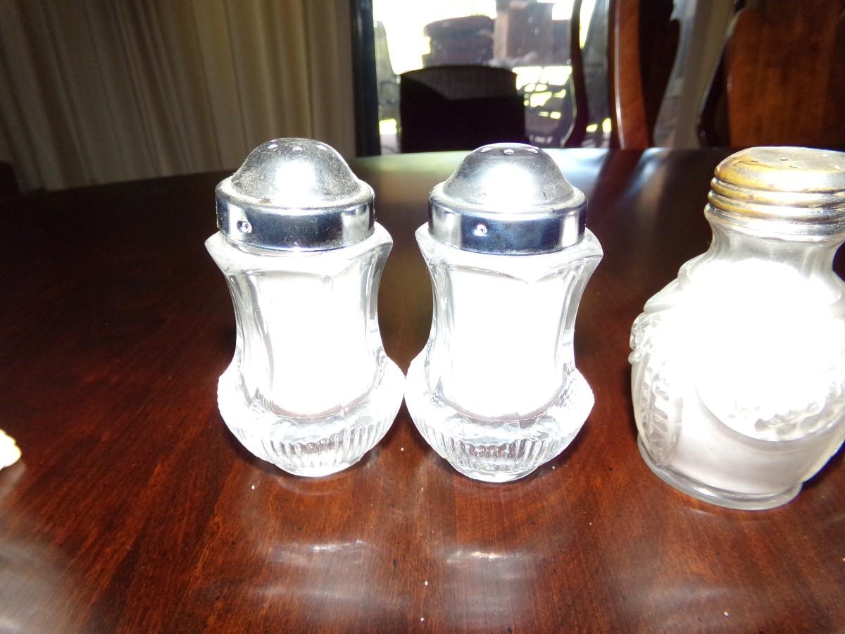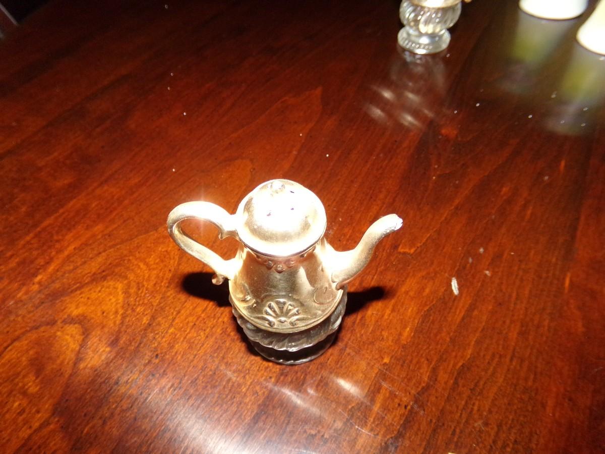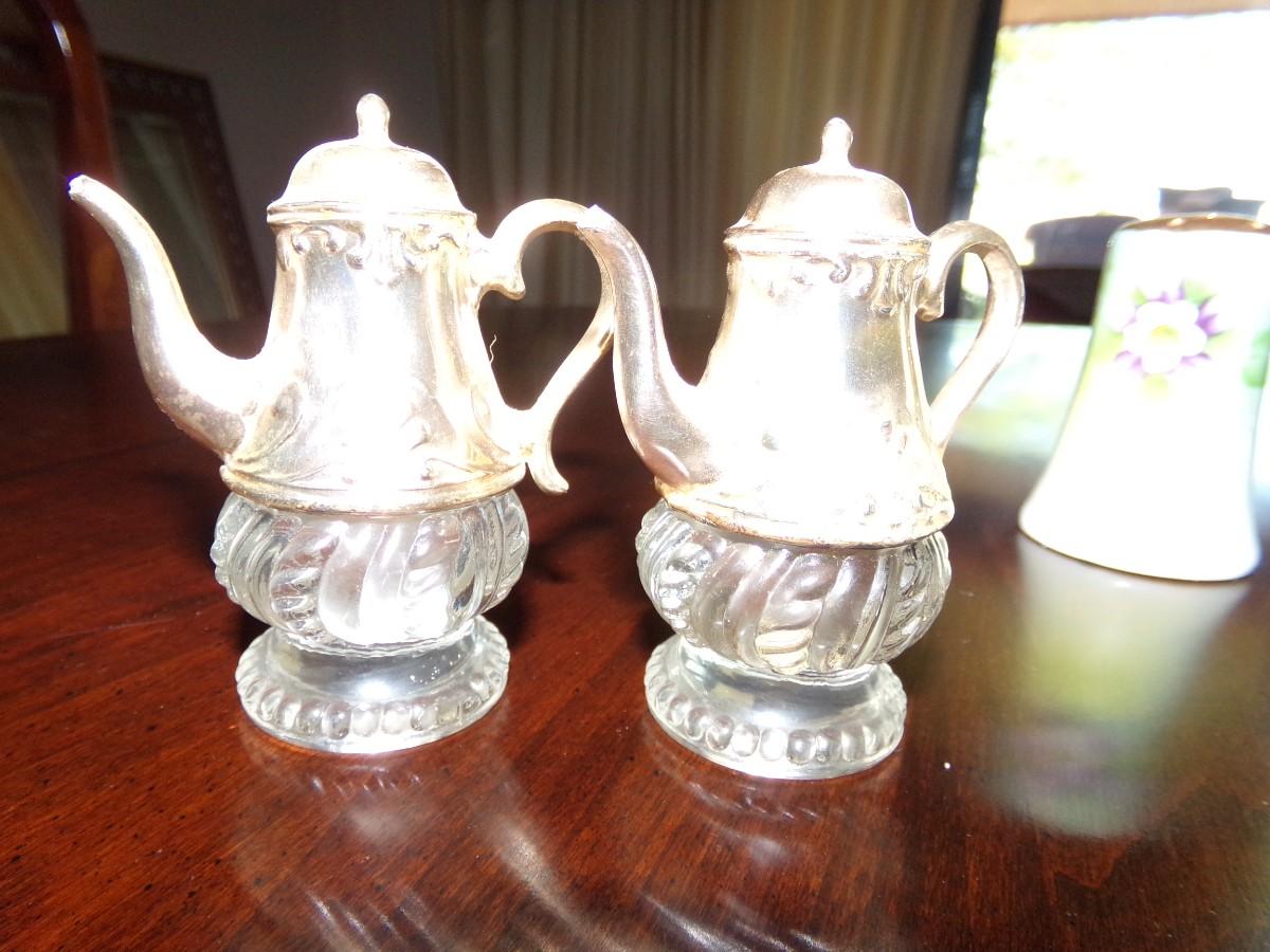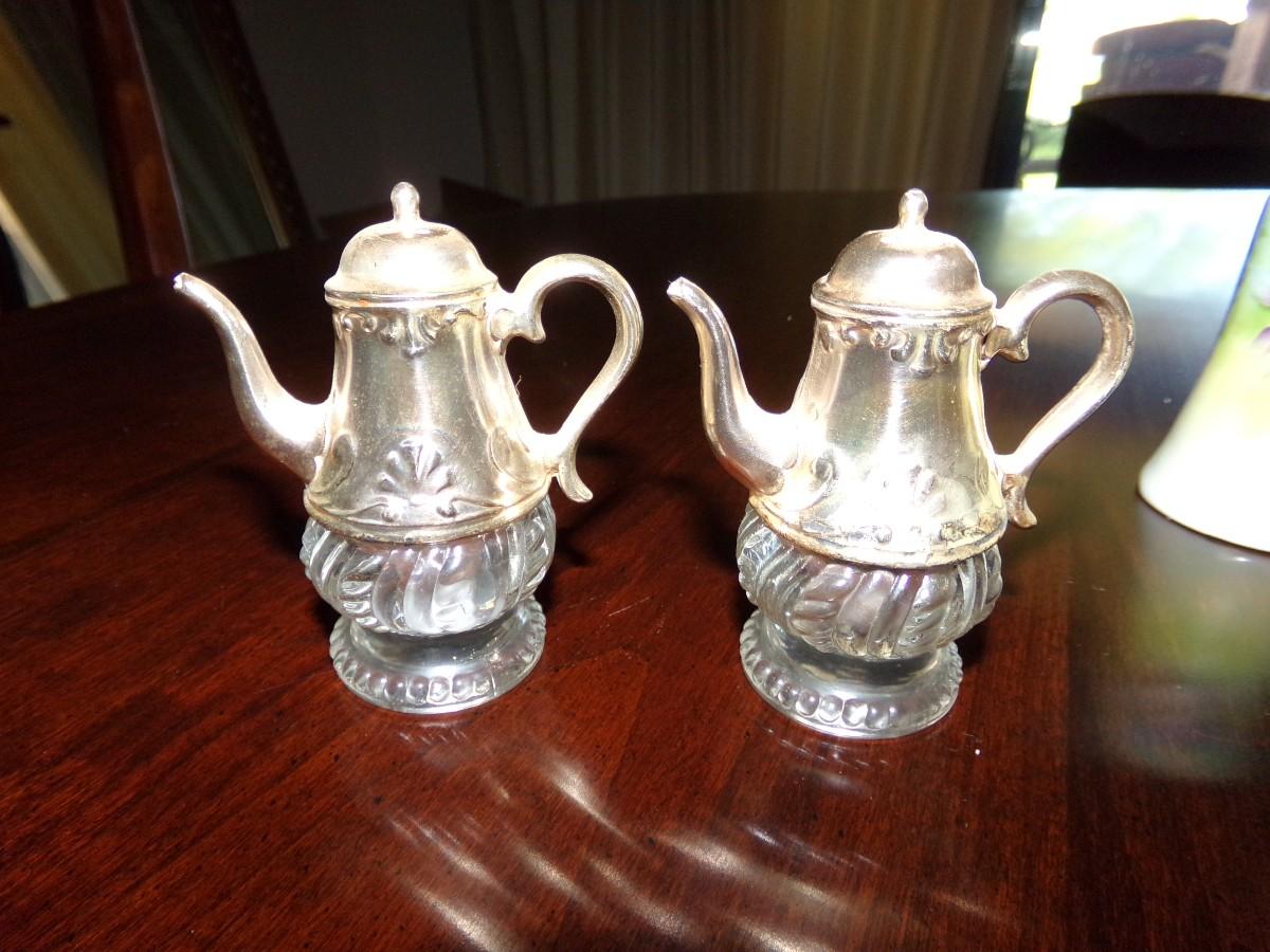 VINTAGE SALT AND PEPPER SHAKERS. A TOTAL OF 9 SETS. INCLUDING FENTON MILK GLASS, CUT GLASS SET AND SILVER LIKE TEAPOT SET
