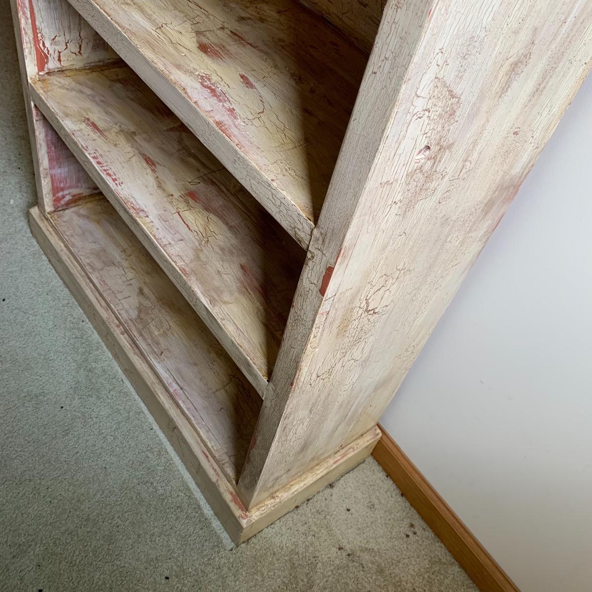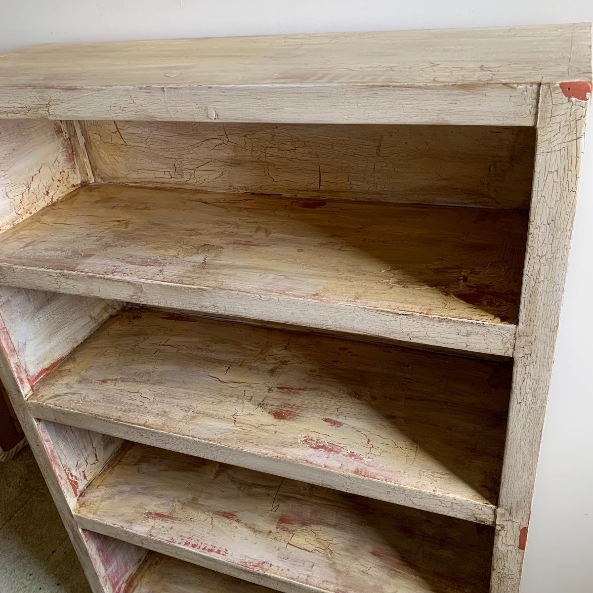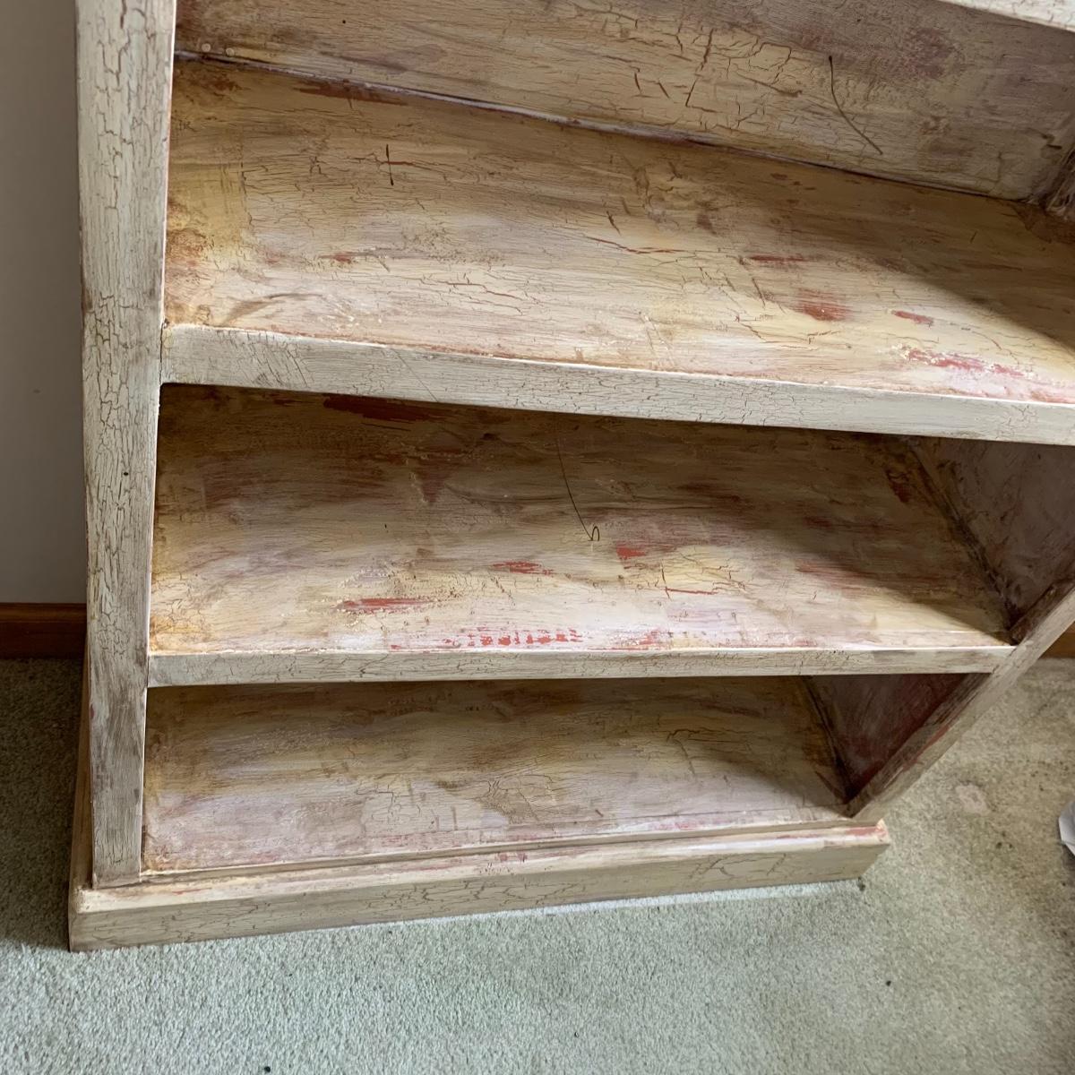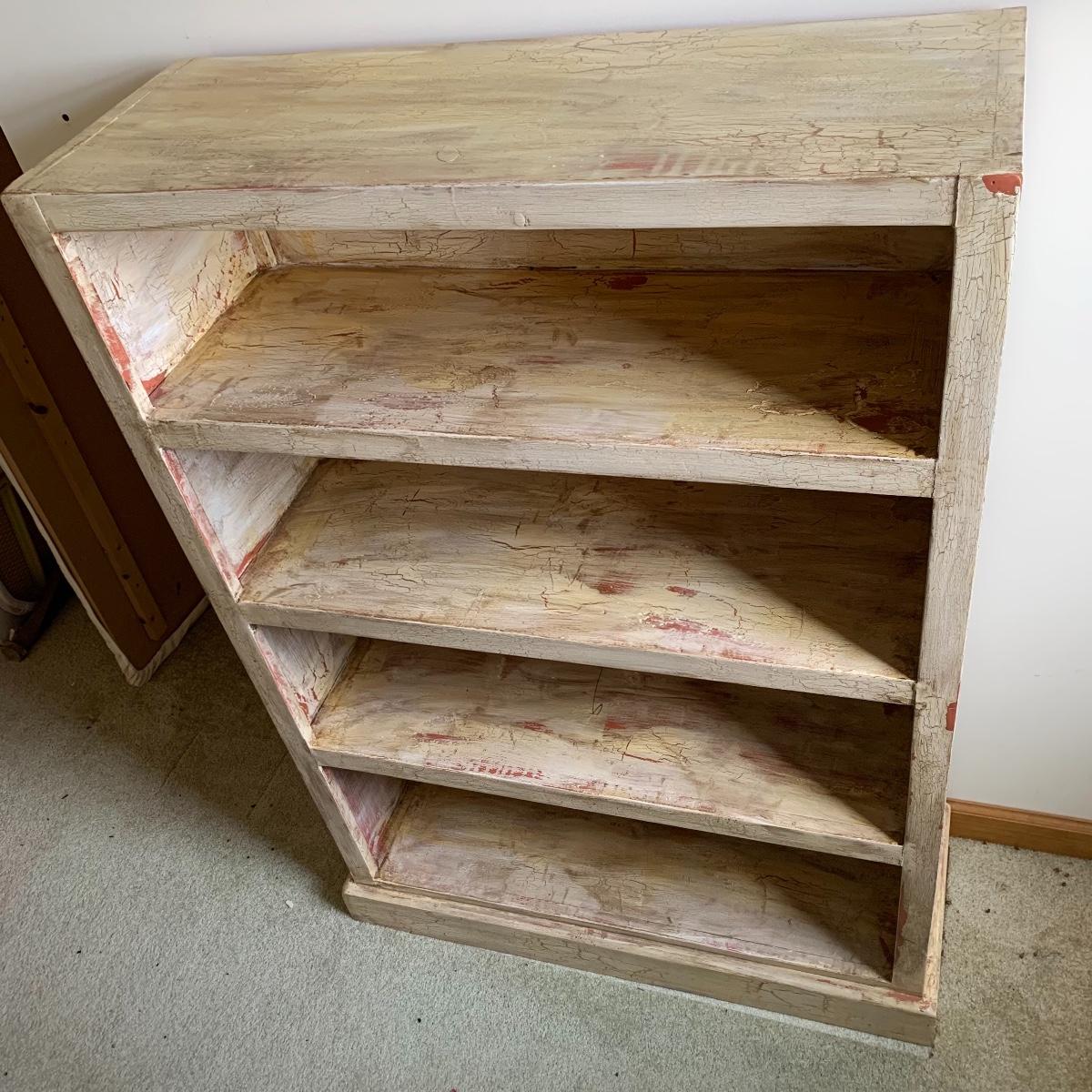 This wooden bookshelf has a fun crackled/distressed white paint job. It has four stationary shelves. It is sturdy and appears to be in good condition. The unit measures 34” x 13” x 48”. Local pickup only. Please note that the winning bidder will need to move the unit from the second floor of the house. It is not very heavy, but would be easiest to have two people to move it.