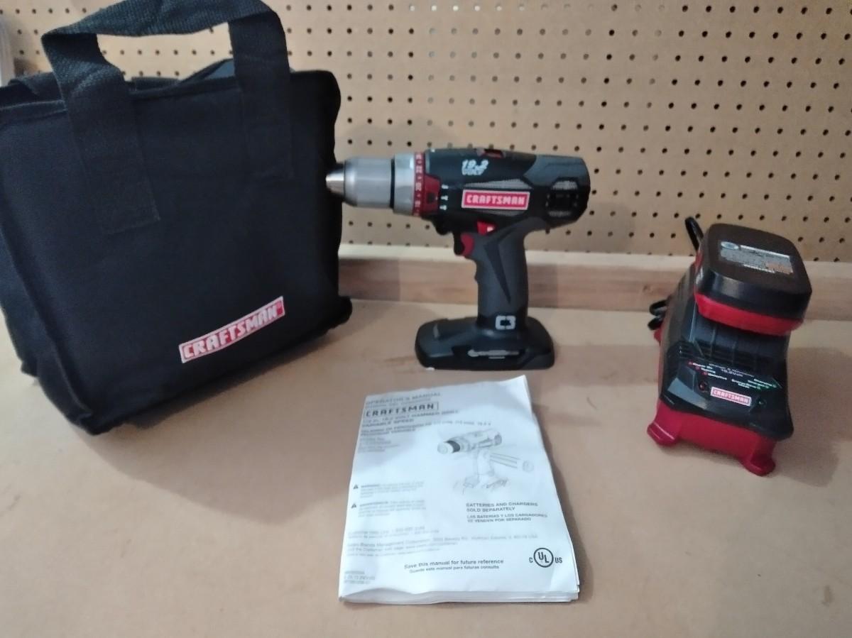 CRAFTSMAN DRILL DRIVER WITH CHARGER AND A TOOLBAG.