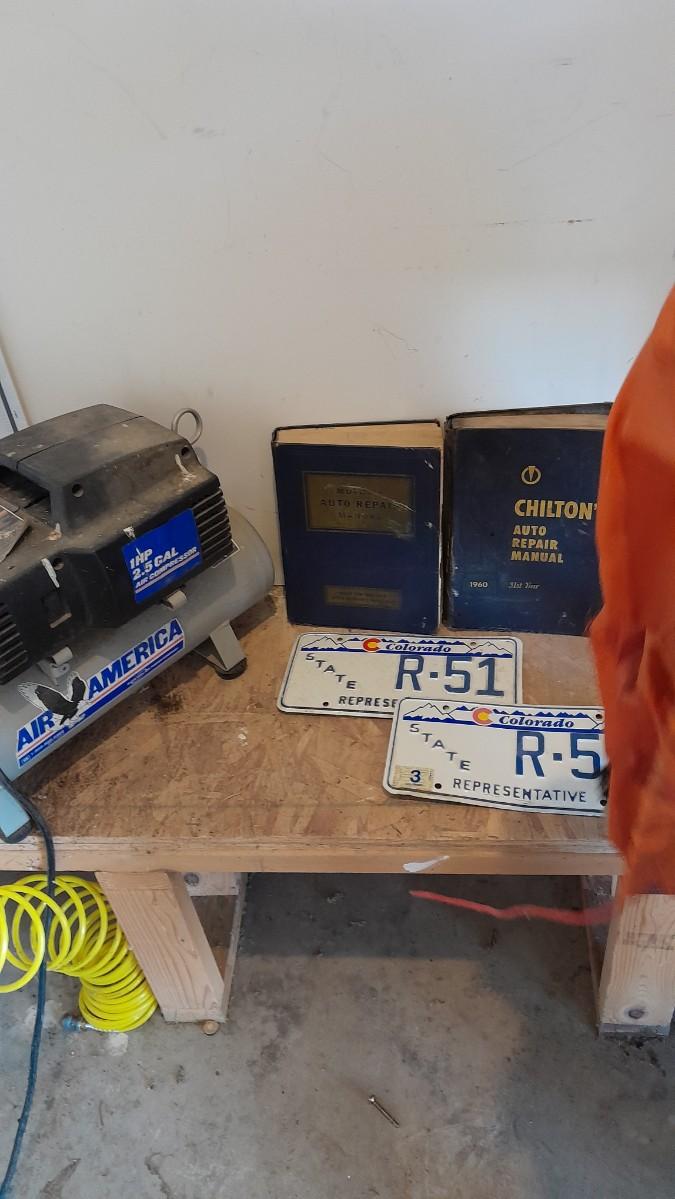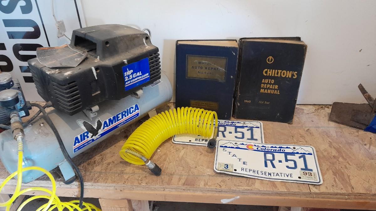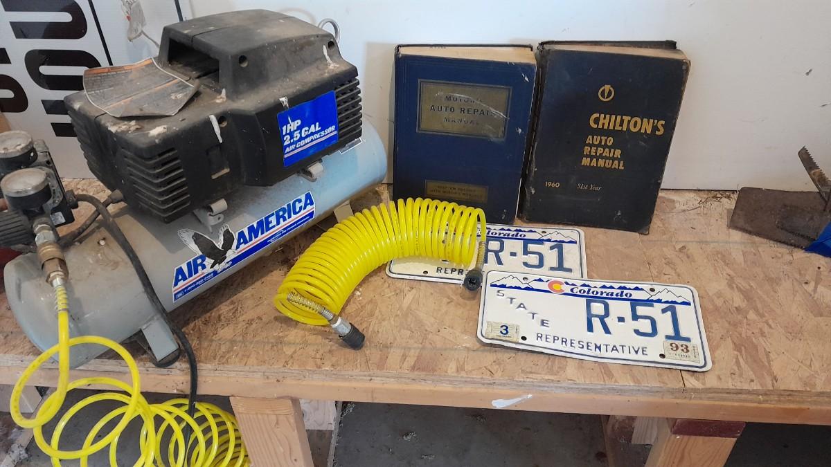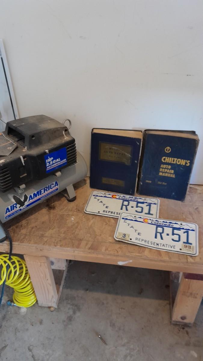 AIR AMERICA AIR COMPRESSOR VINTAGE CAR MANUALS, AND LICENSE PLATES
