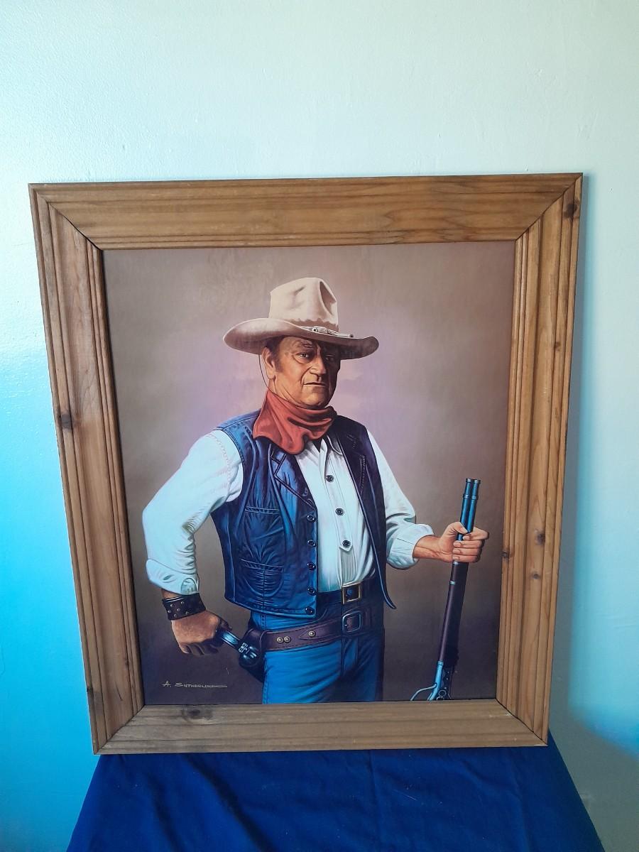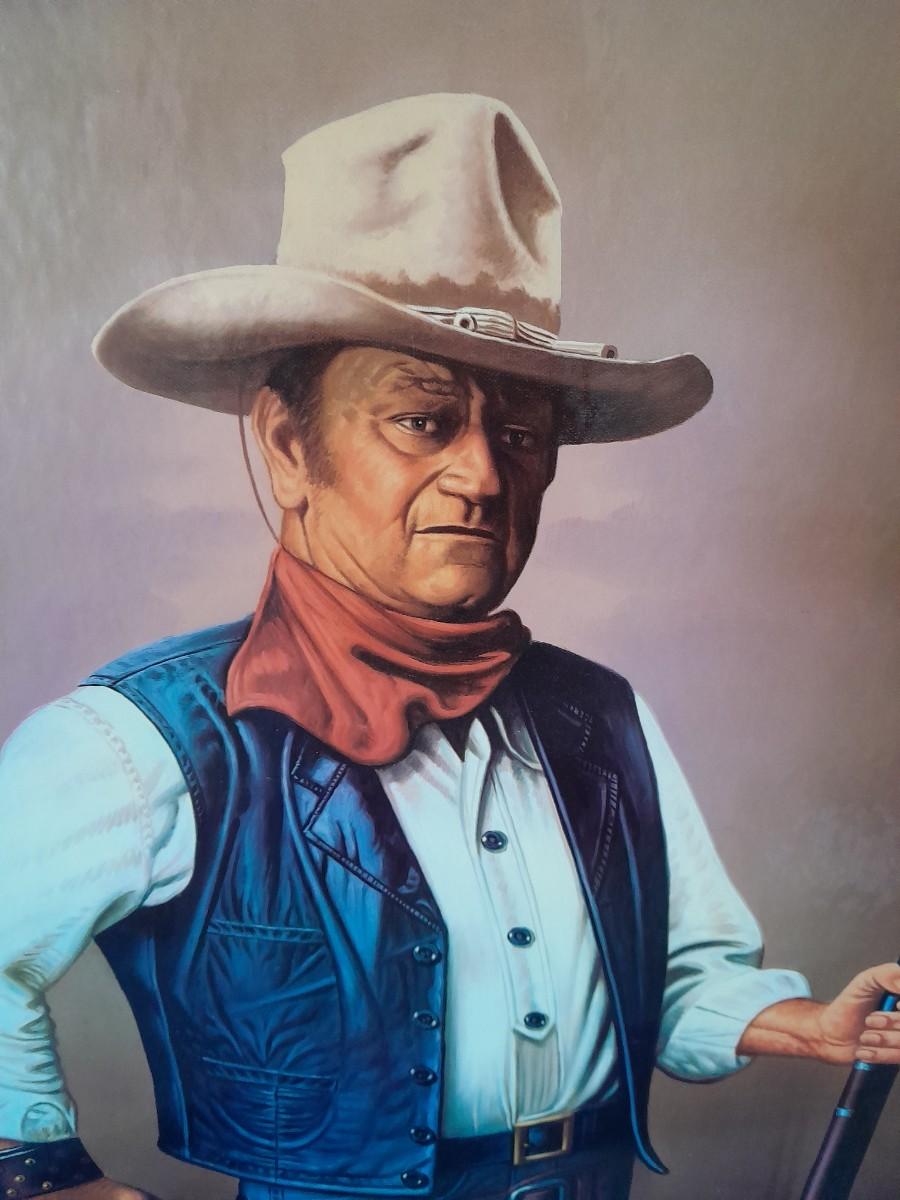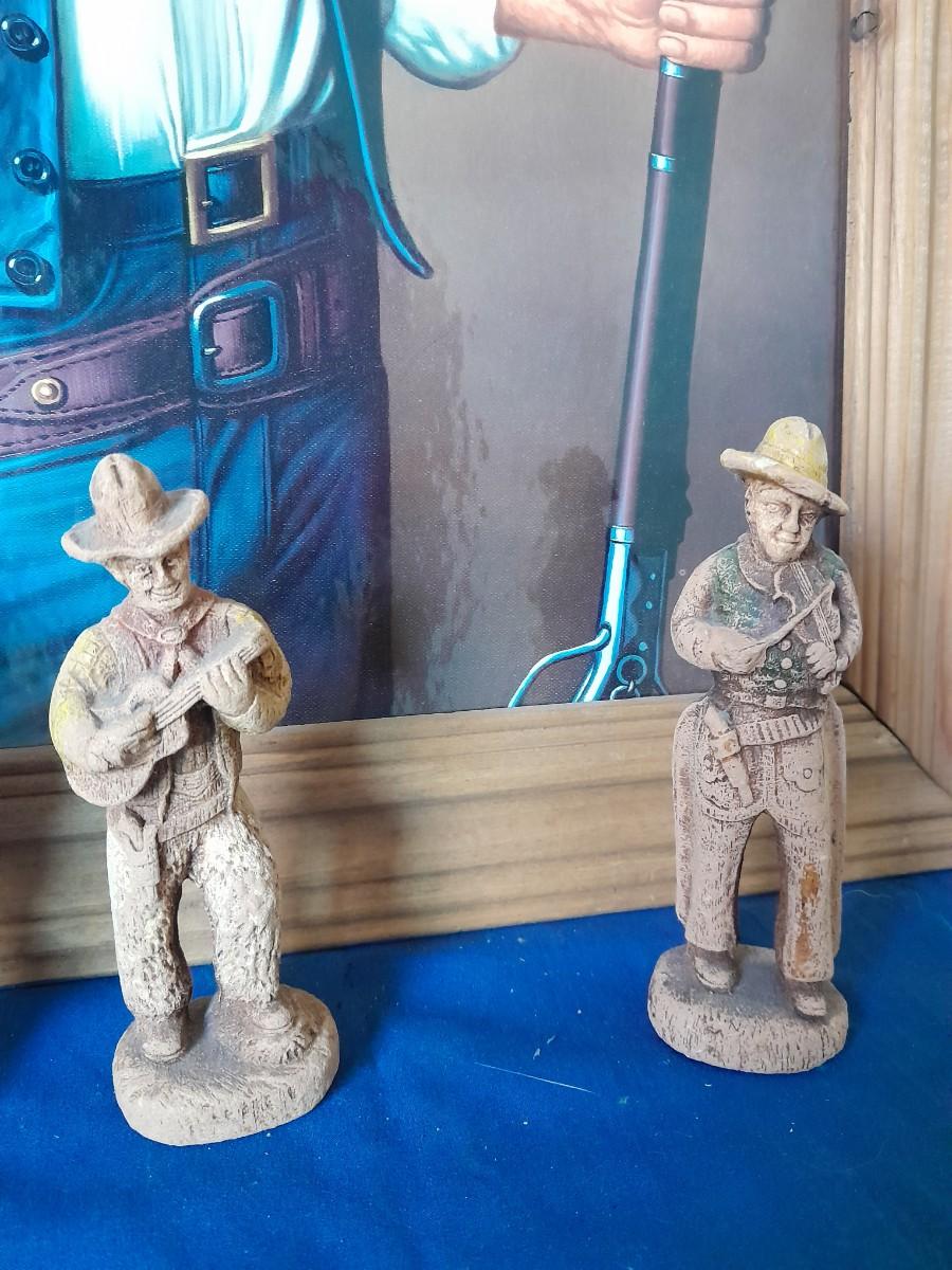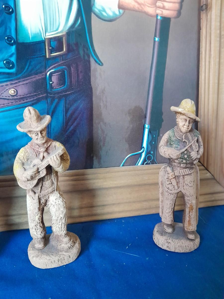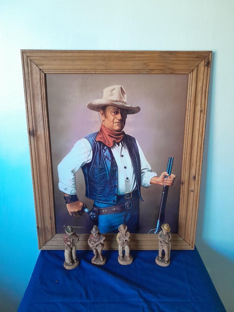 JOHN WAYNE PICTURE 20" X 24" AND FOUR OLD WESTERN BAND WOOD CARVED FIGURES 6" TALL