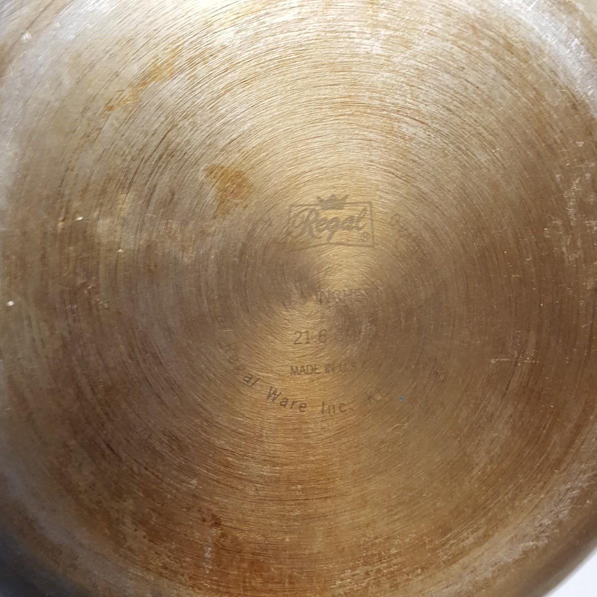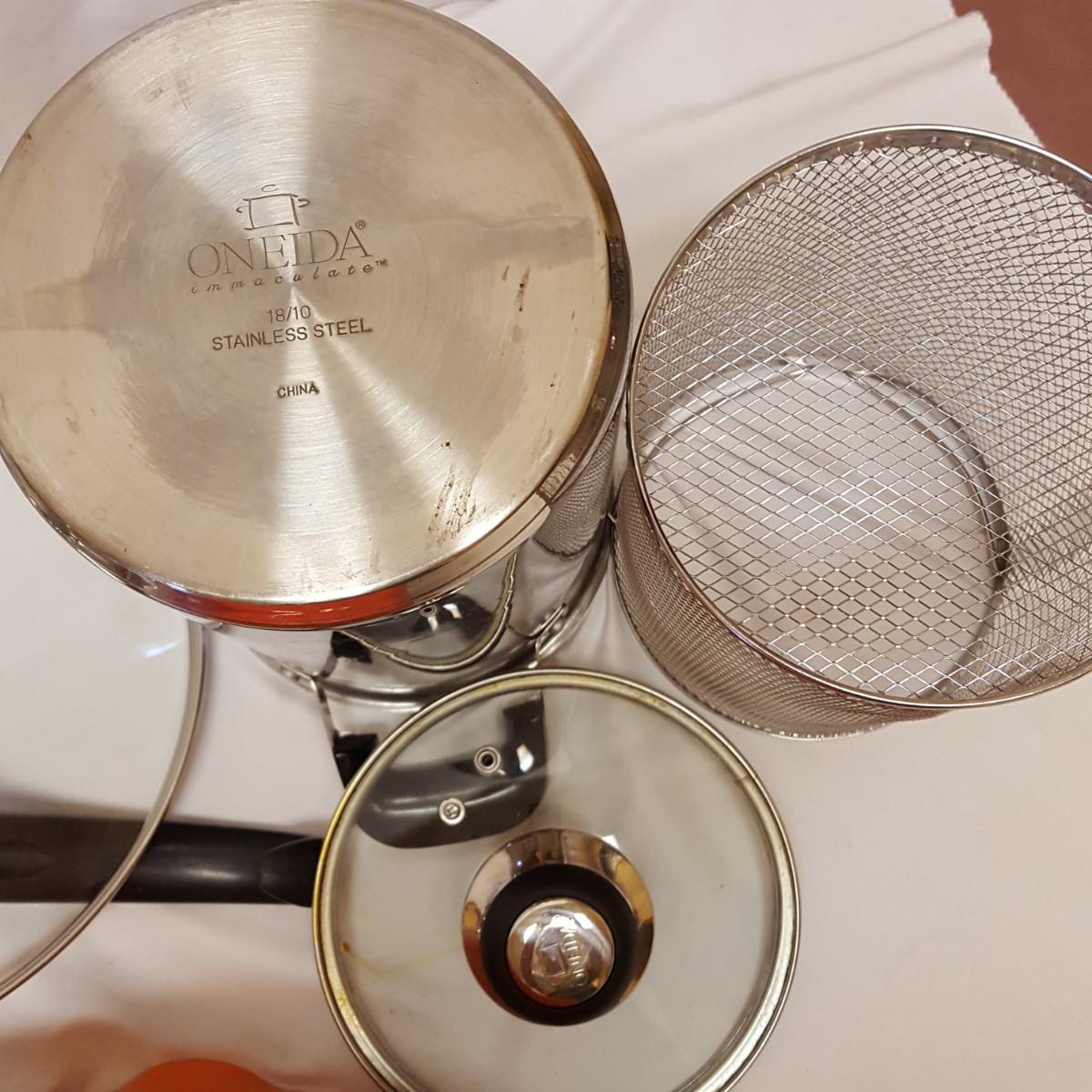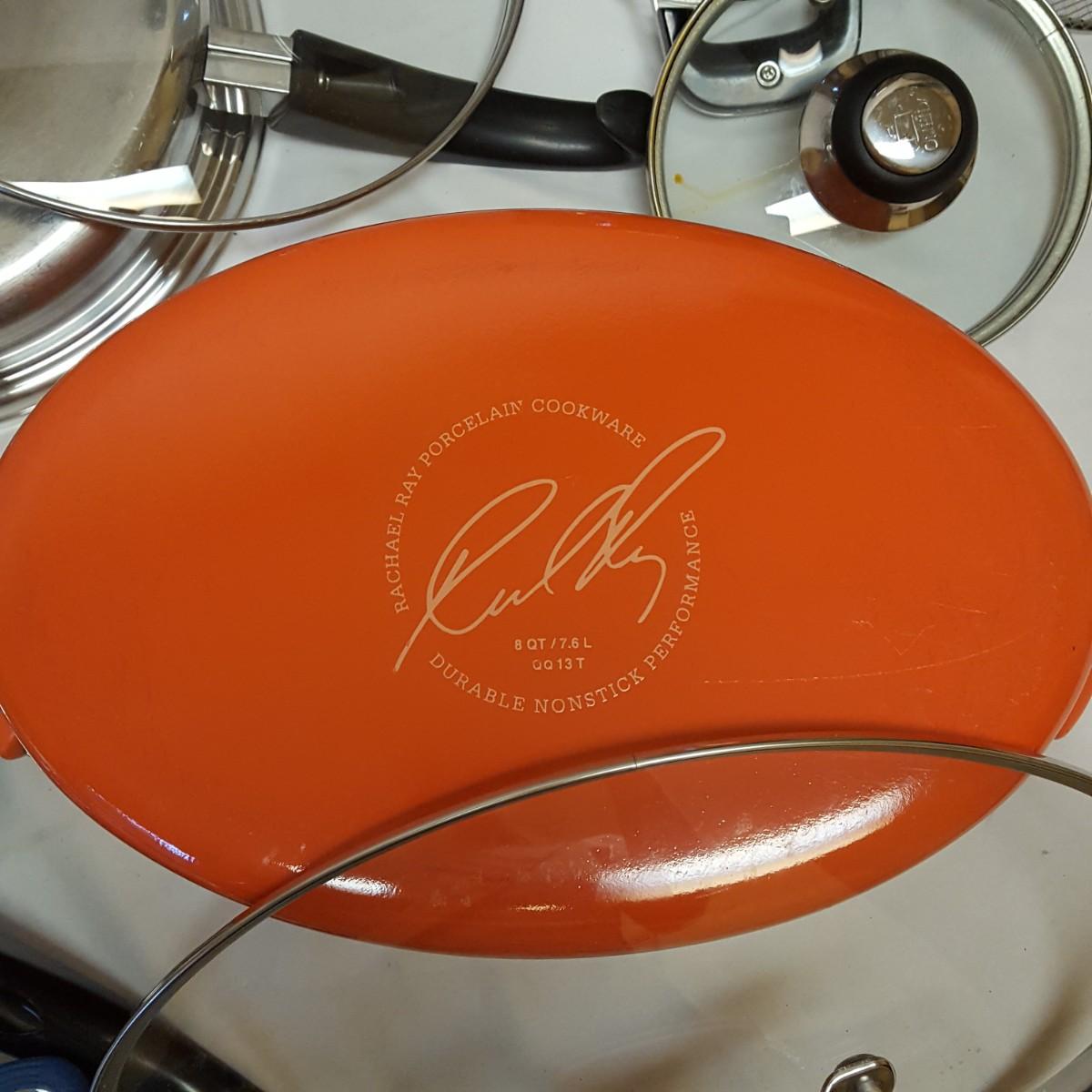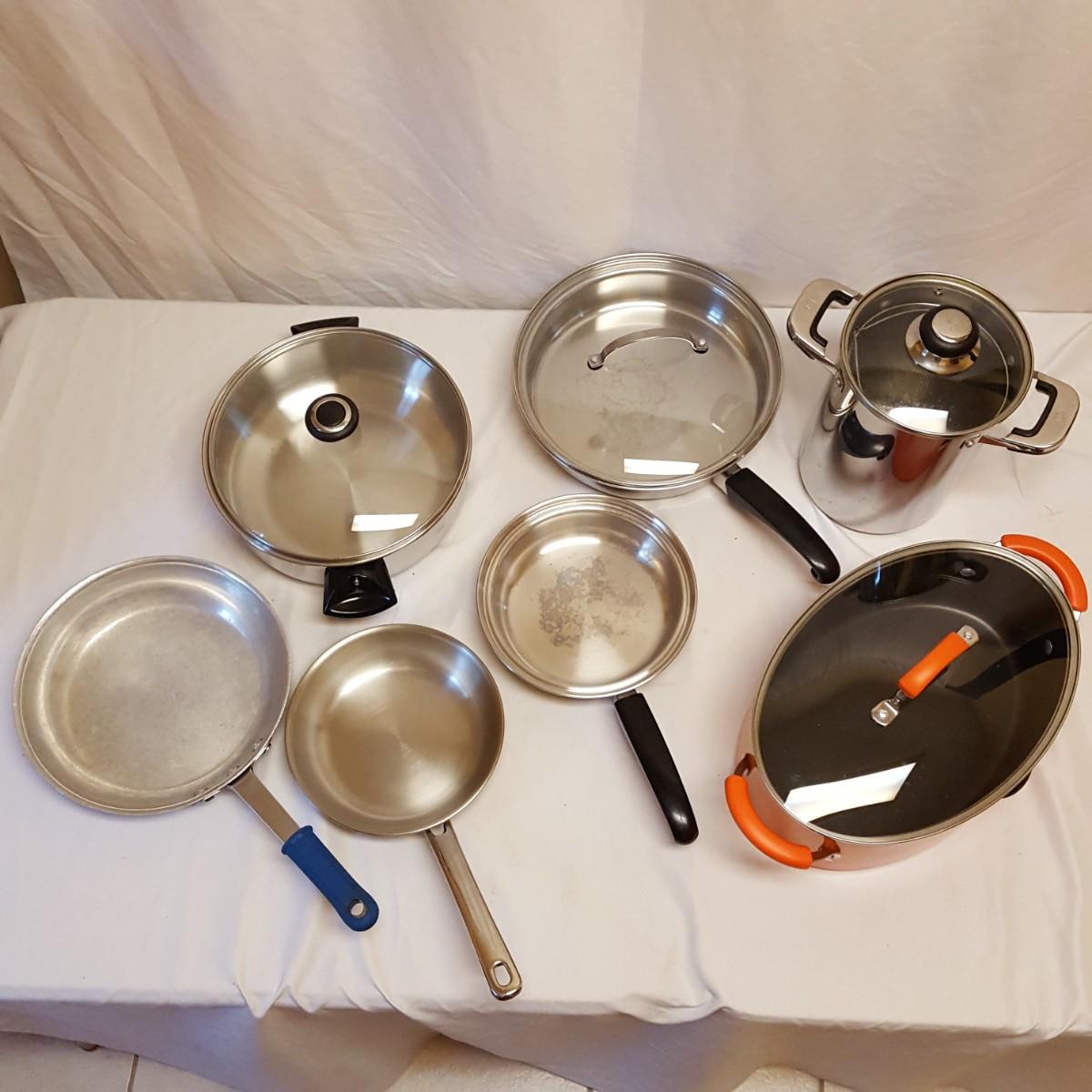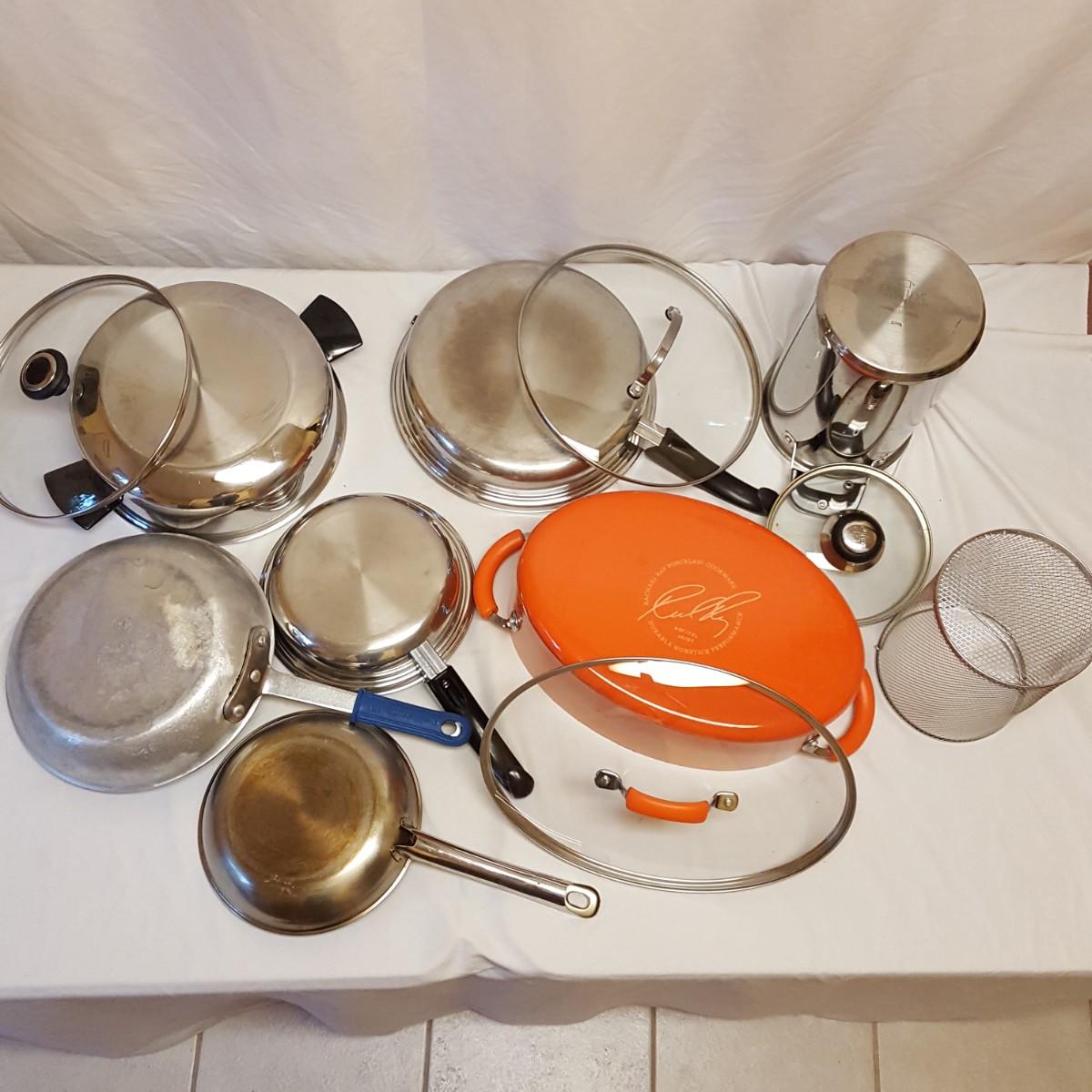 This is a variety of 7 pieces of pots and pans. There is an orange 8 quart Rachael Ray porcelain/nonstick pan that is just plain awesome! It even has a pour spout on the side! Next is an tall slender Oneida stainless steel pot with a strainer and lid. There are 4 skillets, an 8" without a lid, a 8.5" Regal brand without a lid, a 10" Lincoln Wear pan with a blue grip so no burning your hand for you! Finally, a no name sauce pan measuring 11"x4". This is a perfect pan for your sauces!