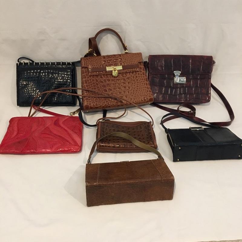 This gorgeous assortment includes a total of seven purses in a variety of colors and styles. Brands include Bellido, Due Fratelli and Furla, the others are not marked. Be ready for any occasion with this stylish melange of purses. Largest purse measures 4” x 11.25” x 9.5”.