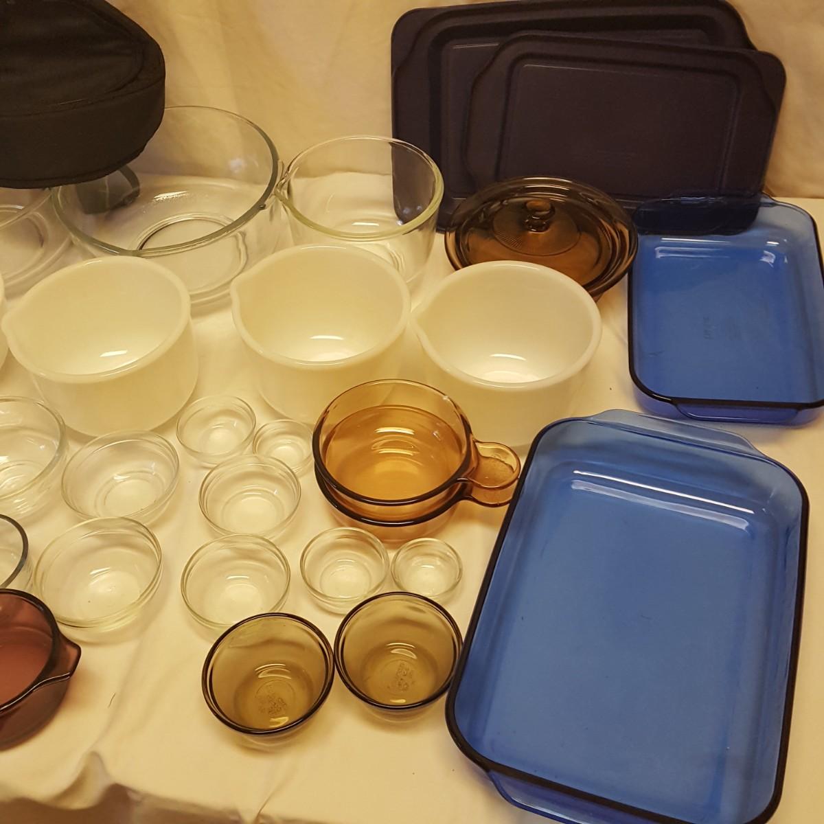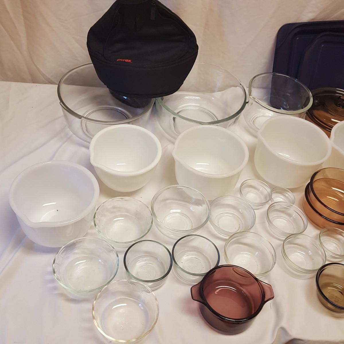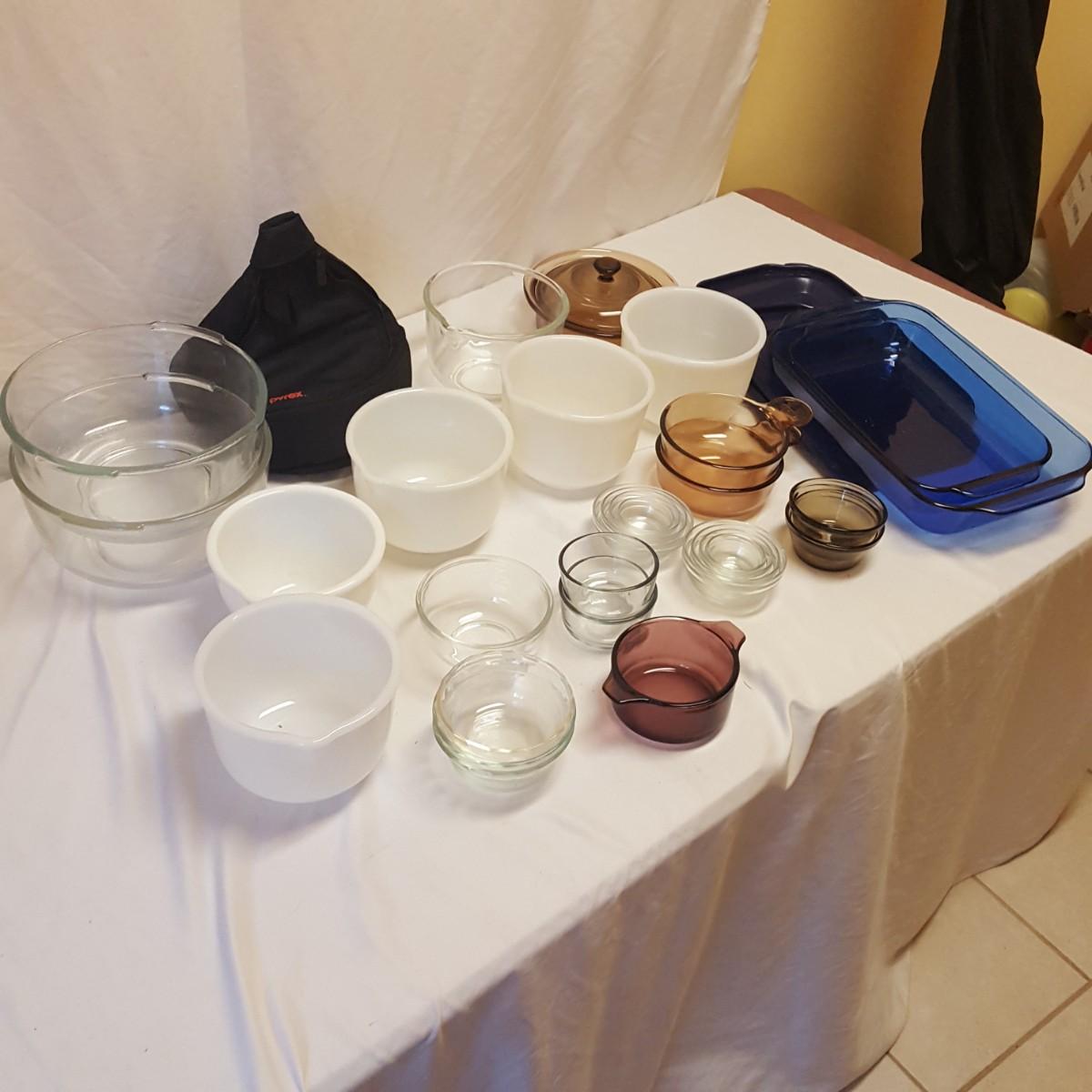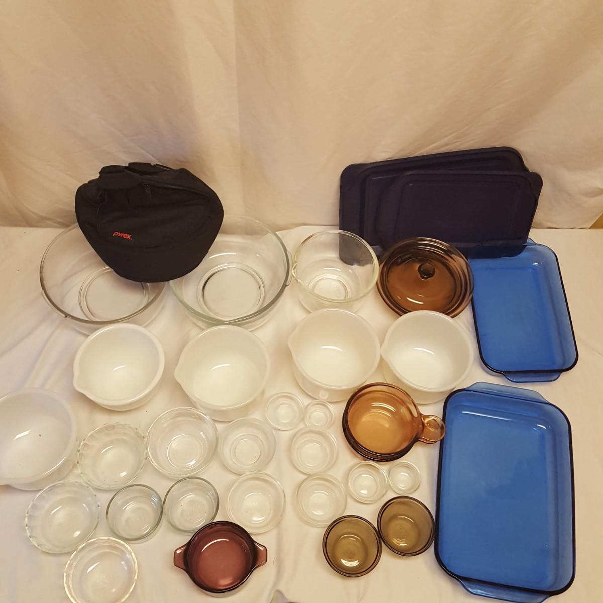 That's a lot of glassware! Everyone loves Pyrex! Close to 30 pieces of kitchen glassware waiting for your bid! This lot is perfect for baking your favorite desserts or casseroles. The two blue casserole dishes even come with snap on lids, ready to take your favorite dish to the party. The 2 sets of small clear stacking bowls are perfect for measuring your spices ahead of time. The 5 white spouted bowls can pour that cake batter perfectly! There is an extra black Pyrex bag that can hold that hot plate.
