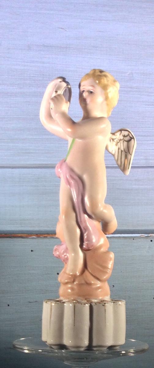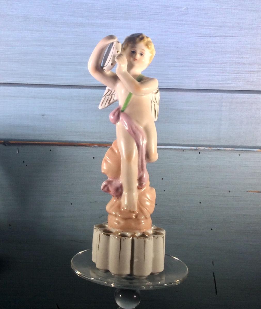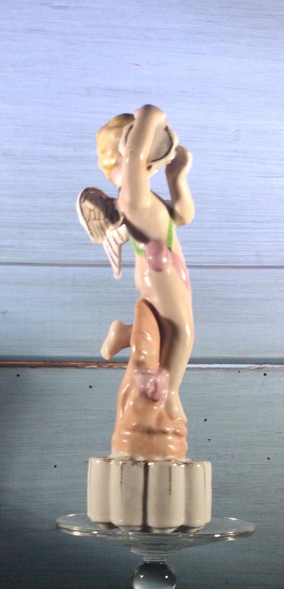 Precious cherub playing a tambourine, flower frog, In excellent shape.