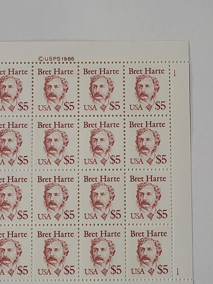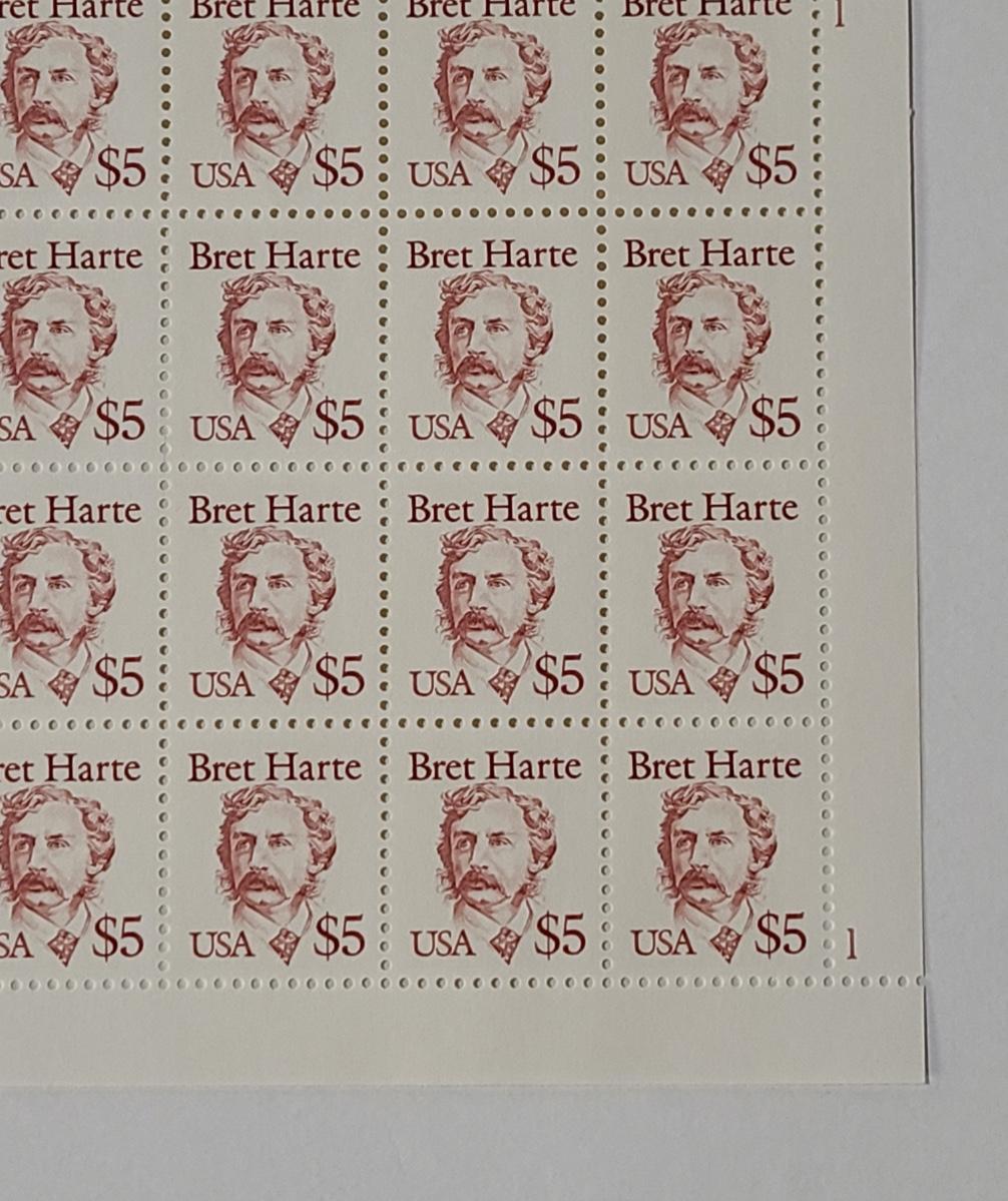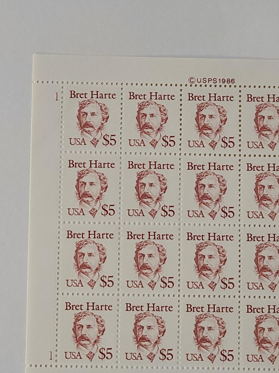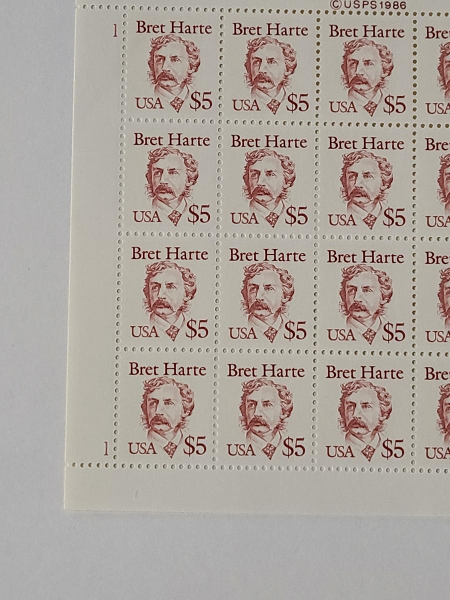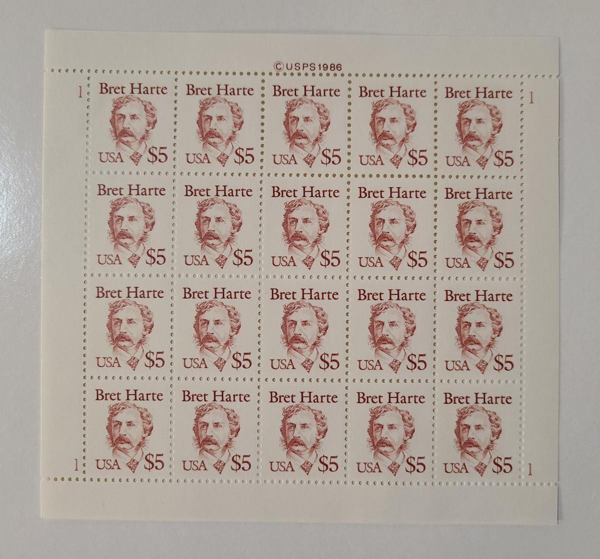 Lot 36: 1986 Bret Harte $5.00 Stamps Sheet. Retail $100.00