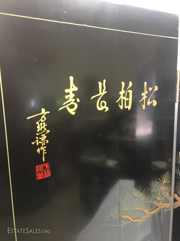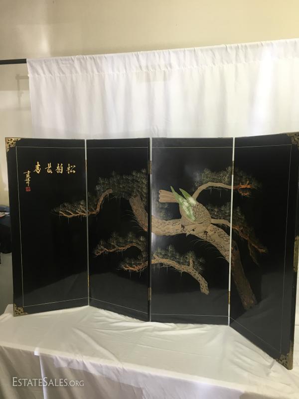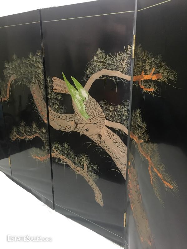 Brass detail edging and hinges. Bush with painted bird on branch. Each panel measures 36" x 14.5" and screen folds accordion style. This lot is available for shipping or local pick up in Waynesville, NC.