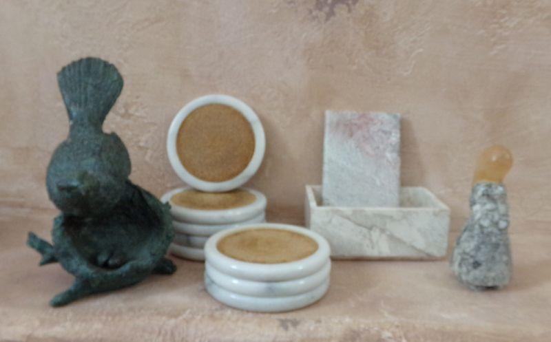 BRONZE BIRD, MARBLE BOX, COASTERS, AND GIRL,