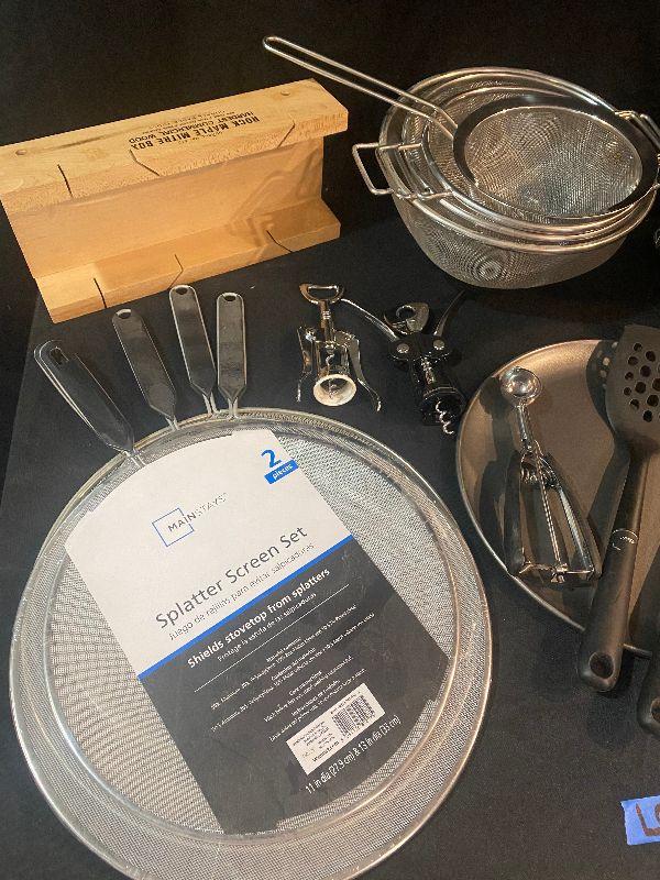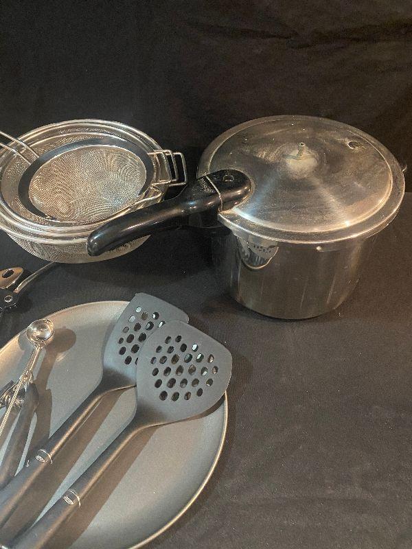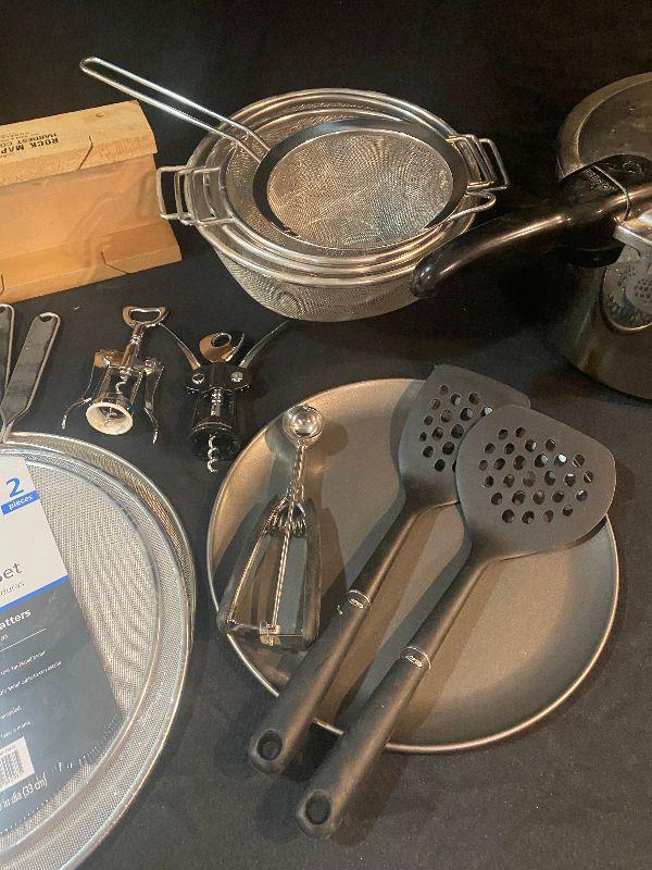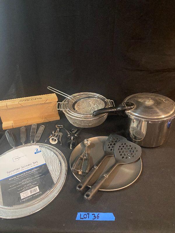 Round oven pan, kitchen utensils, Sherbert scooper, splatter screens, wood knife holder, wine openers, strainers and a Presto pressure cooker.