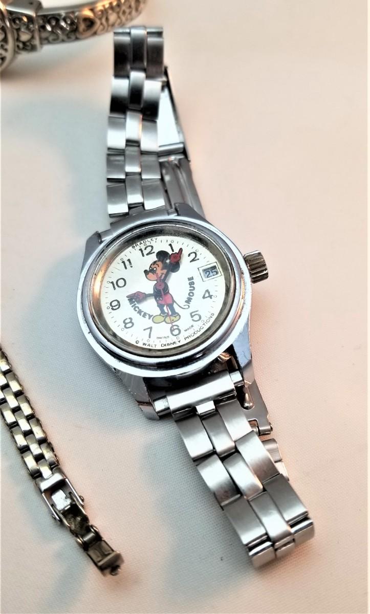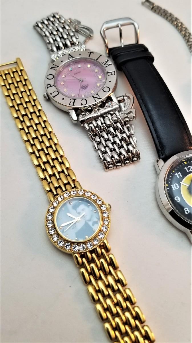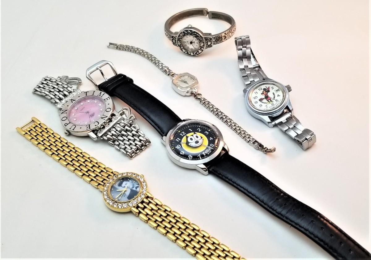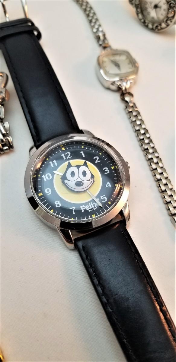 You get all you see here - Elvis Fashion watch, Vintage Walt Disney Productions Mickey Mouse (running), 14kt gold filled Omega, Fossil Limited edition Felix the Cat Watch, and a Cache Bracelet watch. The Disney is running - the others need batteries.