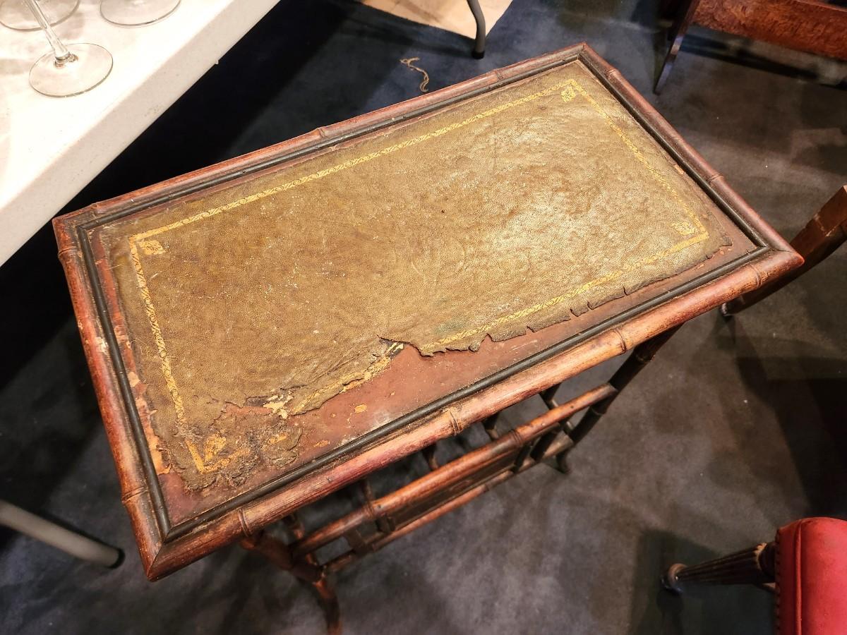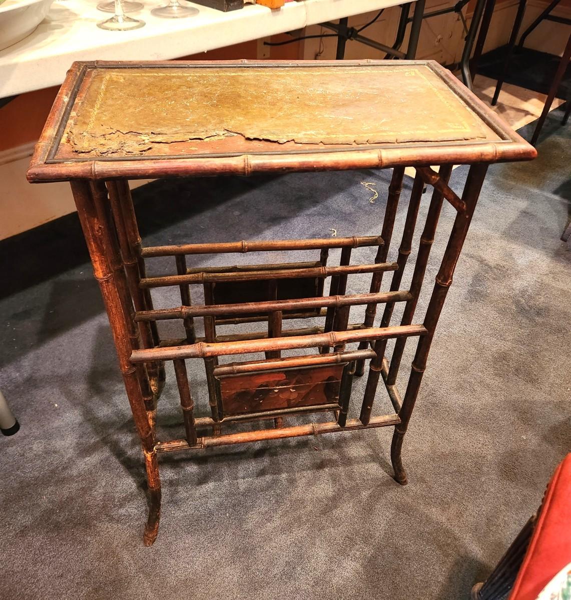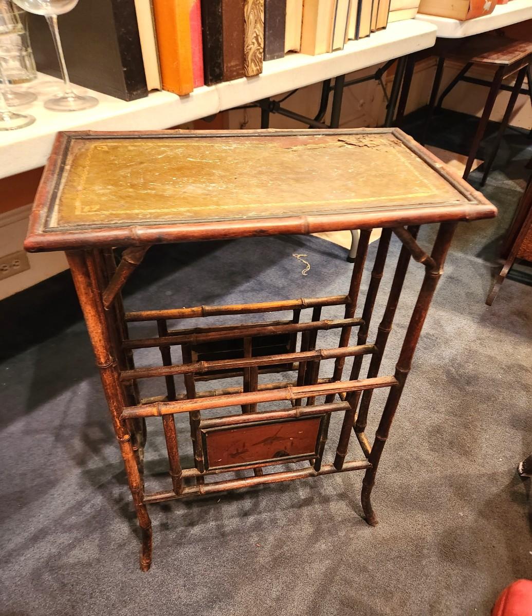 Antique Edwardian-era rattan/bamboo side table - English, ca. 1910. Leather on top should be replaced (there are places in town that will do it) - sturdy. Antique condition. 20" across. 11.5" deep, 28" tall. A classic that needs a little "love."
