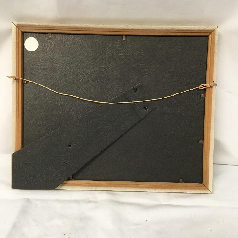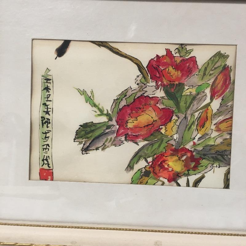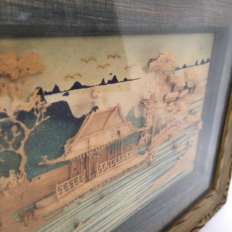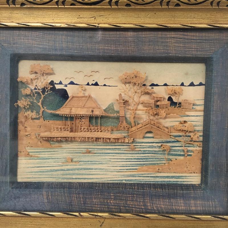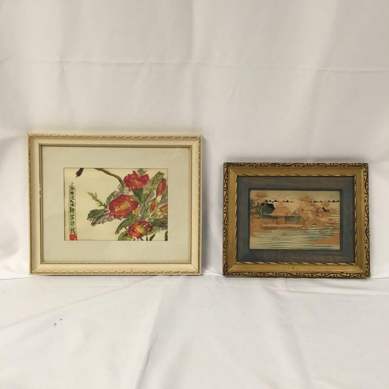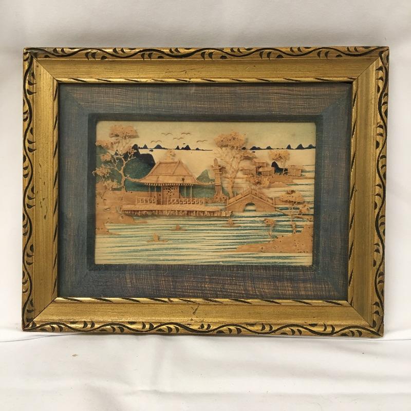 Included in this Asian inspired art is what appears to be a framed cork carving and a framed and matted watercolor. Largest frame measures 9” x 11”.