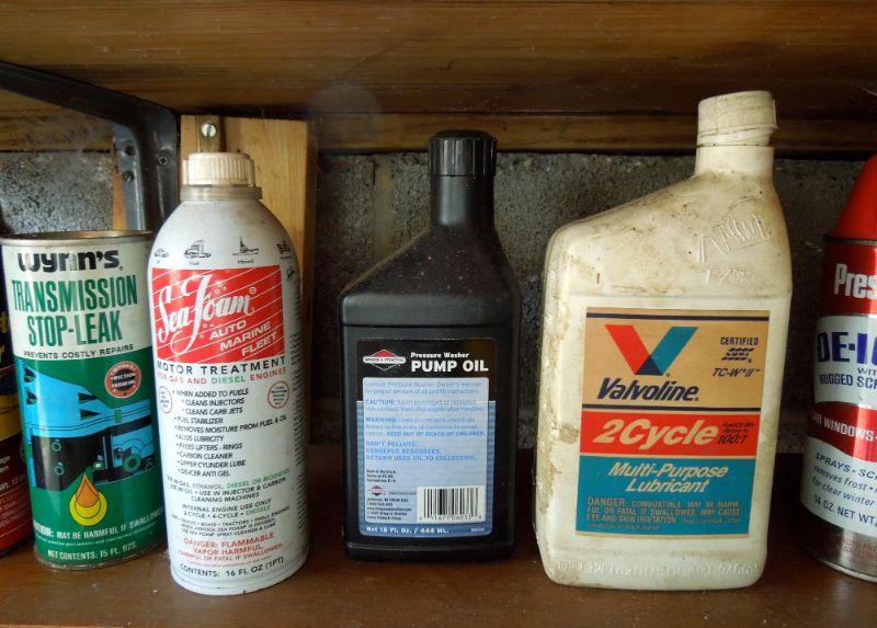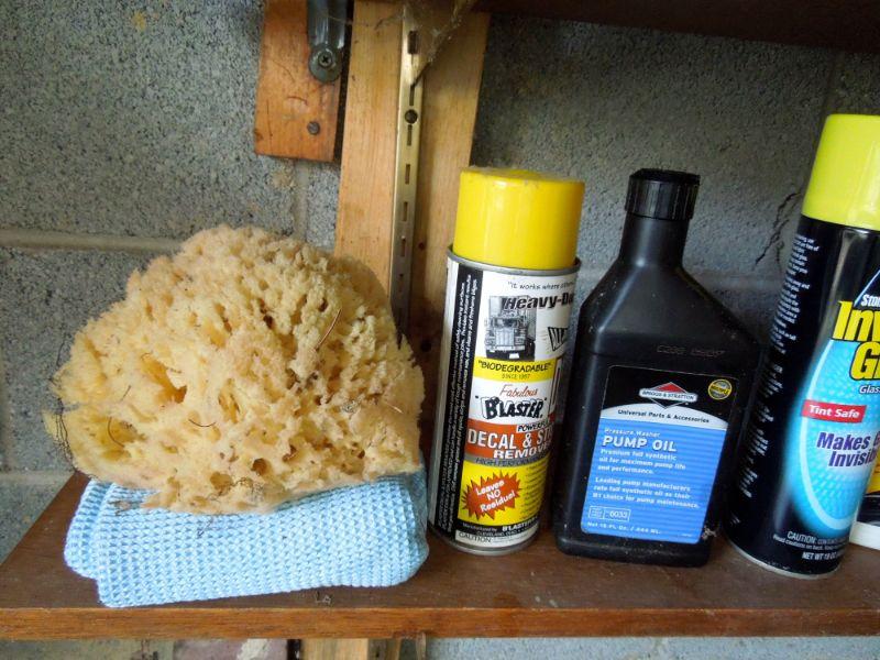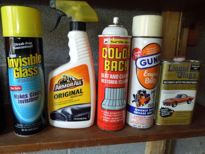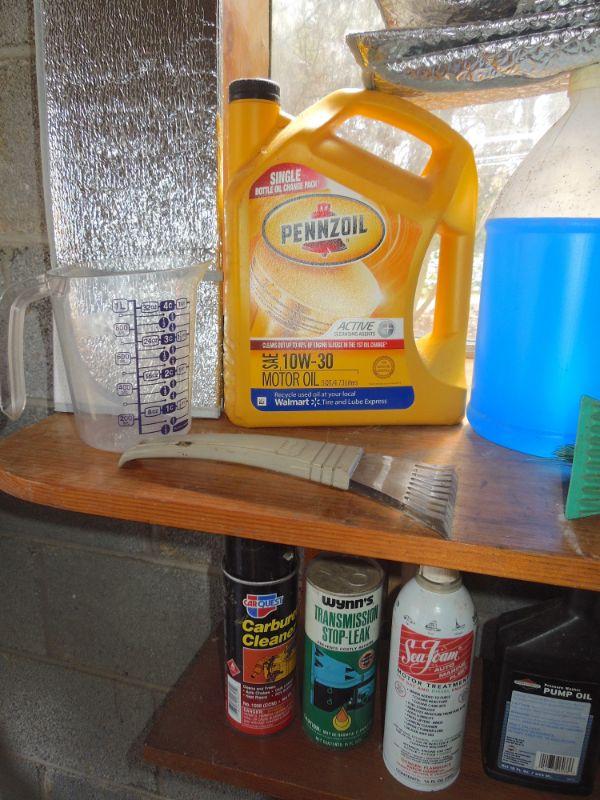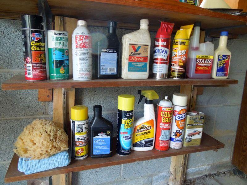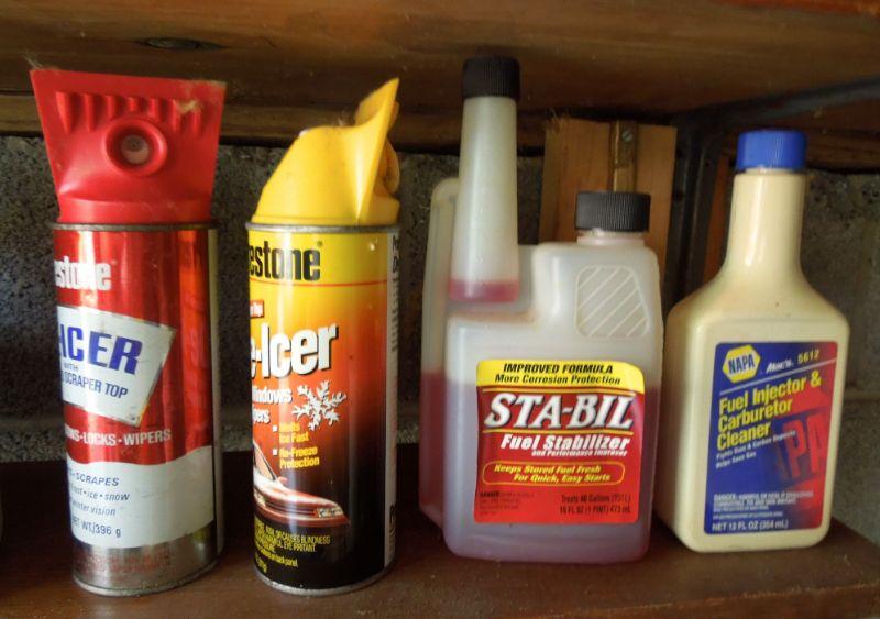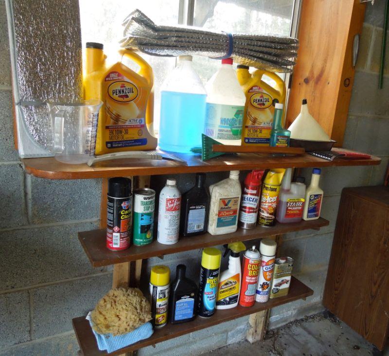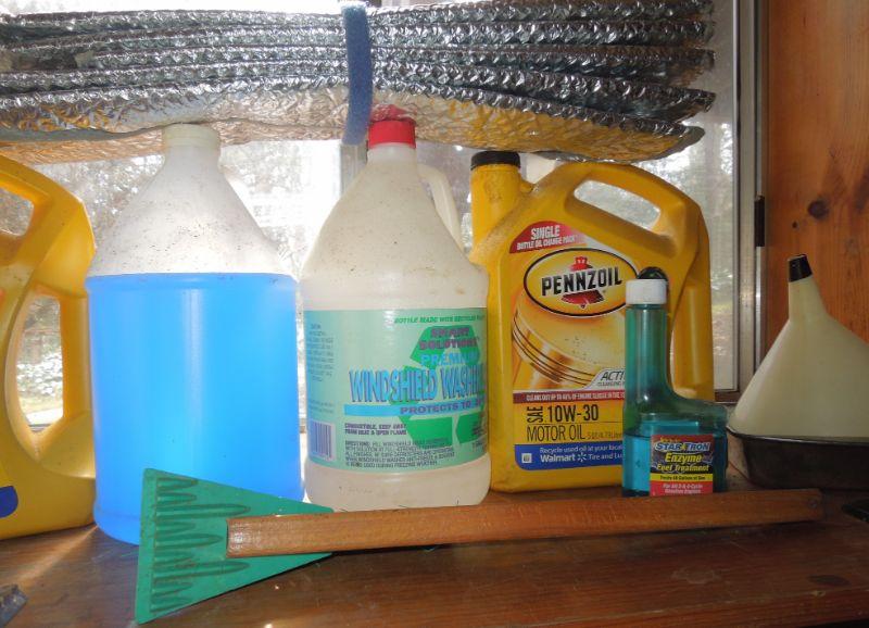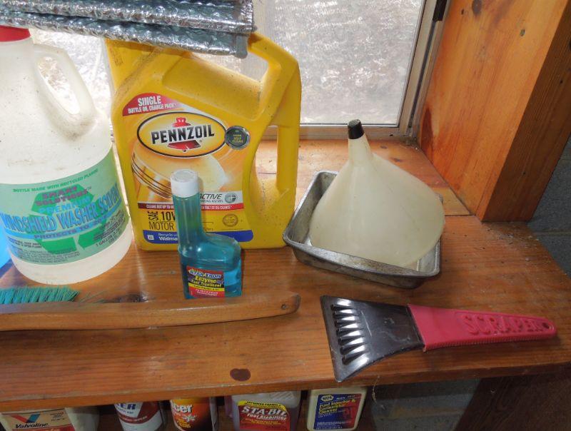 2 folding sunvisors screens; 2 windshield scrapers; a funnel and a measuring cup and drip pan; 8 qts 10w30 Pennzoil motor oil; a natural sponge and microtowel- plus all the other fluids in photos. All are at least 1/2 full. Many are full.