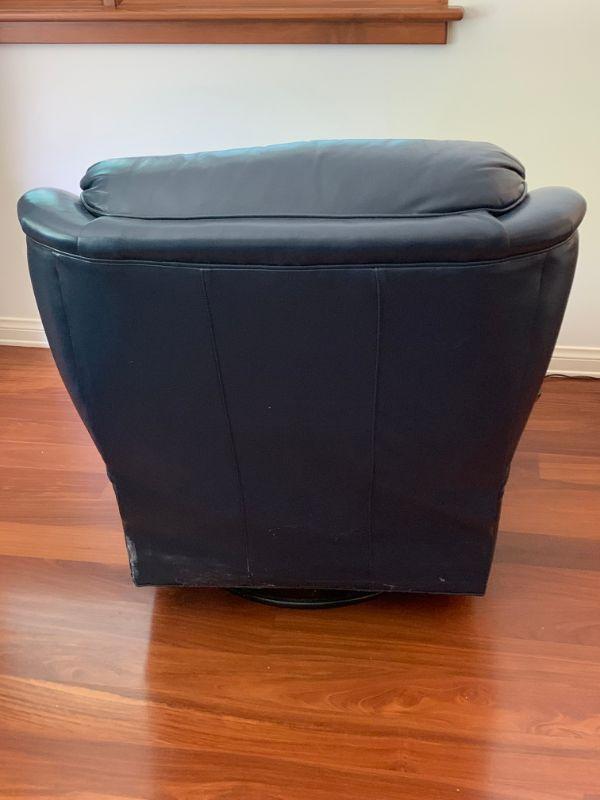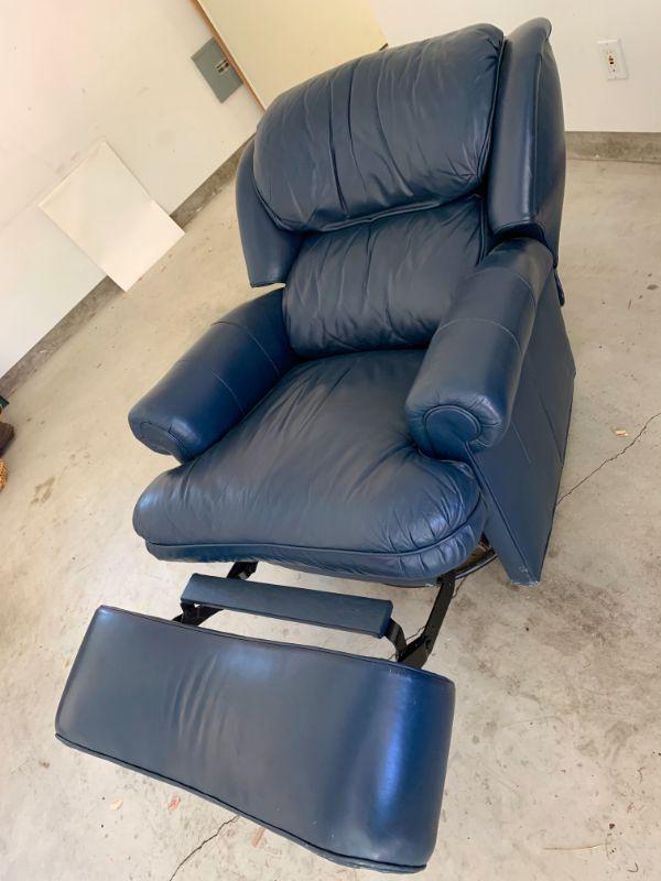 Puffy blue leather armchair. Recliner. Wide seat. Very comfortable. Leather is in good shape.