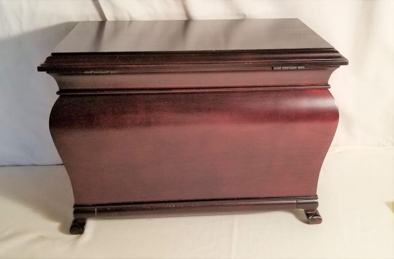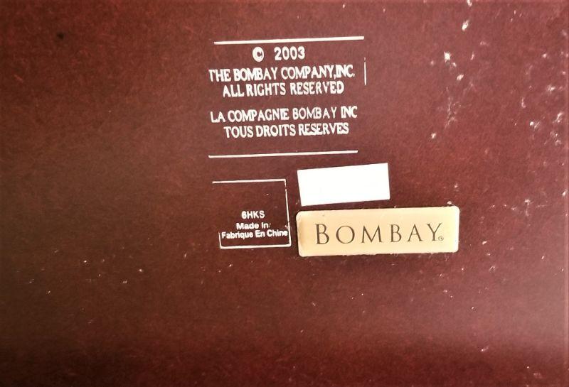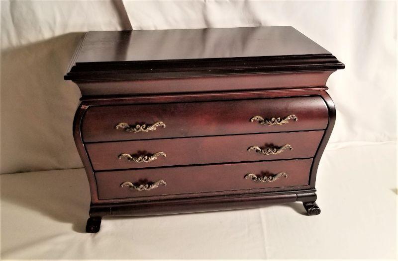 Nice Bombay Company jewelry box - top lifts up, plus three drawers. Measures 7" deep, 14.5" wide, and 10.5" tall. Note the little "hinky" at top left (see photo).