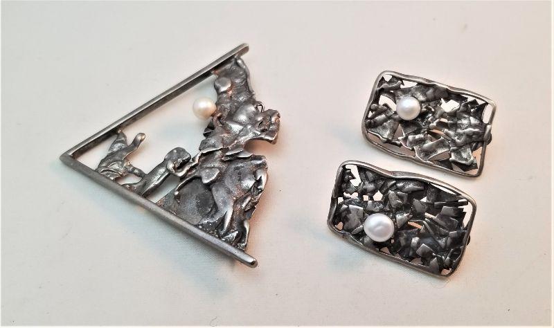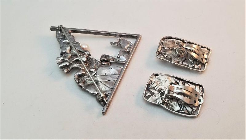 Nice Sterling (marked) set here - Artisan brooch with pearl accent (sterling) and a matching pair of clip earrings. Brooch measures 2.5" x 2.5" and earrings are 1.25" long. All in good condition.