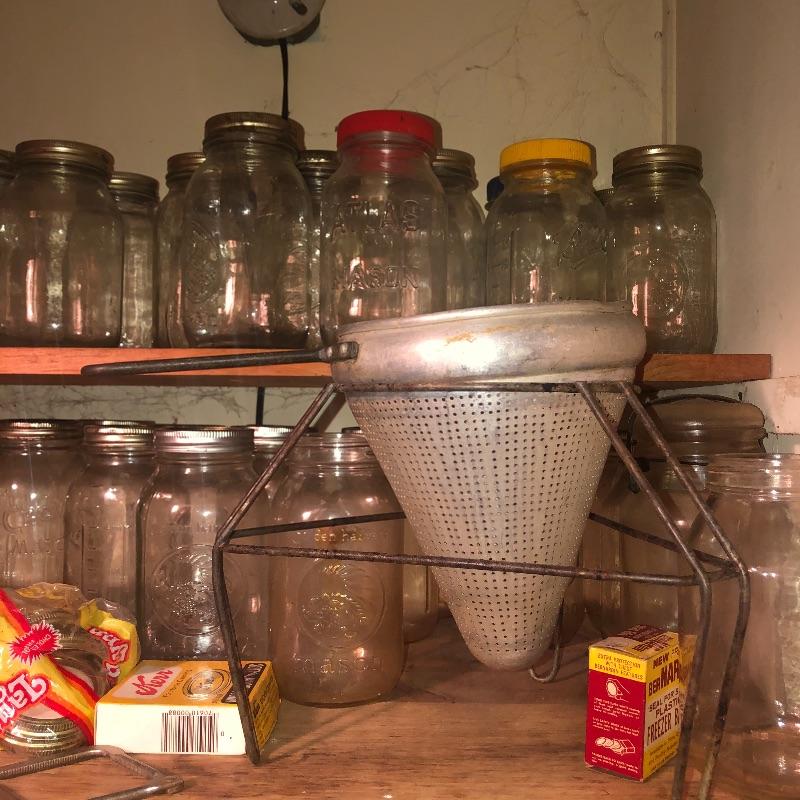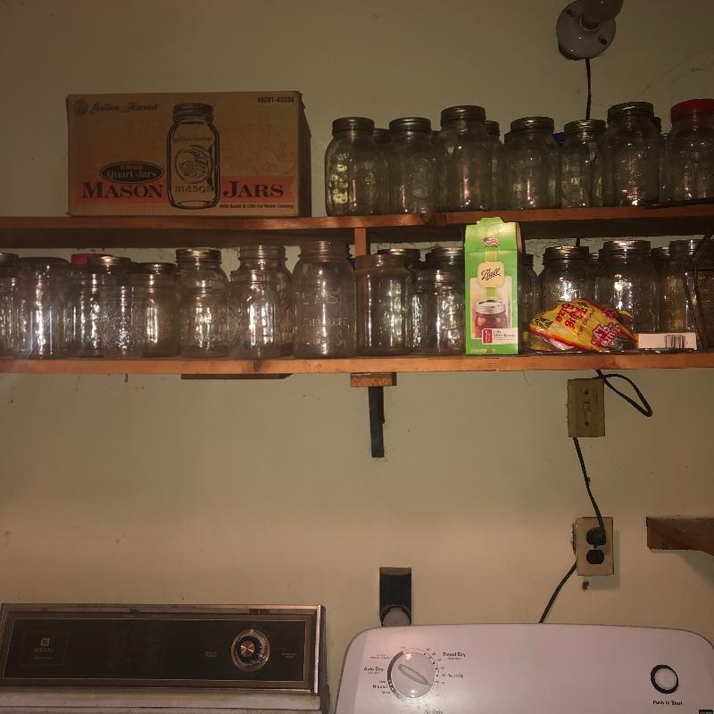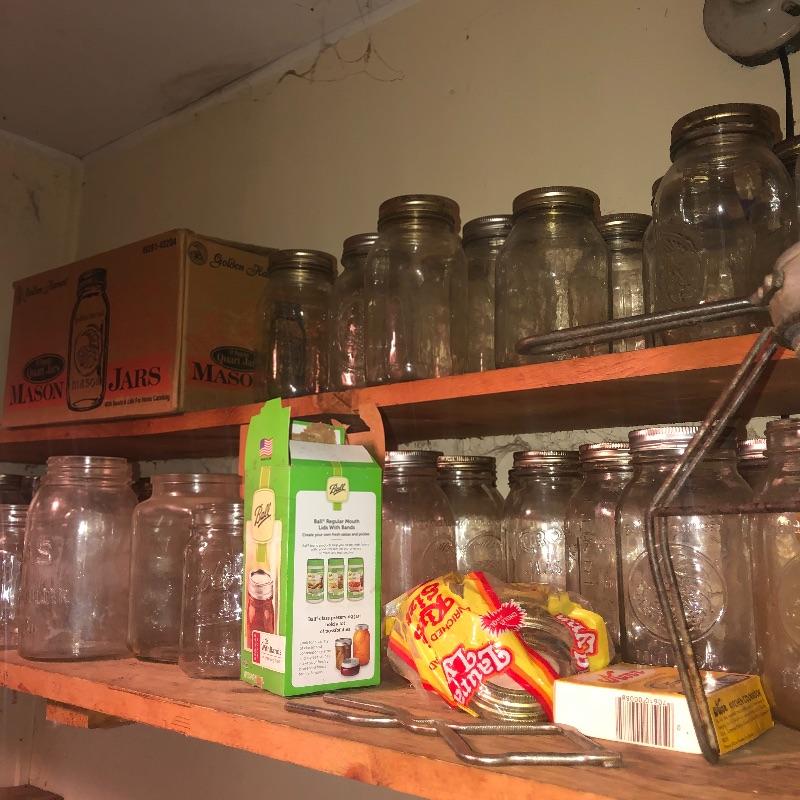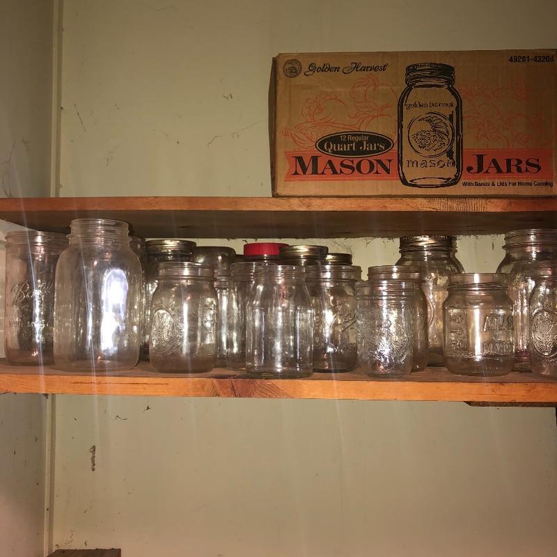Large selection of Ball and Golden Harvest mason jars and canning materials. Includes a canning sieve and various lids. All jars are clear.